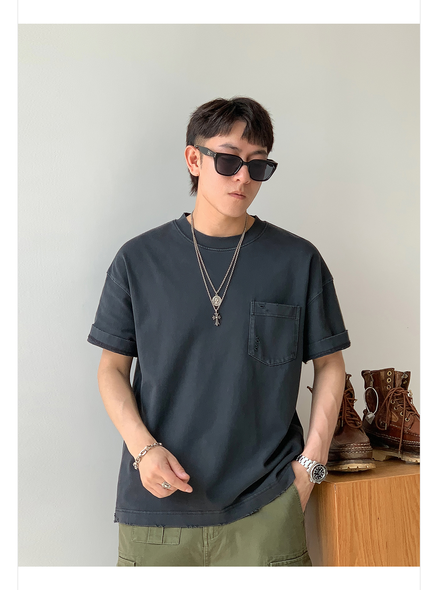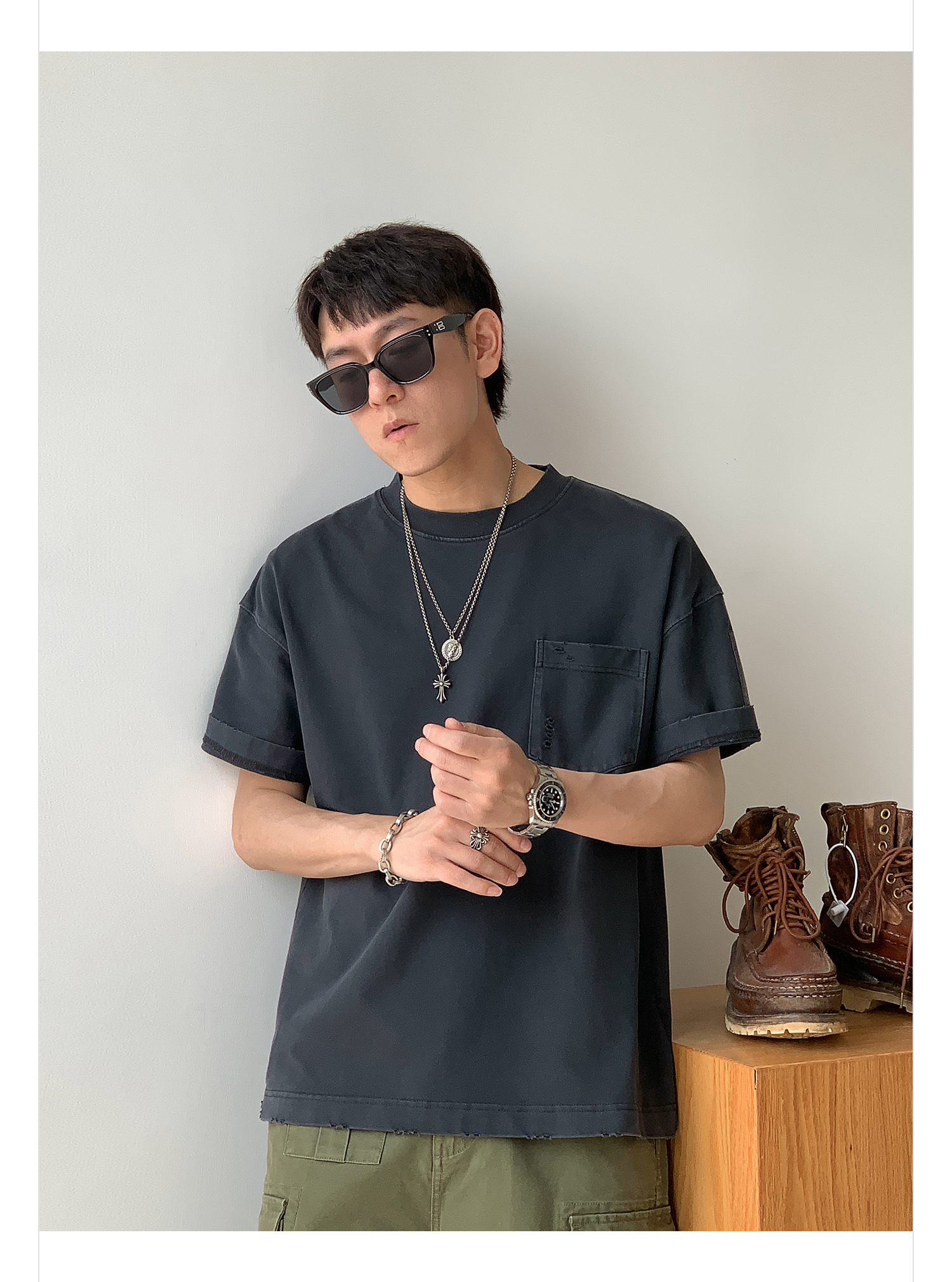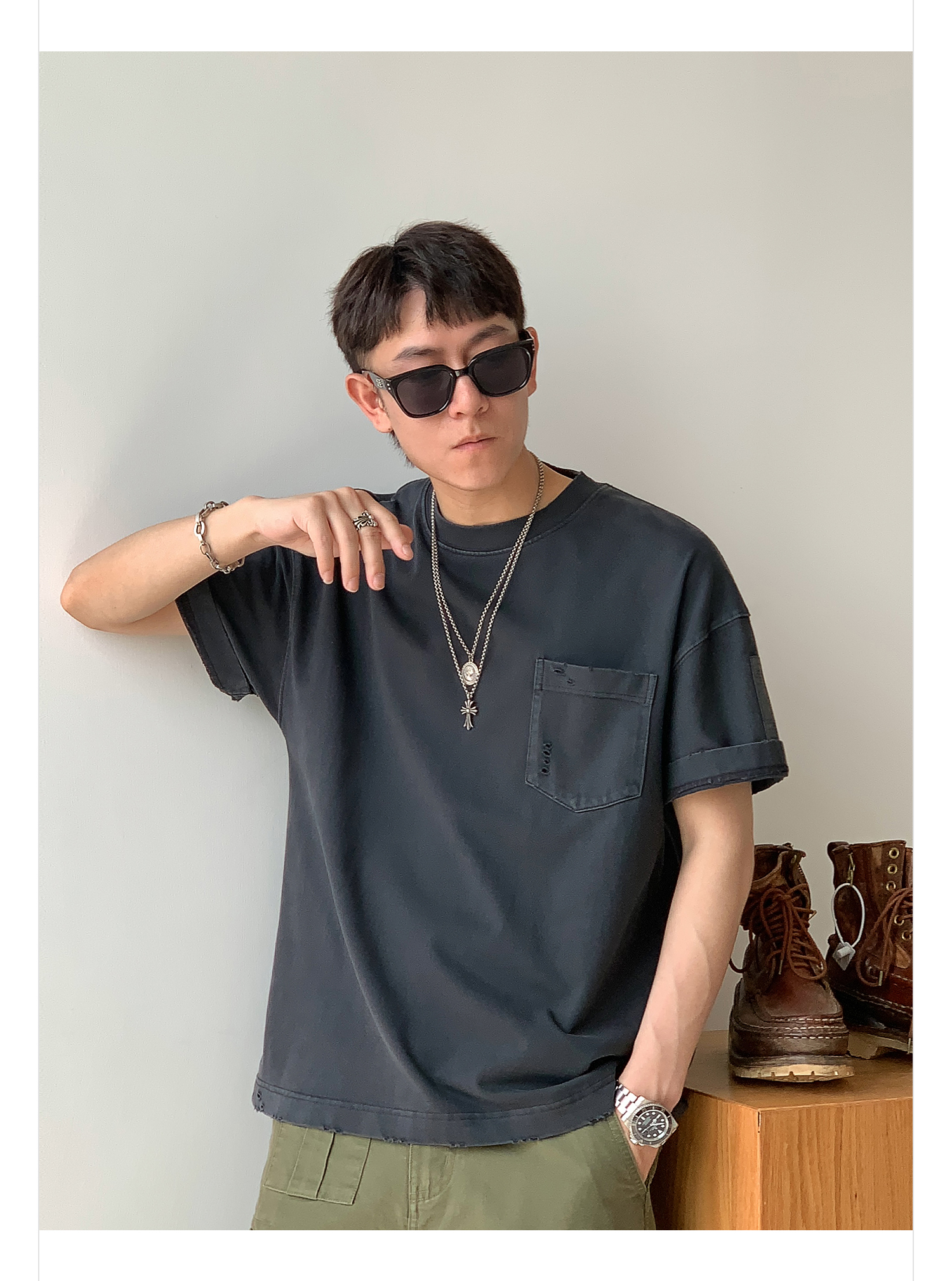 徐太浪复古磨边拼接口袋短袖T恤男夏季宽松休闲透气中袖圆领上衣