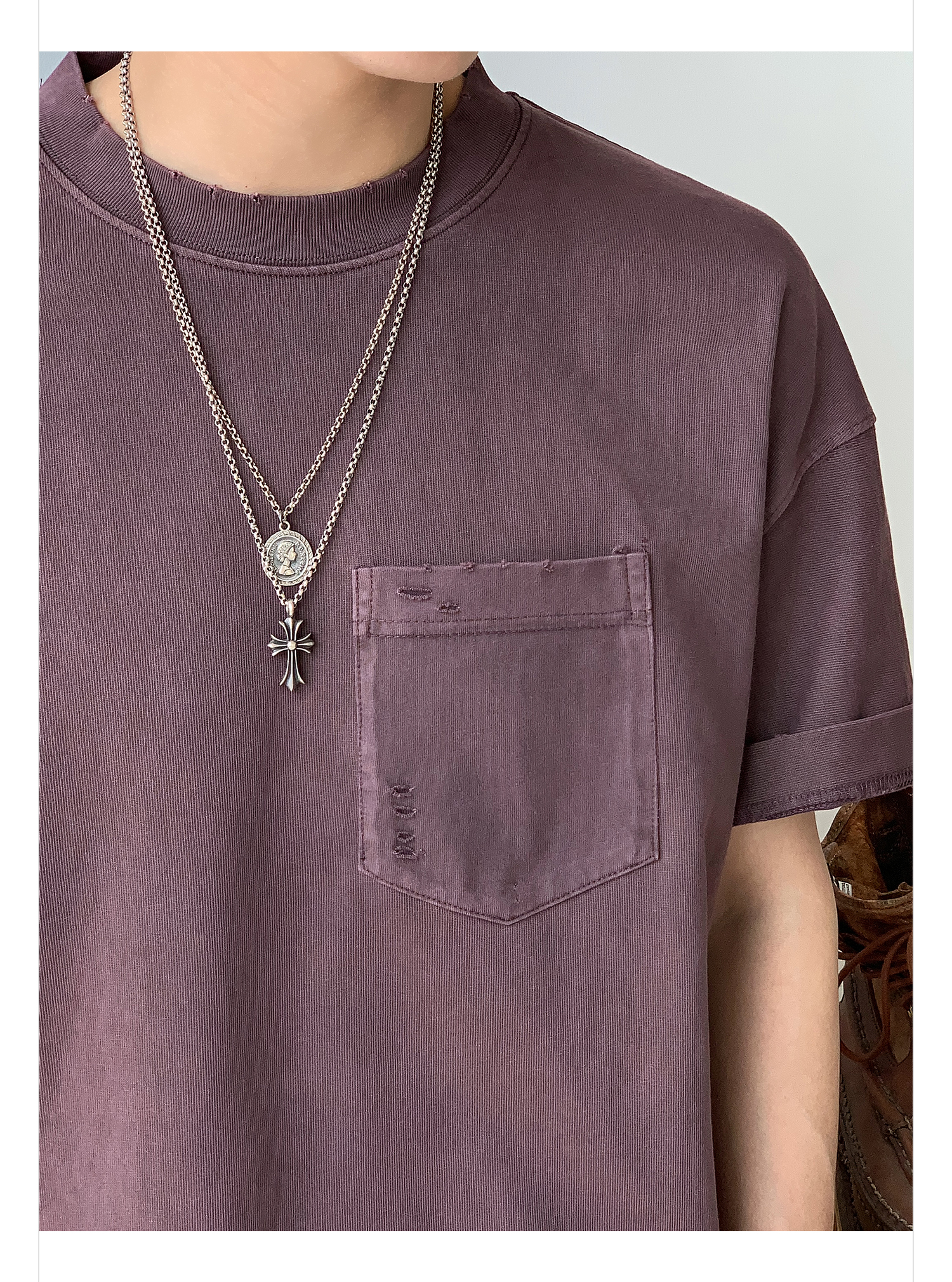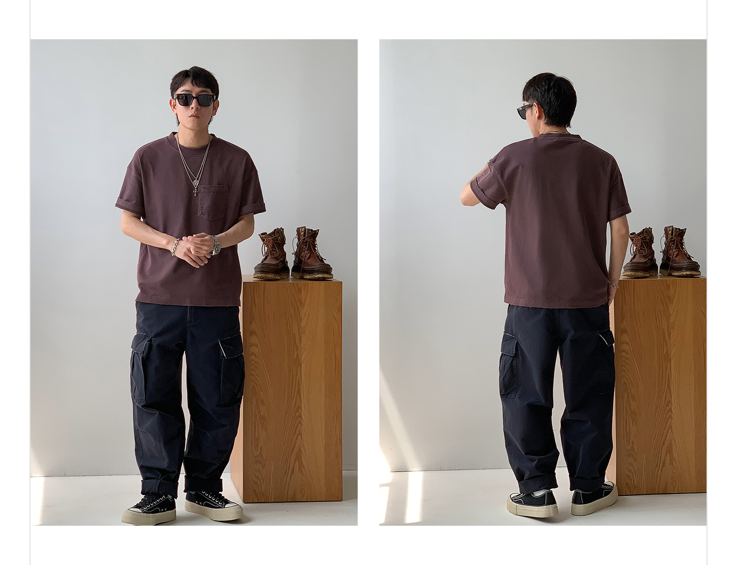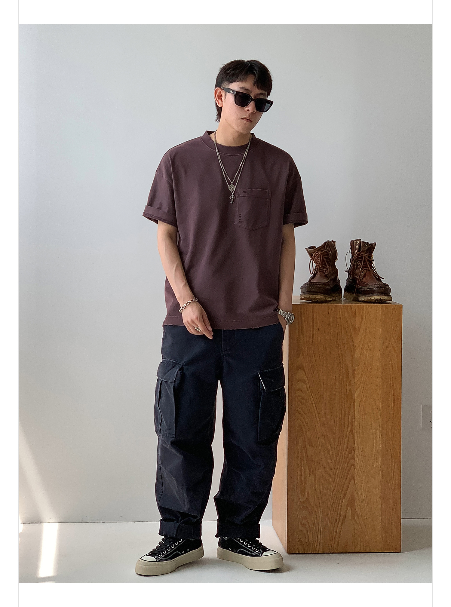 徐太浪复古磨边拼接口袋短袖T恤男夏季宽松休闲透气中袖圆领上衣