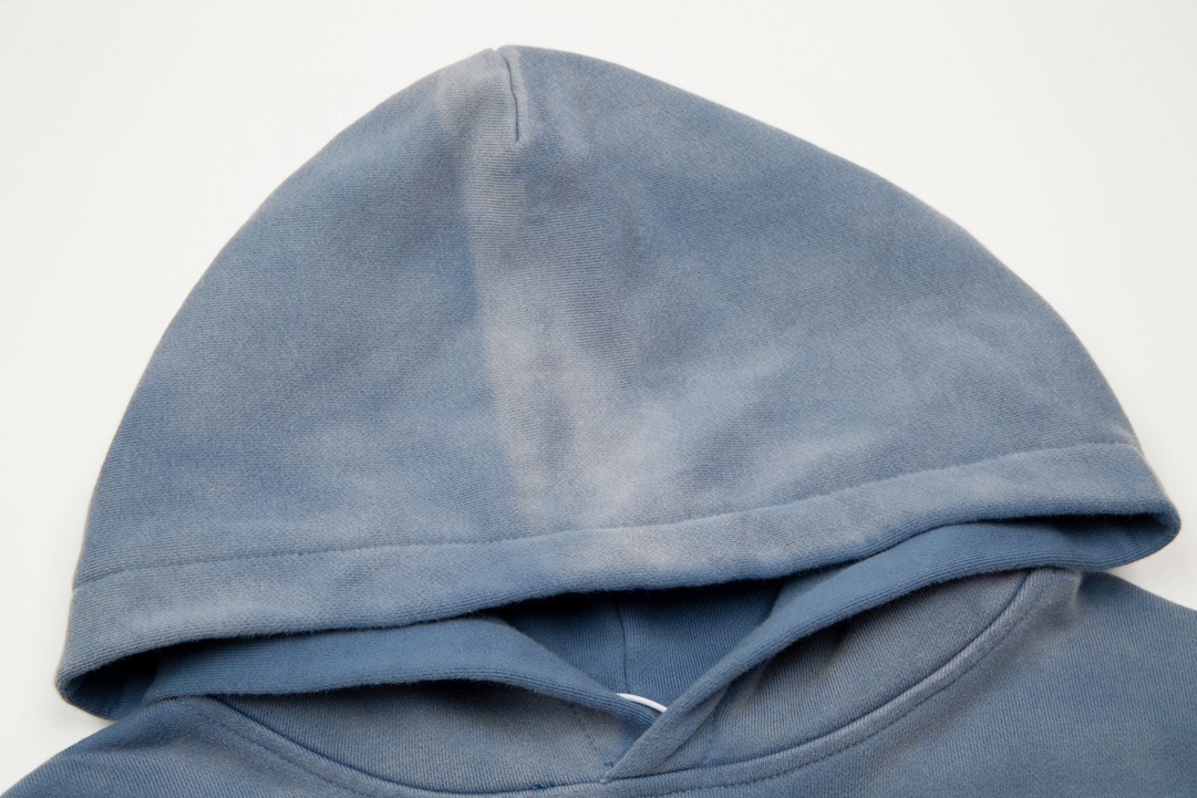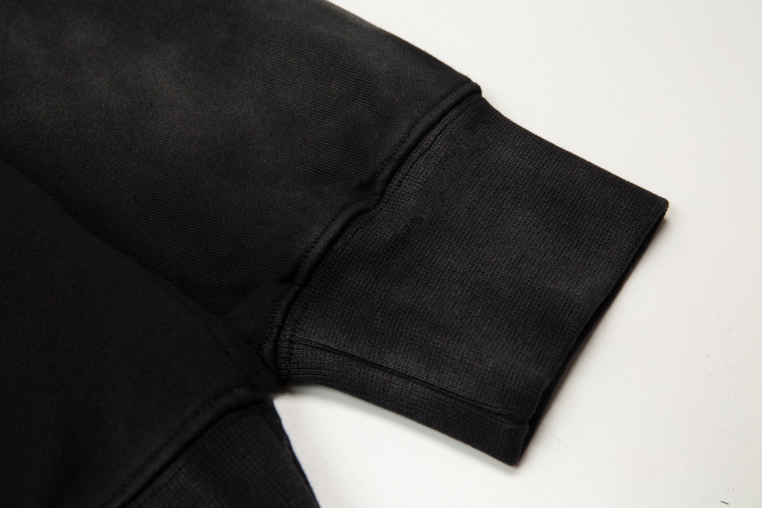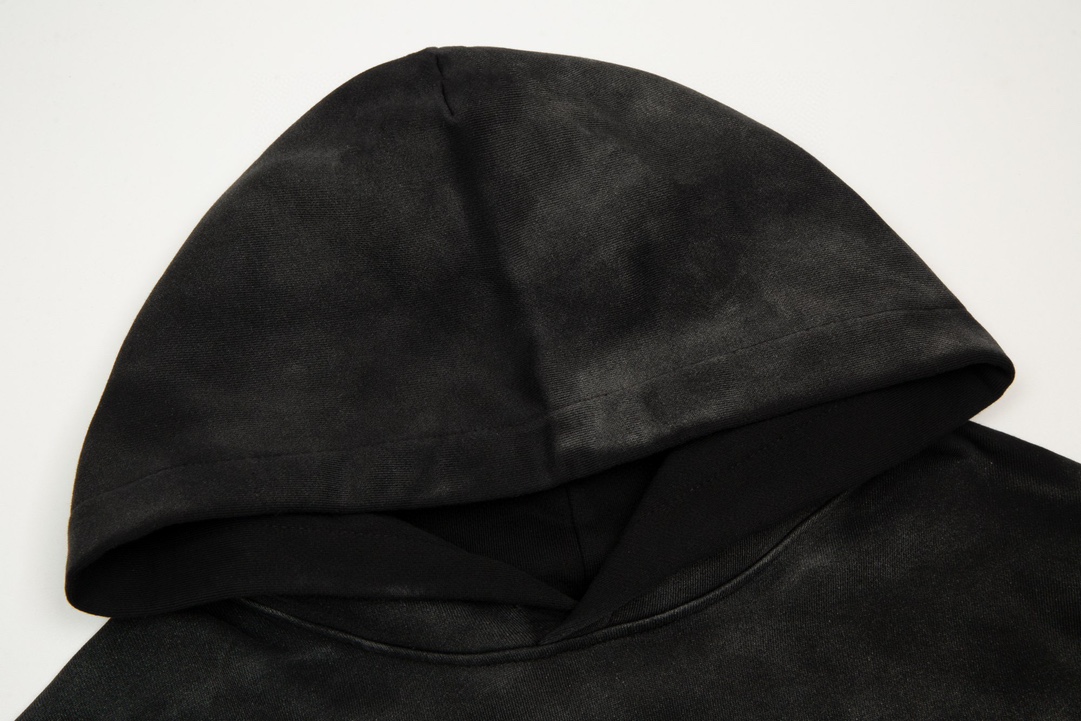 纯棉柔软卫衣面料,对色定染面料,前后logo刺绣,高密度绣花,手工喷旧渐变工艺,定染纯棉面料,OS版型,三标齐全,男女同款。
