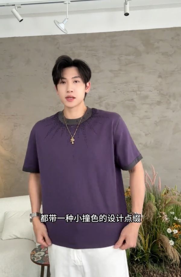 T3127夏季高级感新款撞色领口烫钻圆领短袖T恤重磅复古宽松百搭上衣