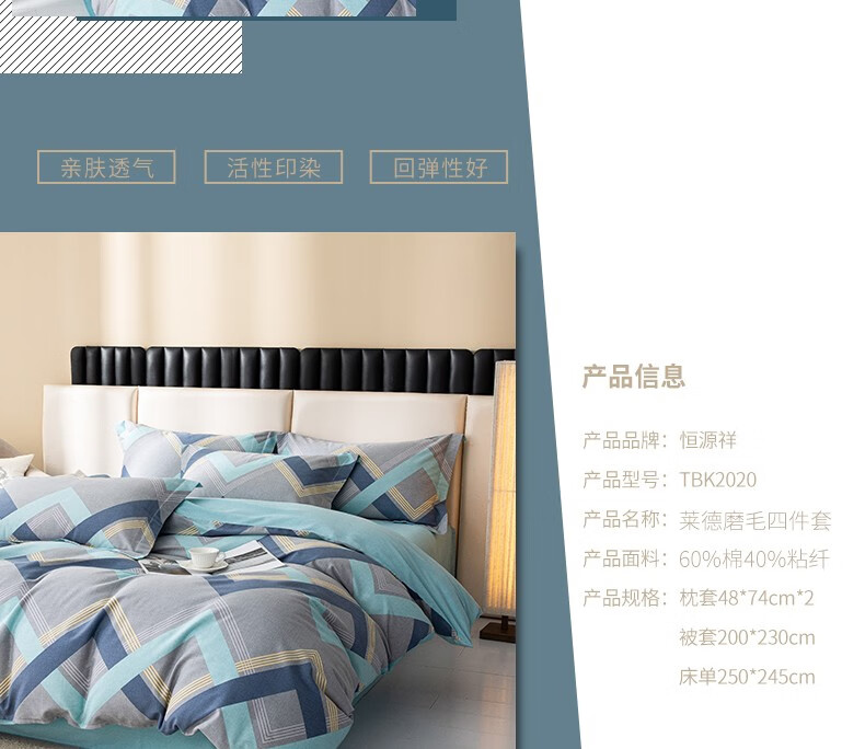 恒源祥礼业TBK2020莱德磨毛四件套加厚秋冬双人套件 1.5m(被套:200*230cm)