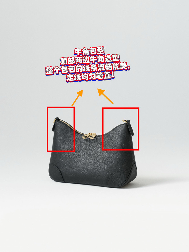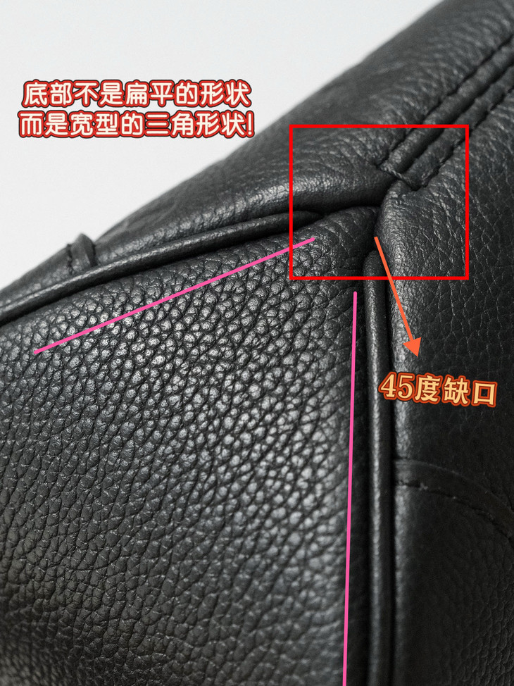 牛角包型,顶部两边牛角造型,底部不是扁平的形状,而是宽型的三角形状!单单放着就非常立体挺括有型,整个包包的线条流畅优美,走线均匀笔直~