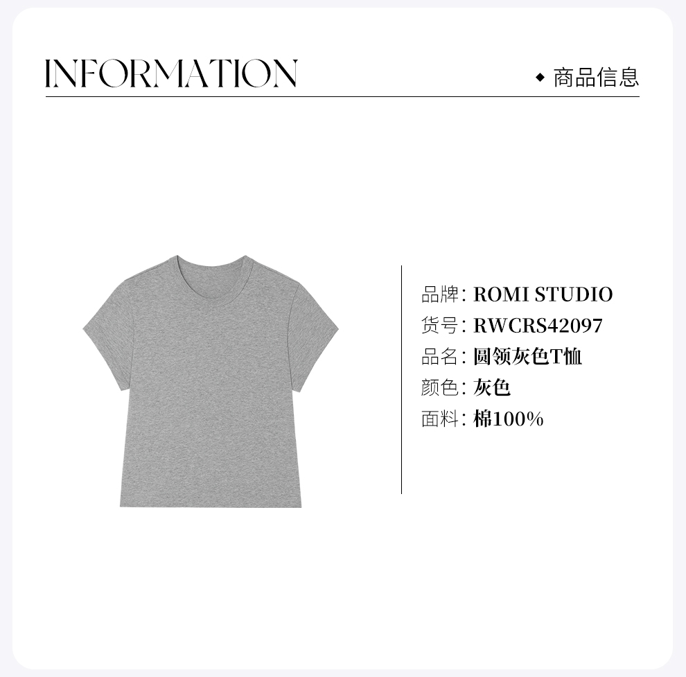 ROMI STUDIO夏季新品 极简花纱灰色纯棉圆领短袖T恤 RWCRS42097