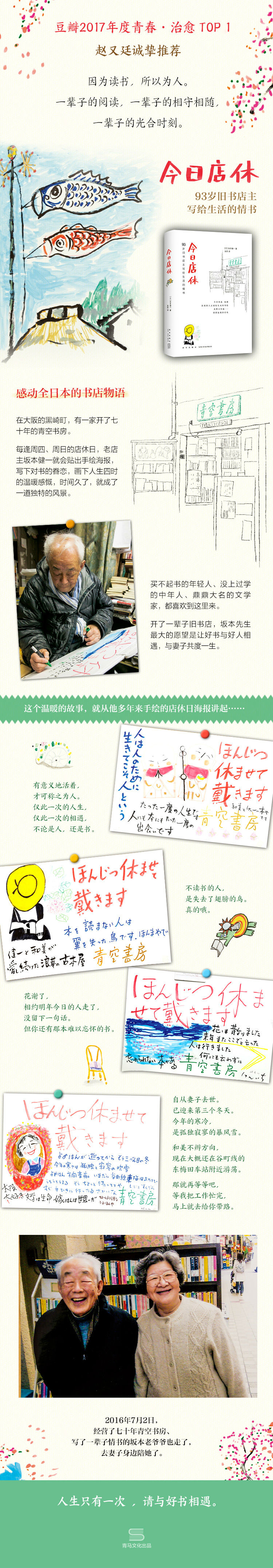 在大阪的黑崎町,有一家开了七十年的青空书房。每逢周四、周日的店休日,老店主坂本健一就会贴出手绘海报,写下对书的眷恋,画下人生四时的温暖感慨,时间久了,就成了一道独特的风景。买不起书的年轻人、没上过学的中年人、鼎鼎大名的文学家,都喜欢到这里来。开了一辈子旧书店,坂本先生的愿望就是让好书与好人相遇,与妻子共度一生。
