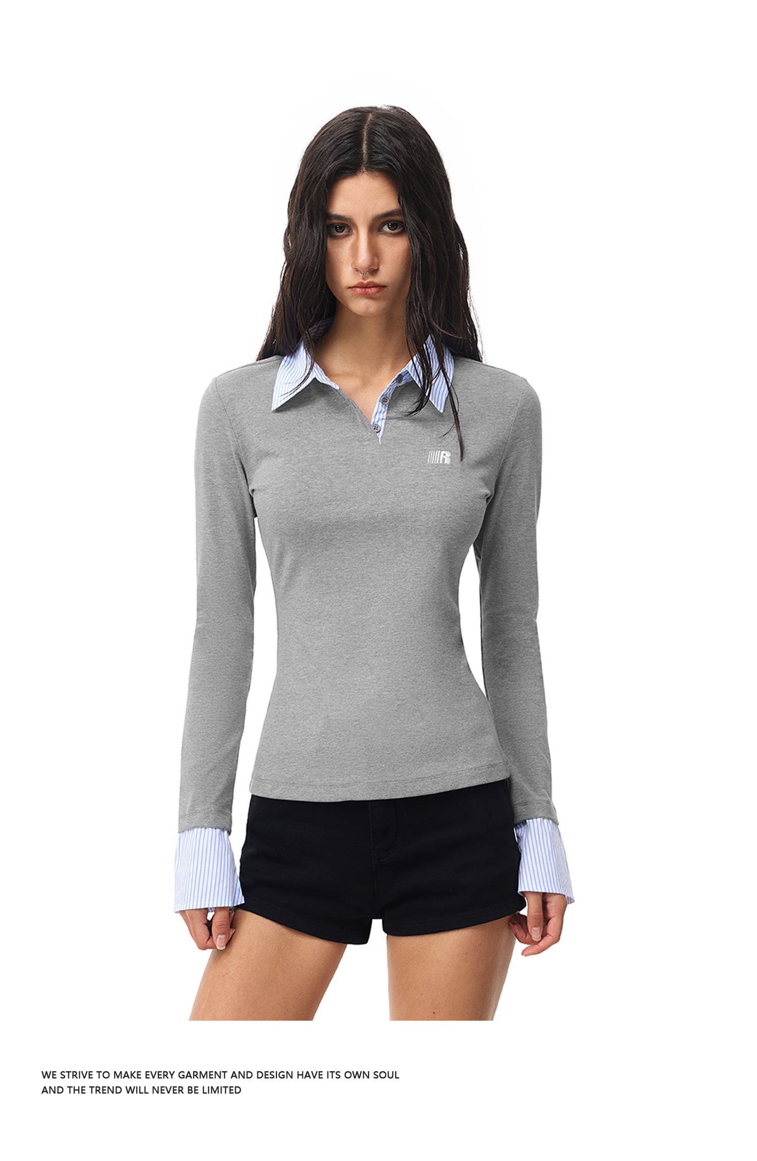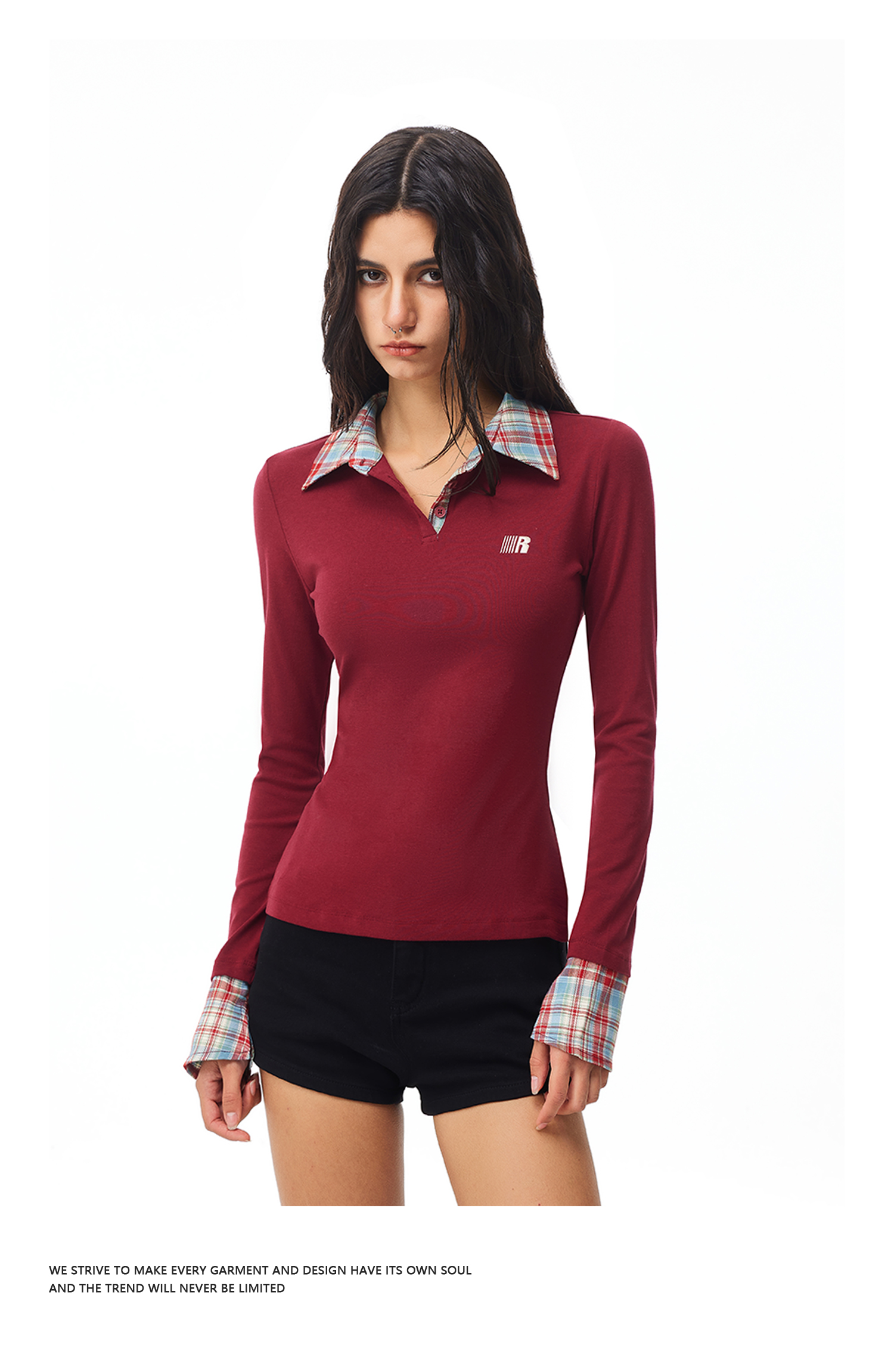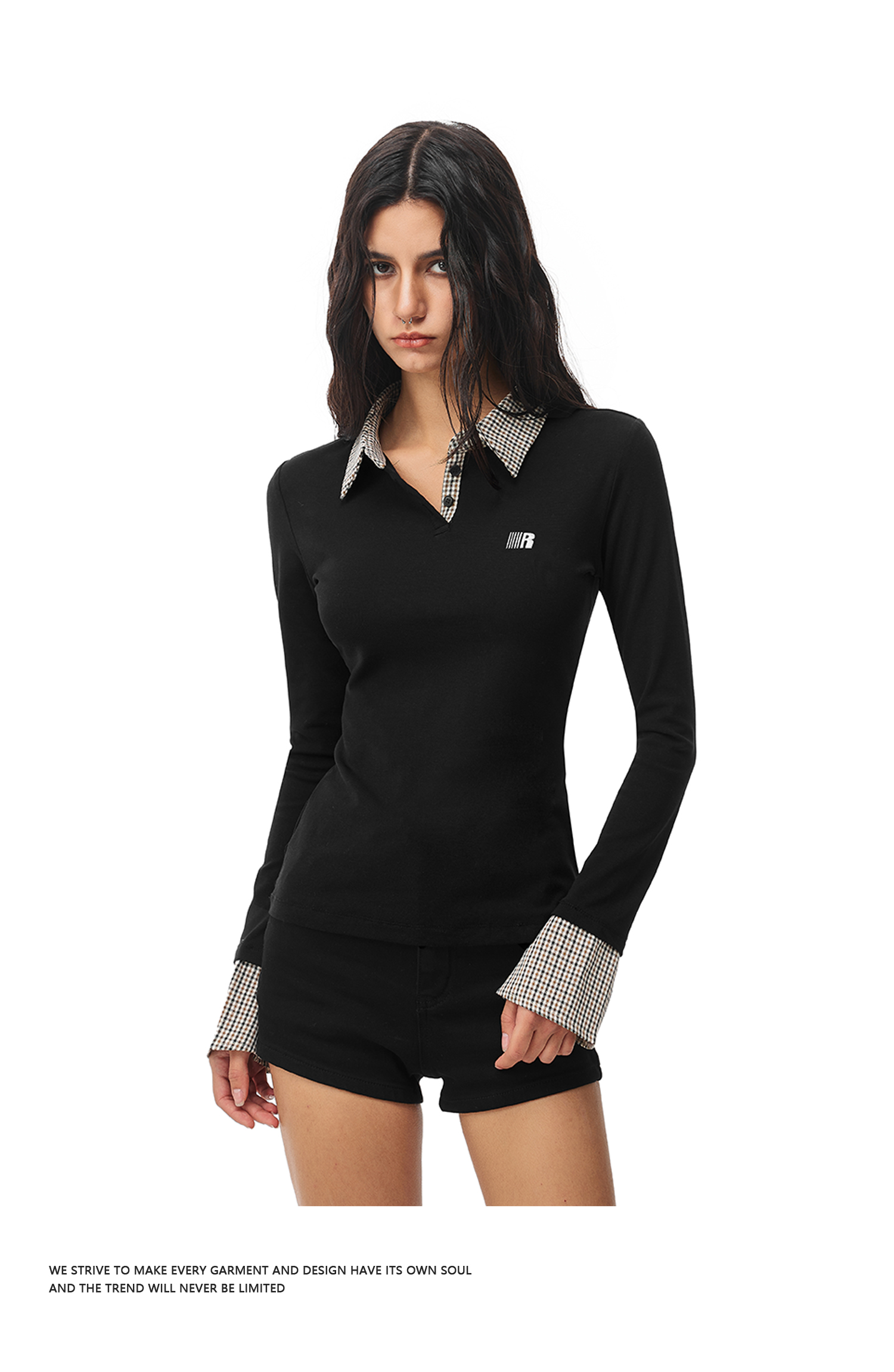 FDR官方店 假两件polo领长袖t恤女春季美式修身显瘦拼接打底上衣