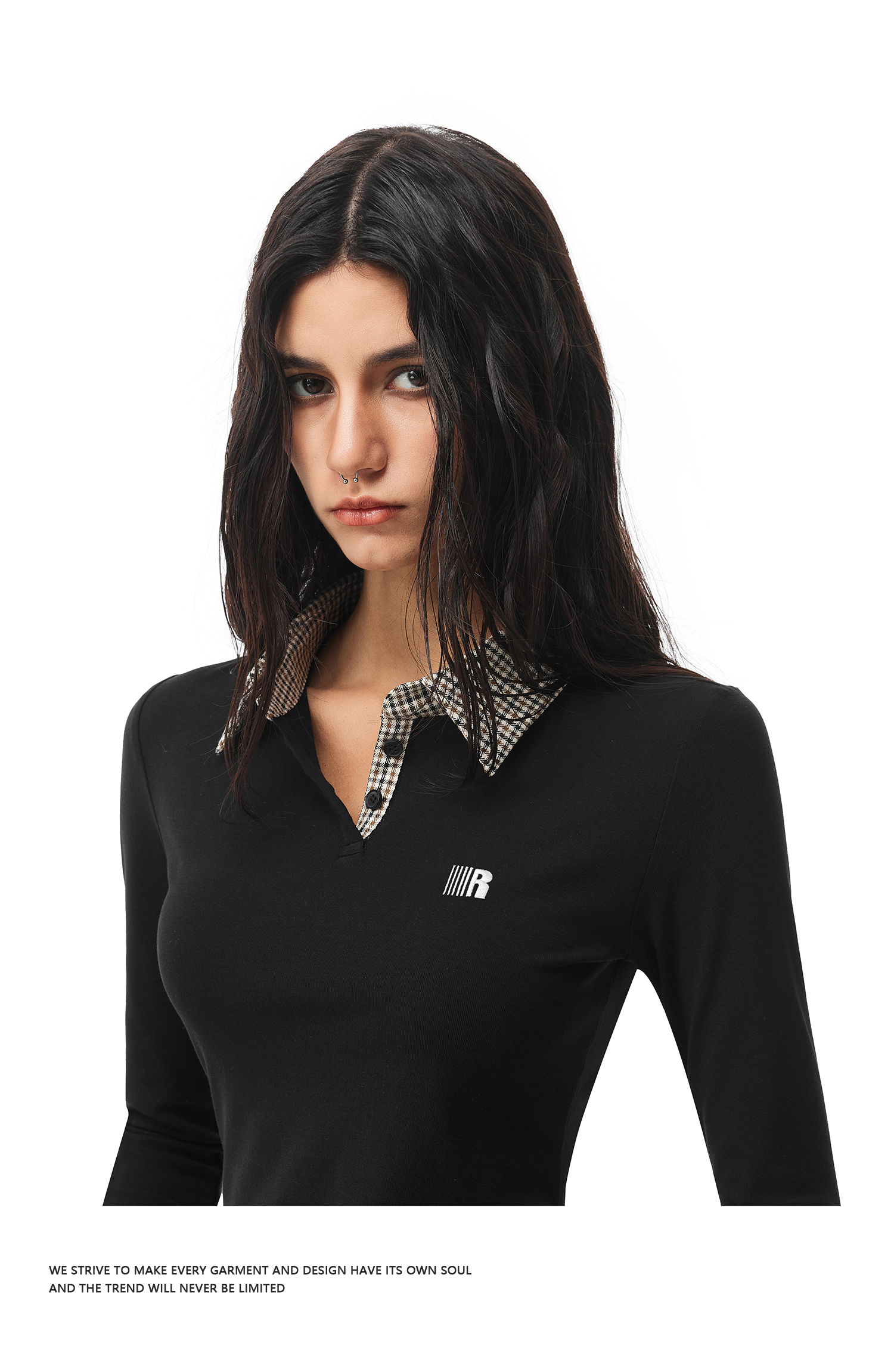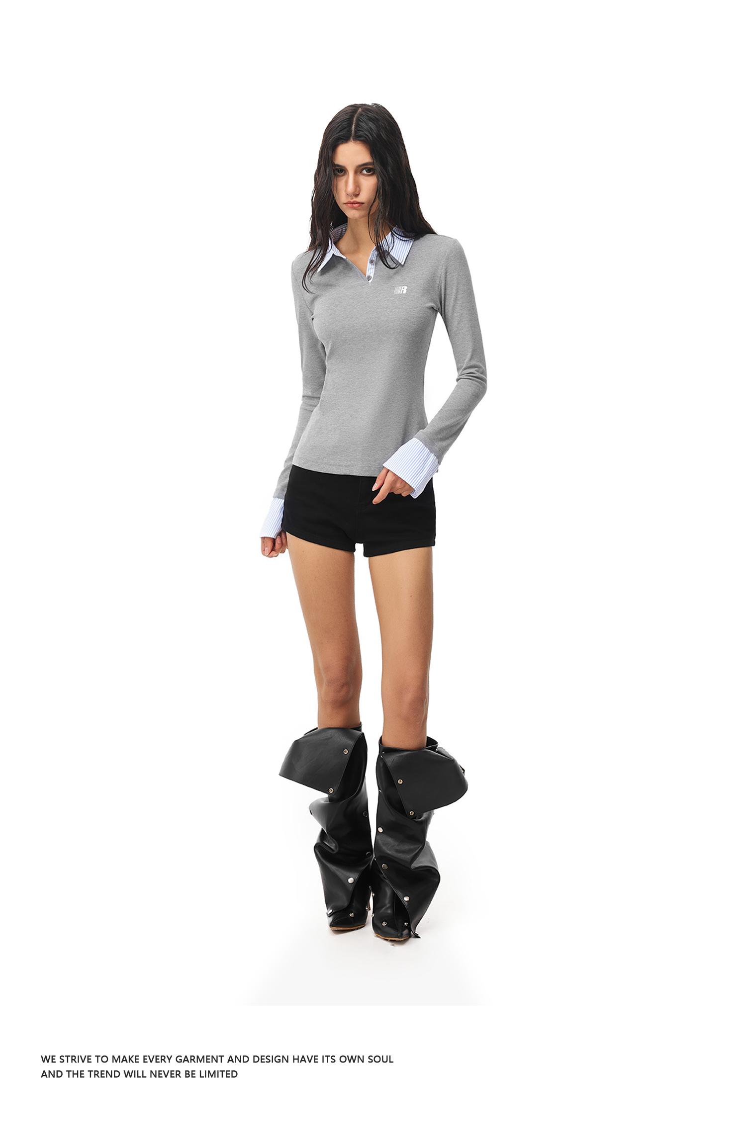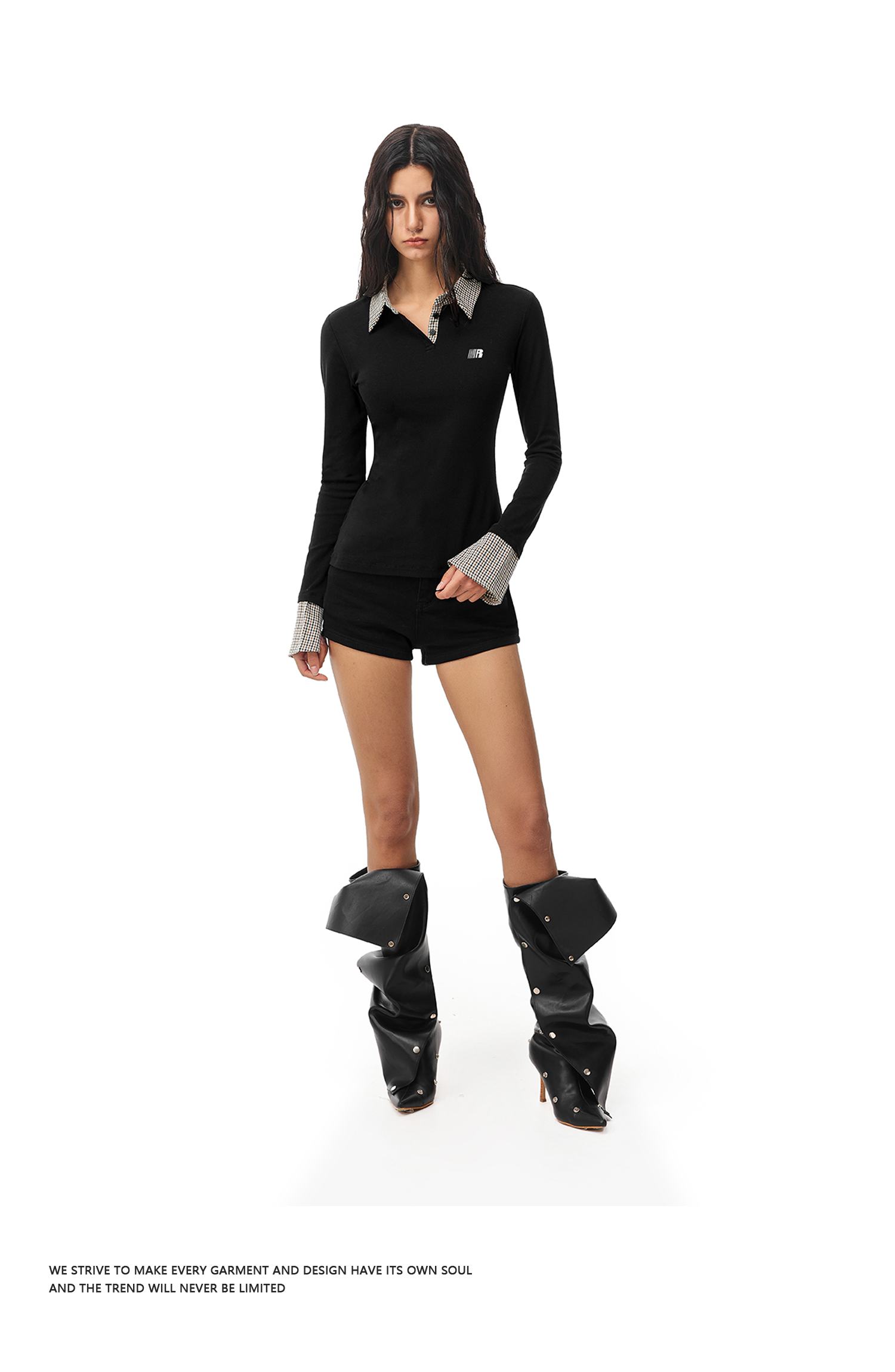 FDR官方店 假两件polo领长袖t恤女春季美式修身显瘦拼接打底上衣