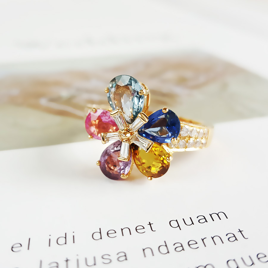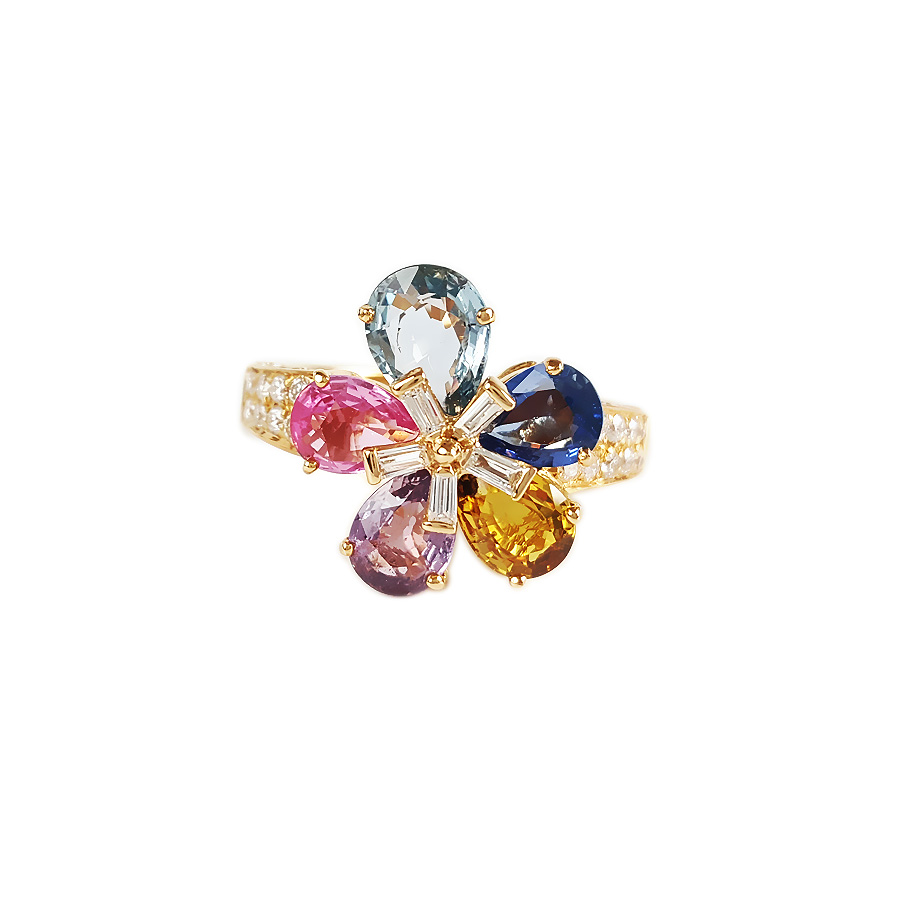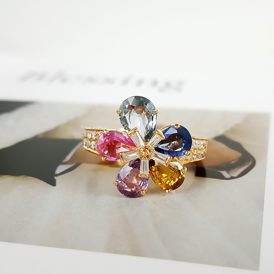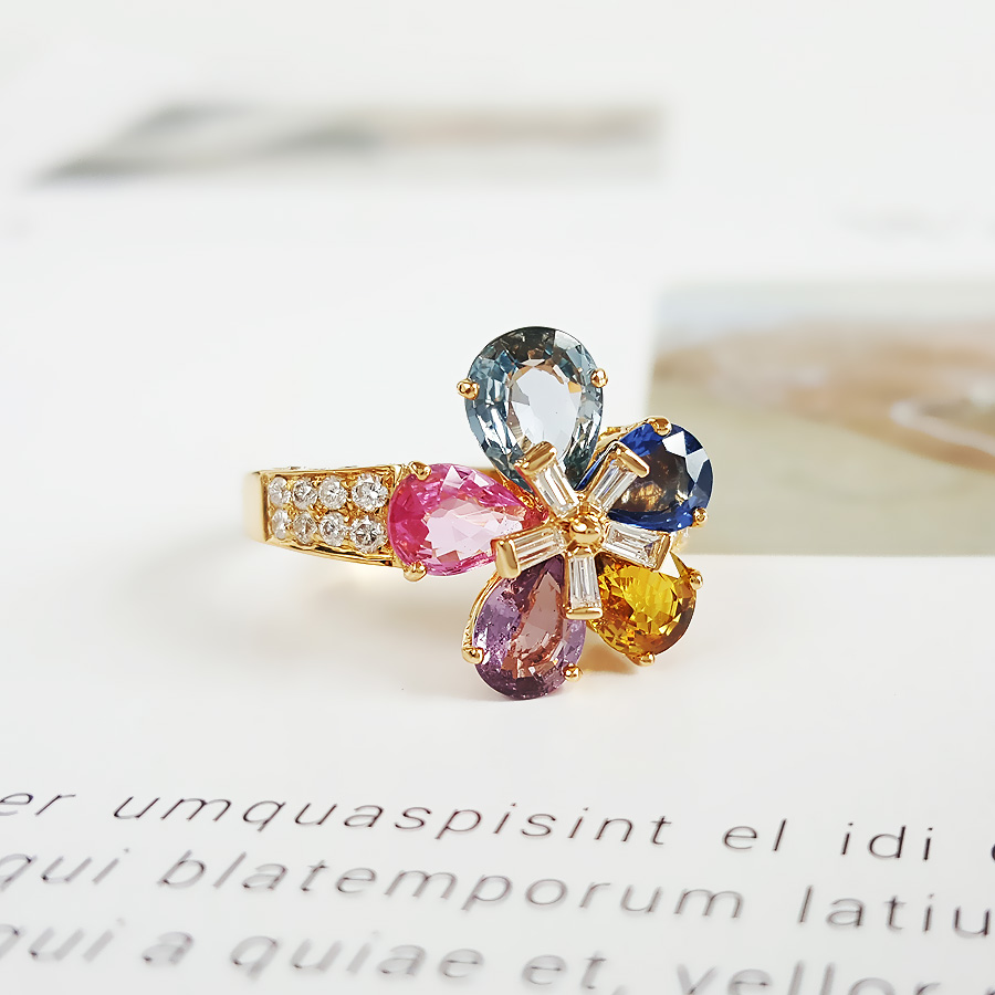 款式 | 18K黄金镶钻彩色蓝宝石花朵戒指 |