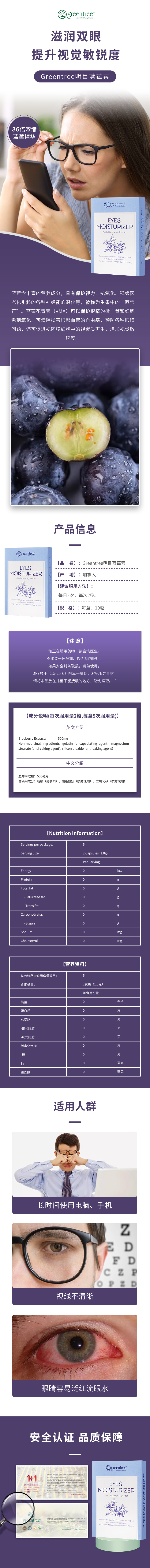 【香港直邮】眼睛明亮舒缓疲劳 加拿大greentree明目藍莓素(10粒)