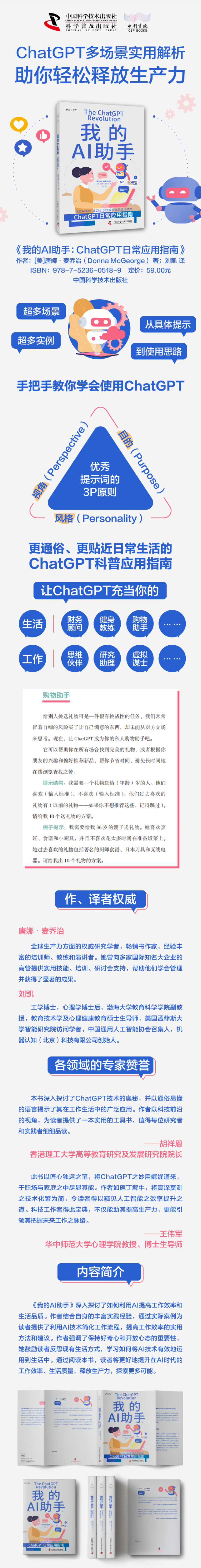 此书以匠心独运之笔,将ChatGPT之妙用娓娓道来,于职场与家庭之中尽显其能。作者如庖丁解牛,将高深莫测之技术化繁为简,令读者得以窥见人工智能之效率提升之道。科技工作者得此宝典,不仅能助其提高生产力,更能引领其把握未来工作之脉络。——王伟军,华中师范大学心理学院教授、博士生导师