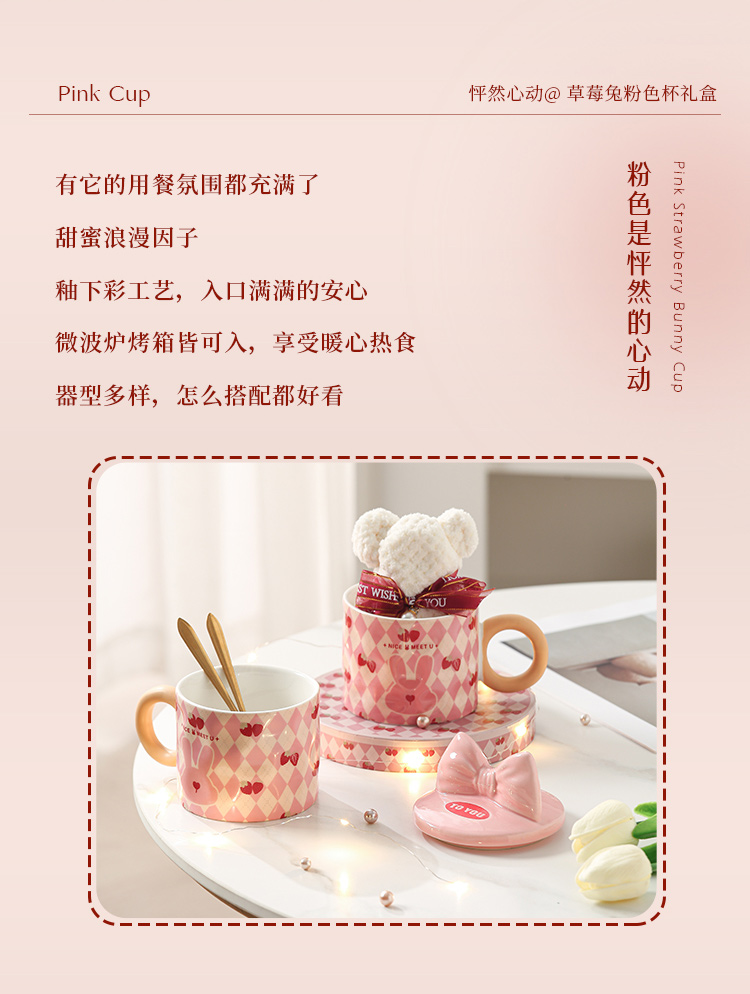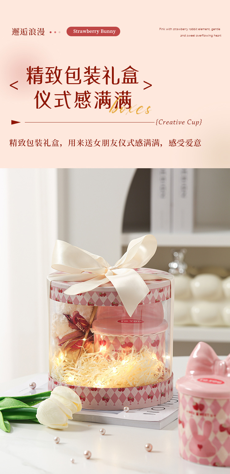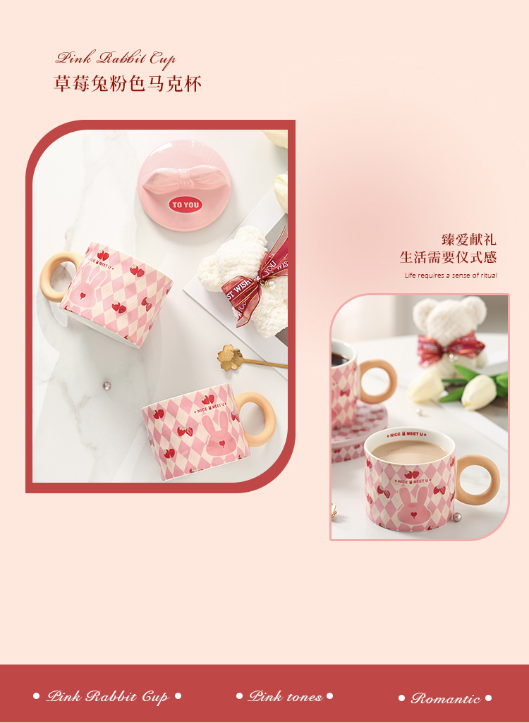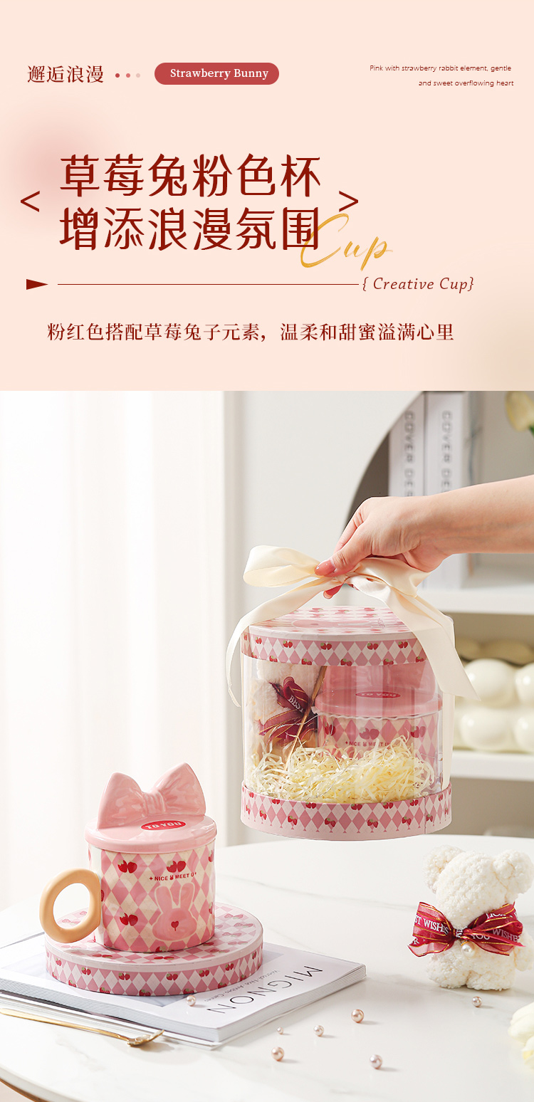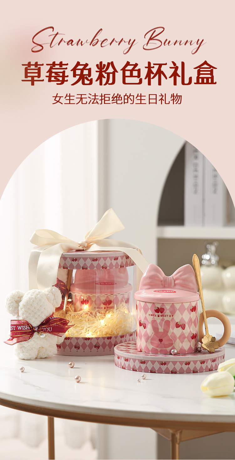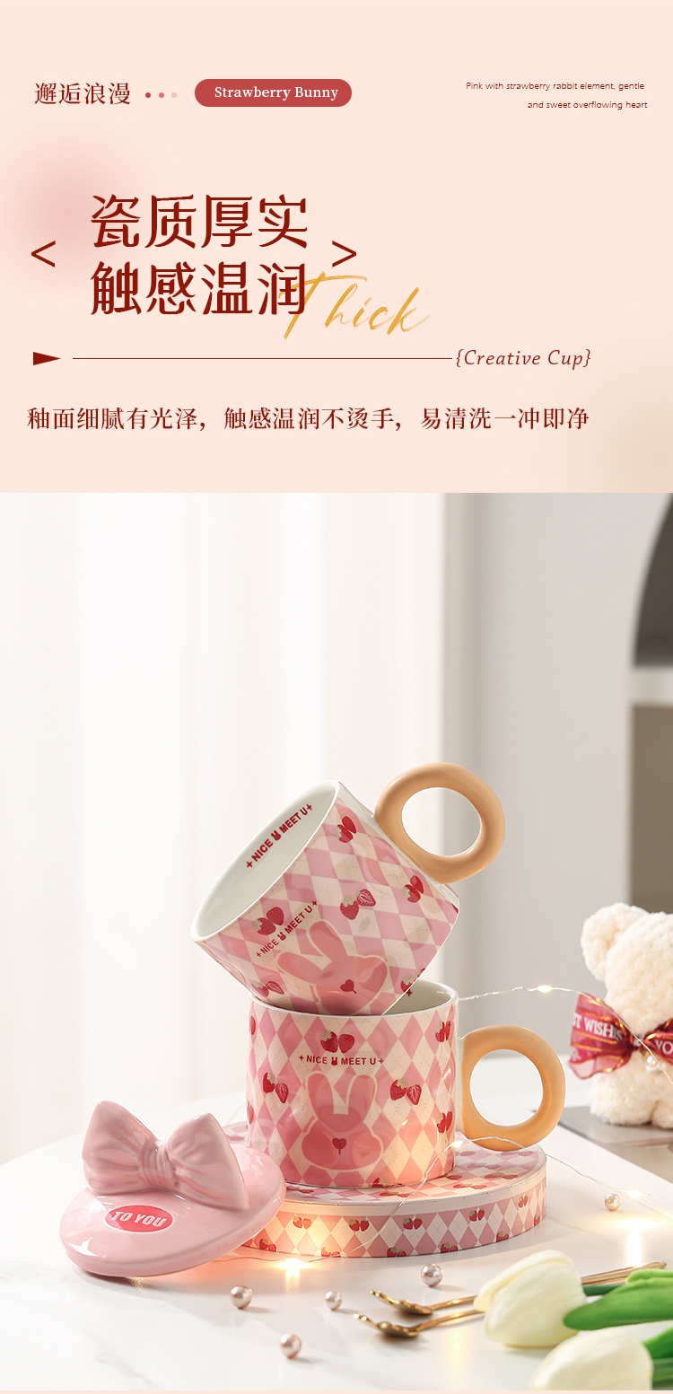 【粉嫩草莓兔创意杯】粉嫩少女心马克杯带盖高颜值家用陶瓷水杯子女生生日礼物礼盒装