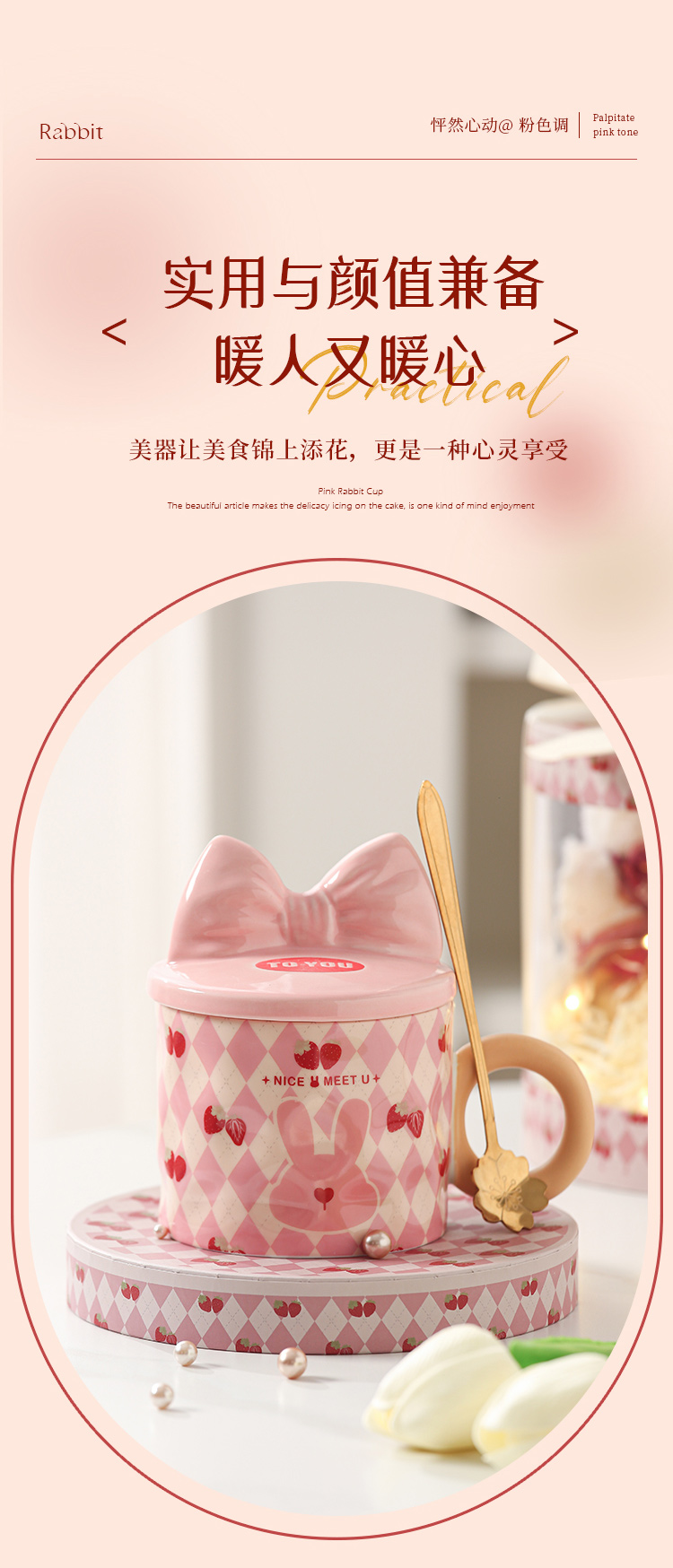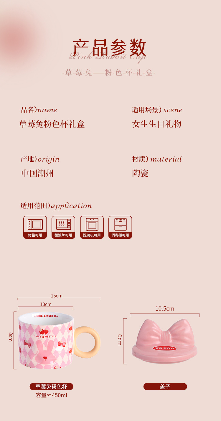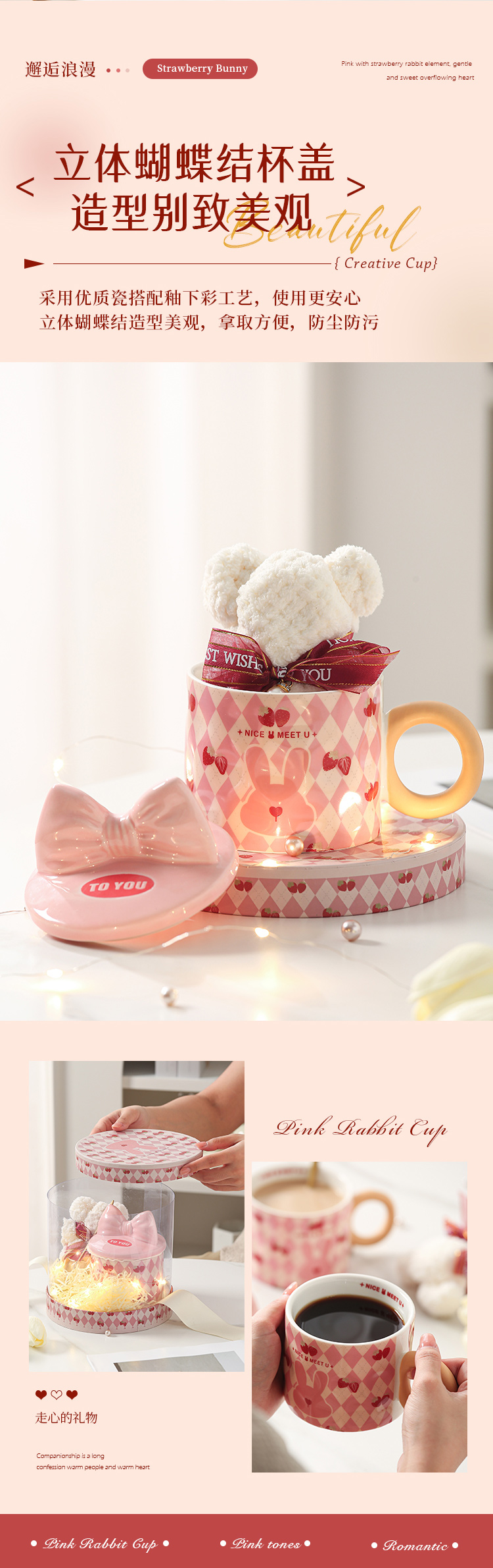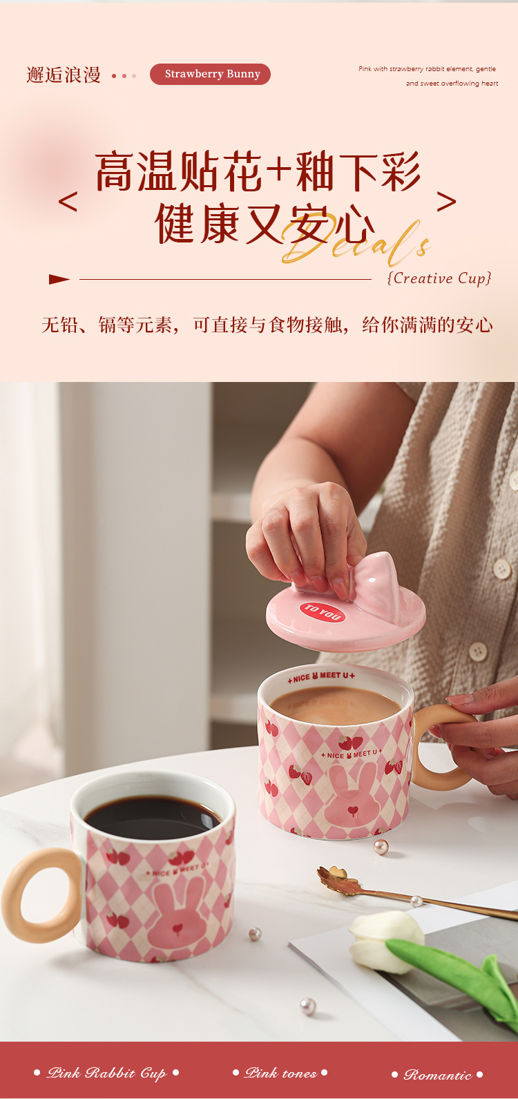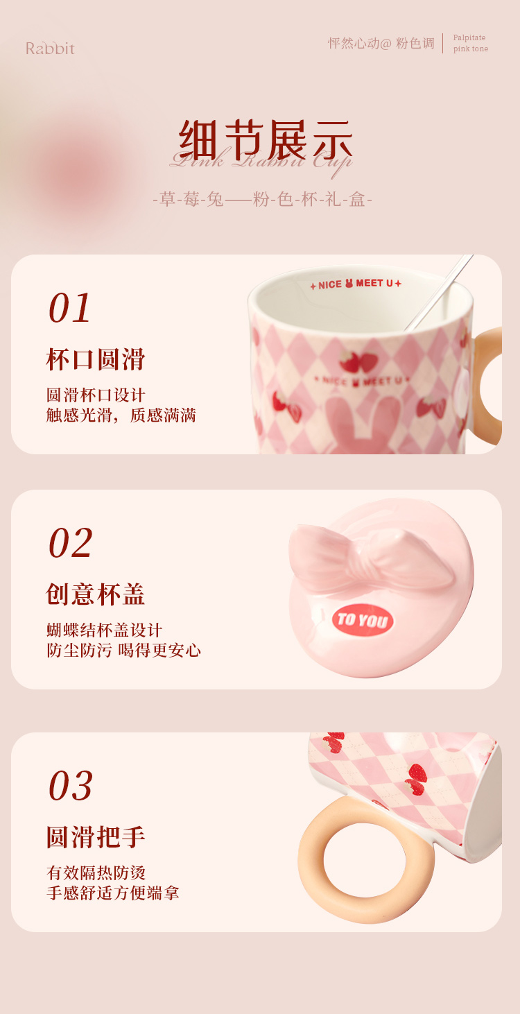 【粉嫩草莓兔创意杯】粉嫩少女心马克杯带盖高颜值家用陶瓷水杯子女生生日礼物礼盒装