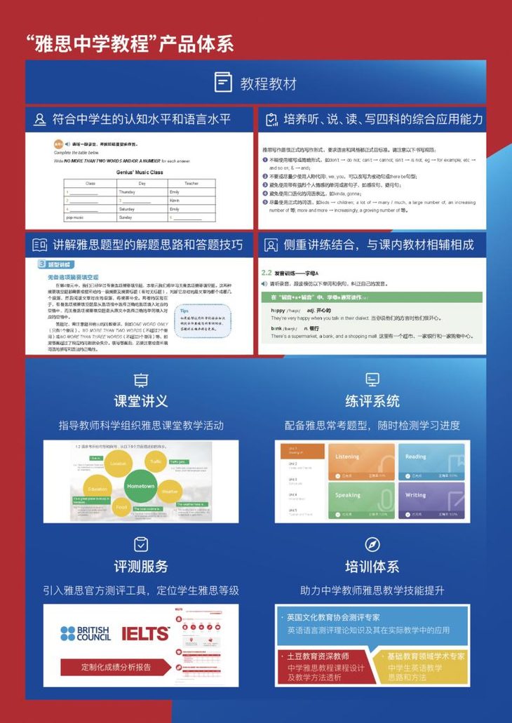 “雅思中学教程”不仅是一套针对低龄雅思考生的备考教程,更是与学校和培训机构所选用的教材相辅相成,包含线上、线下雅思考试相关的培训课程,覆盖教、学、测、评、练各个环节,从多维度、全方位提升学生英语能力的整体解决方案。