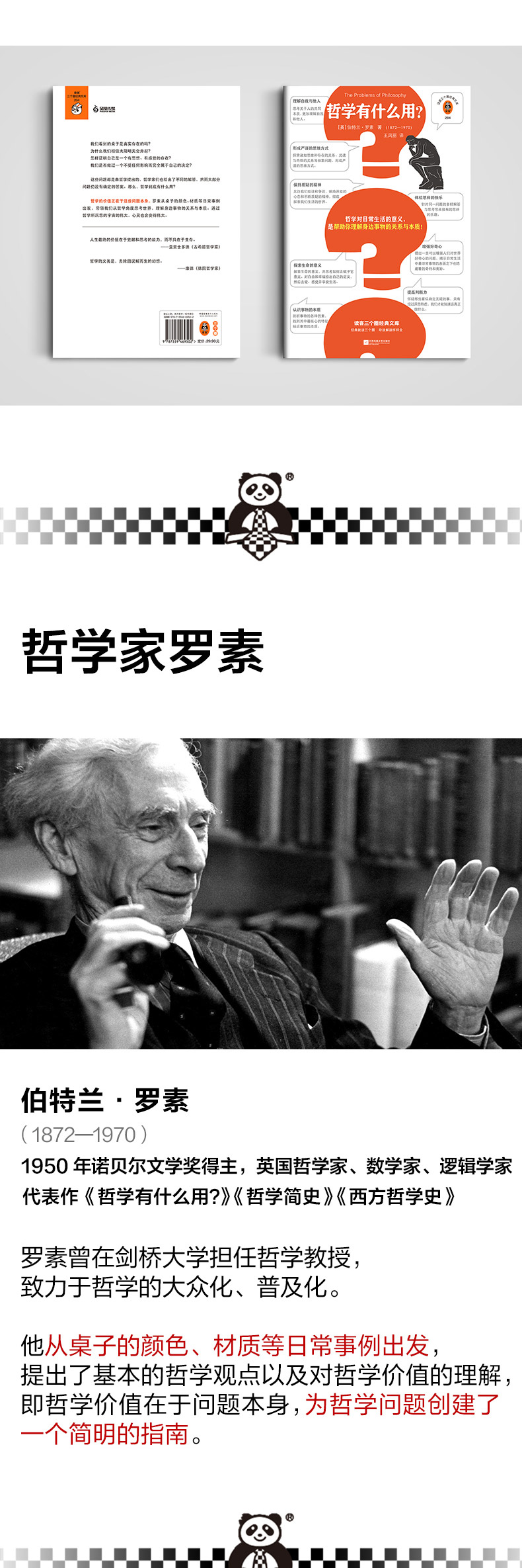 罗素曾在剑桥大学担任哲学教授,致力于哲学的大众化、普及化。1910年创作了《哲学有什么用?》(又译为《哲学问题》),在这本通俗易懂的哲学导论中,他从桌子的颜色、材质等日常事例出发,提出了基本的哲学观点以及对哲学价值的理解,即哲学价值在于问题本身,为哲学问题创建了一个简明的指南。