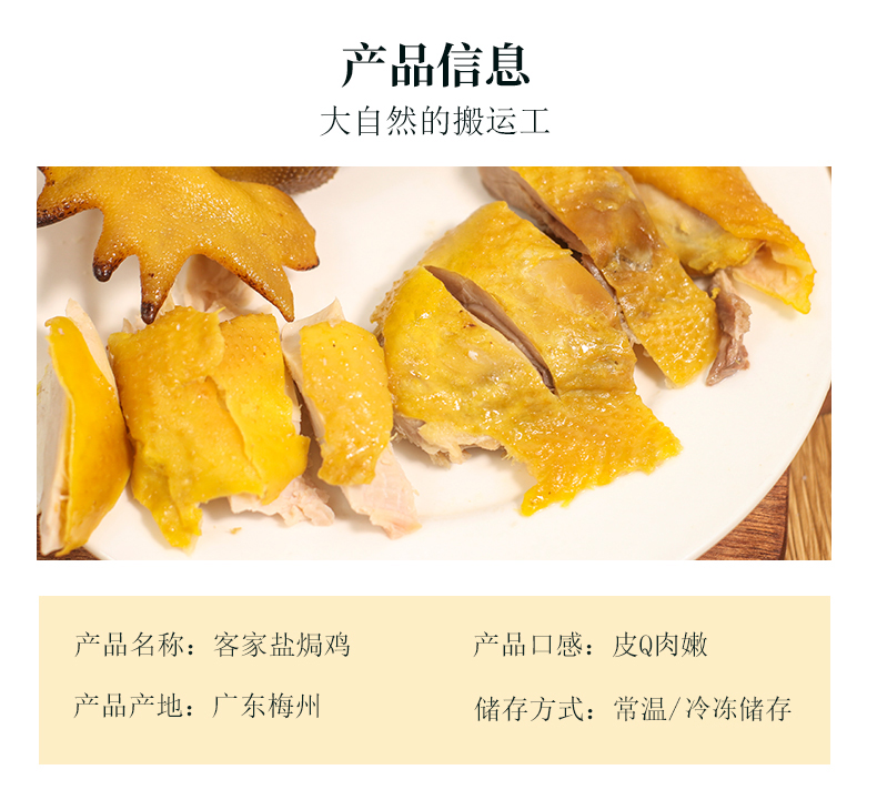 温馨小提示:内里的鸡肉是真空包装,因为是食物,收到后不要等,记得要看看,如果发现有漏气胀包就不要吃了,直接找客服处理。日常可以≤20℃阴凉干燥处保存,保质期15天左右,直接开袋即食;若是想要保存更久,可以0℃以下冷冻保存30天,吃之前解冻加热即可!产品刚开袋时有些老粉会不太适应口味,或者是觉得有酒味,鸡肉的表皮颜色不均匀,有黑点或黑白不均,这都属于盐焗鸡的正常现象,可以放心吃,也不在售后范围内,介意者慎拍!食品不支持拒收退回,下单后修改地址需加收费用,请提前确认好发货信息。若收到发现有漏气、胀包、坏包,商品规格有误、少发、变质等问题请勿食用,在签收后12小时内拍照(需拆掉外包装,里面真空包装勿拆)并联系客服。