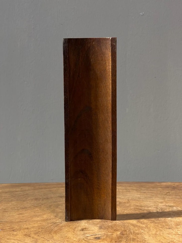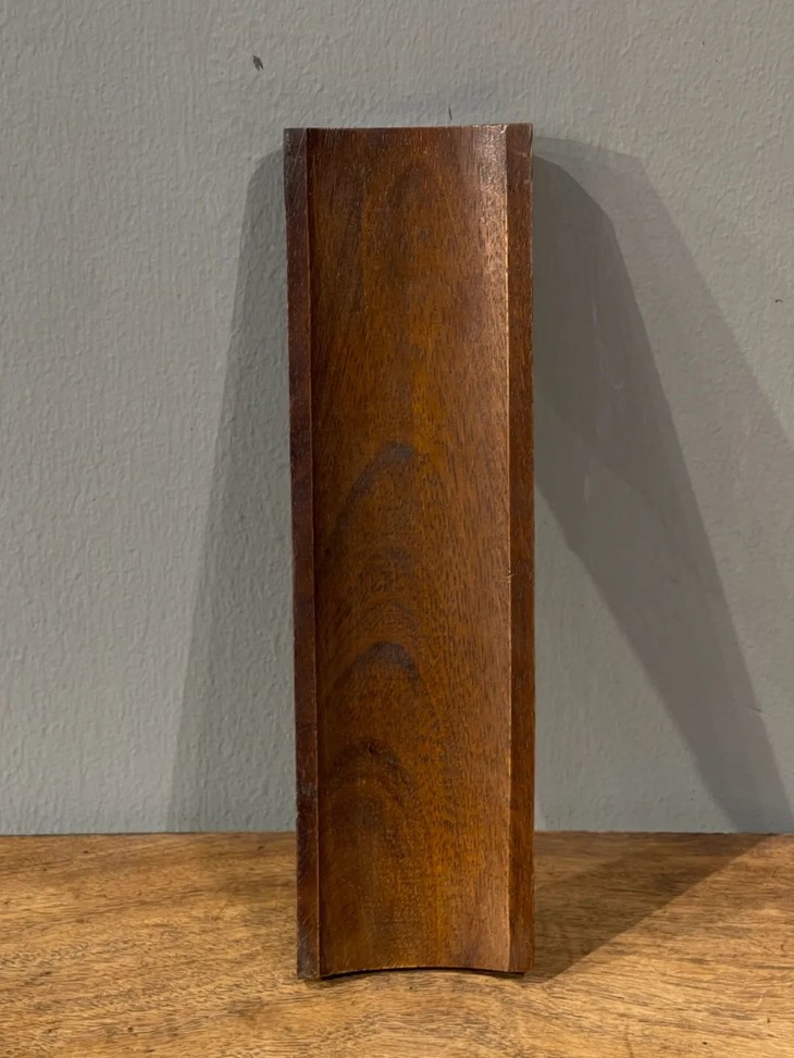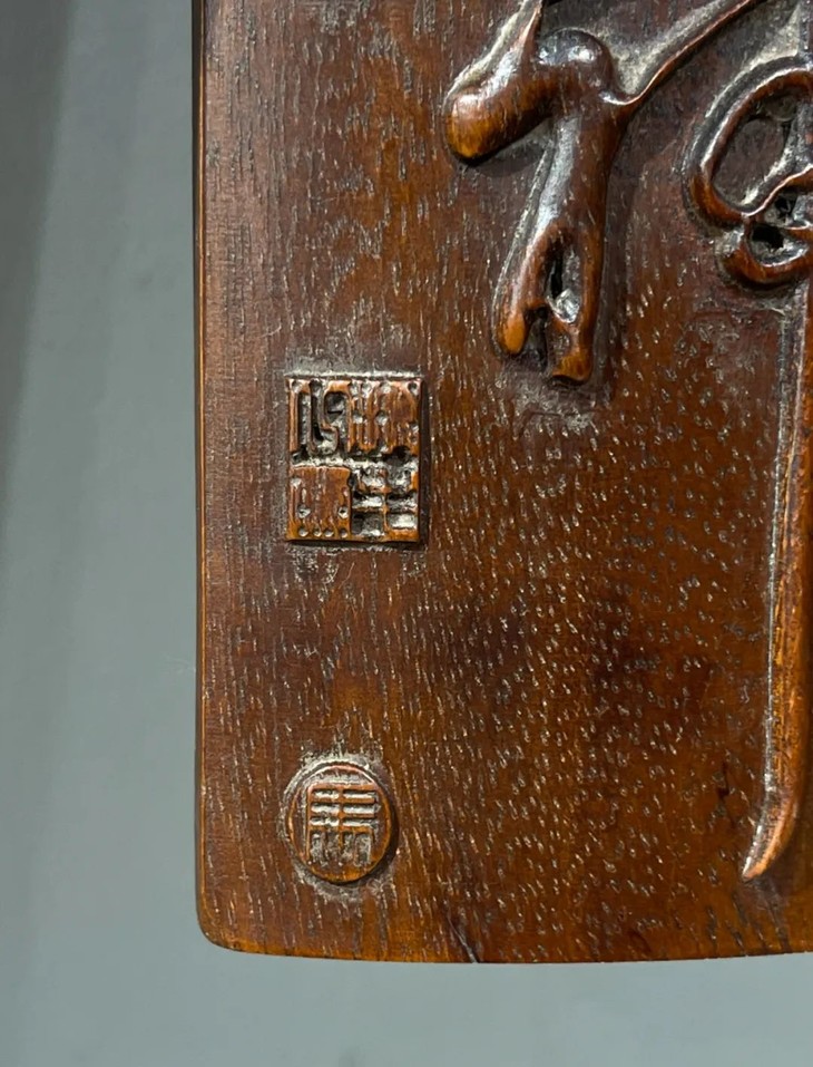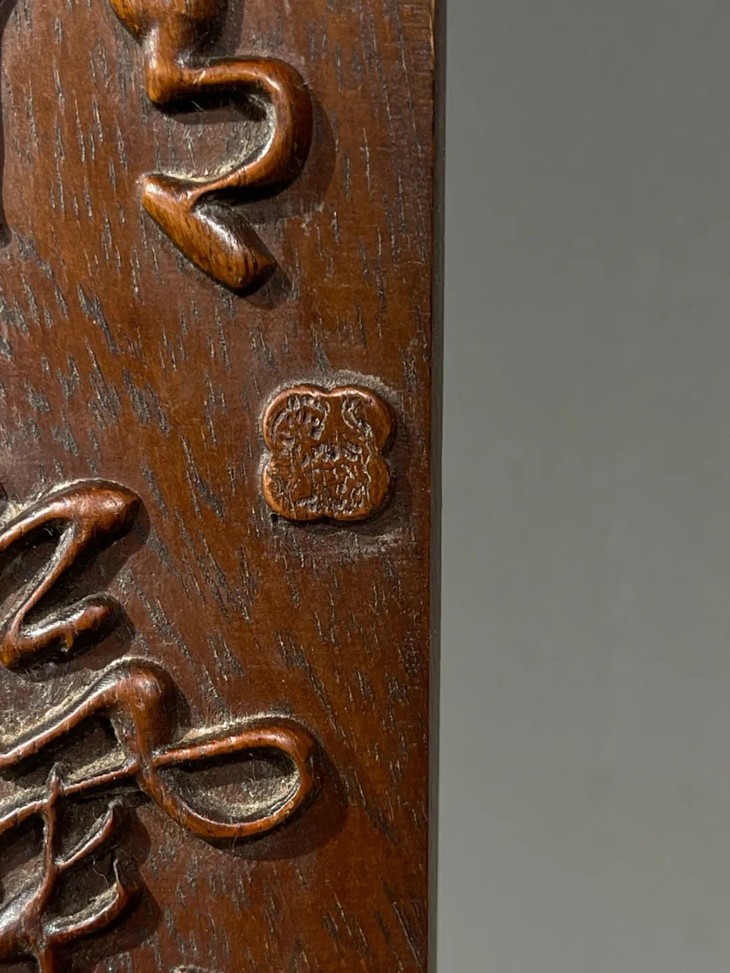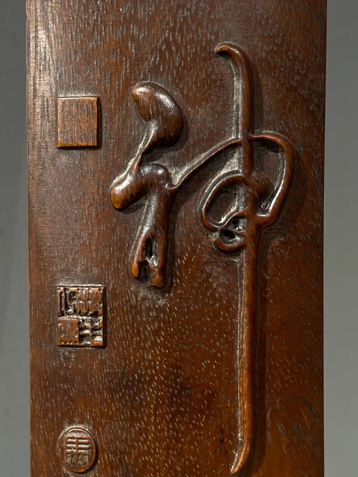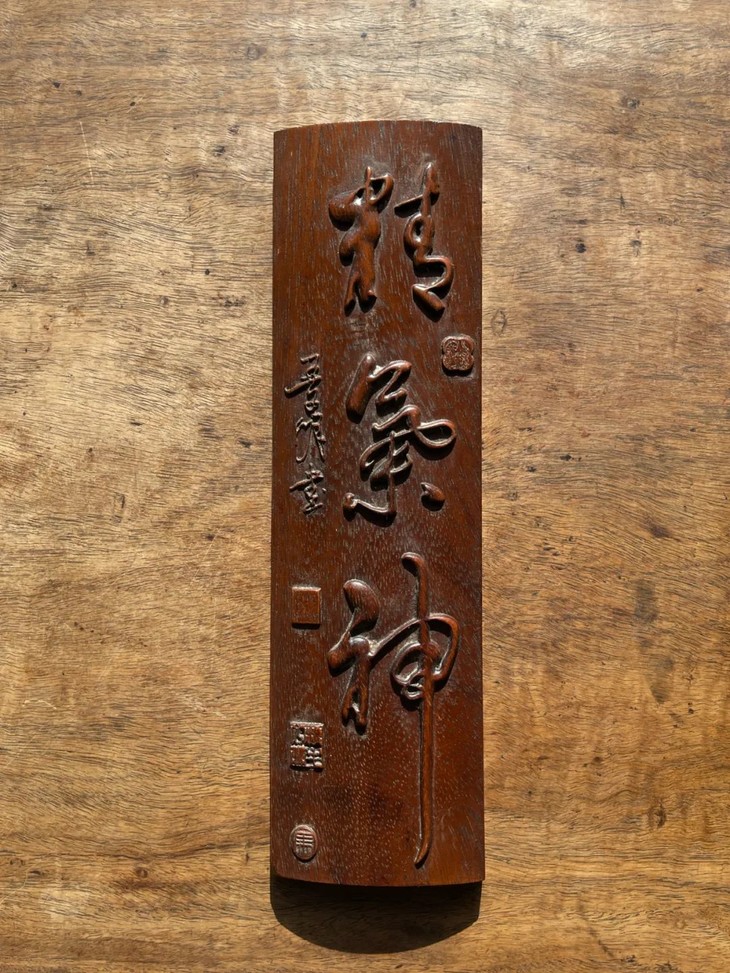 这是一件以质地坚硬、天然木纹理凊晰华丽的楠木整木琢磨而成的厚胎刻字文房臂搁,以整块楠木琢墨成厚壁半圆弧,弧面减地浮雕深刻草体“精氣神”与人名款与印款,曲线弧度优美,减地浮雕仿书法挂轴,雕琢字体刚劲流畅,风格高贵,形式优雅,老楠木色泽柔美,天然纹理清晰华丽、质地坚硬比重高,包浆温润。是一费工费料之老文房臂搁,或可用为茶則。