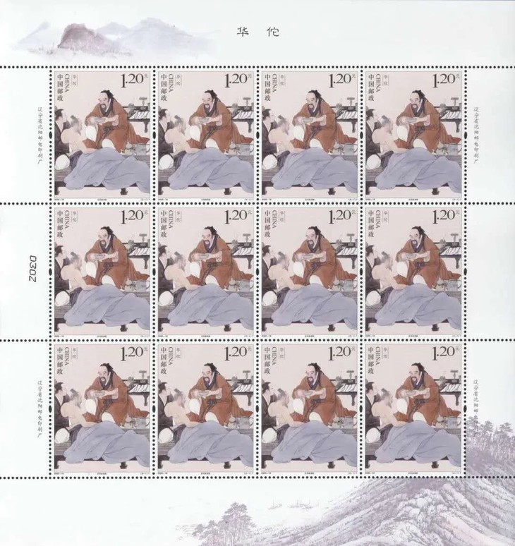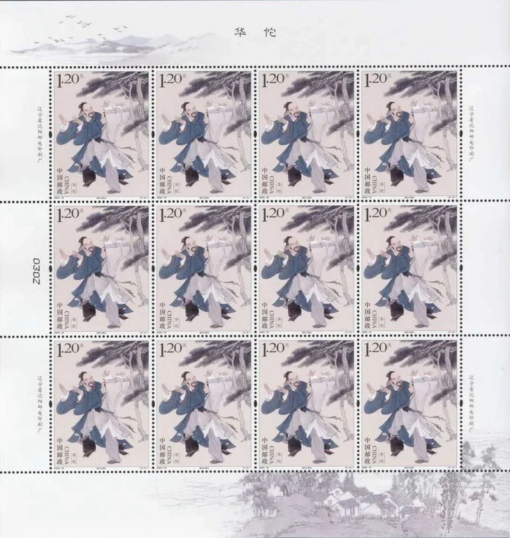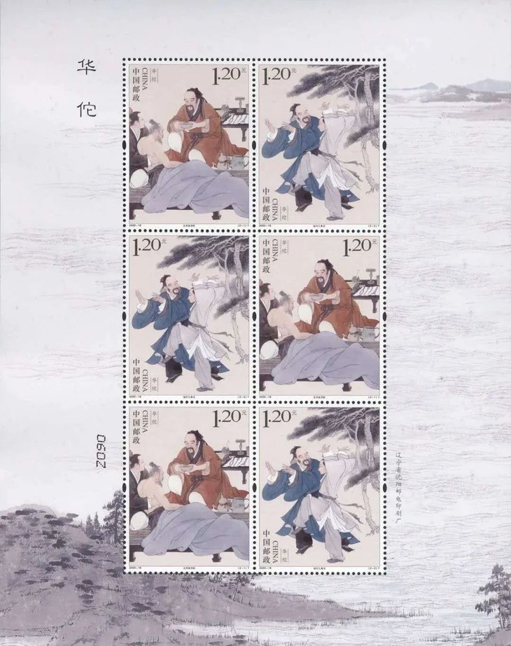 邮票图案名称为:发明麻沸散、编创五禽戏,小型张图案名称:华佗像。