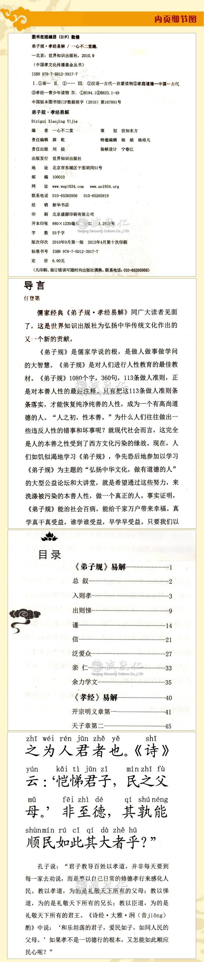 【基本信息】: 书籍名称: 《孝经 弟子规易解》 出版社:世界知识出版社 出版时间:2010年9月 页数:96页 ISBN:9787501239177 价格:10.00元 【书籍简介】: 《弟子规》和《孝经》是儒家两部重要经典。 《弟子规》原名《训蒙文》,为清朝康熙年间秀才李毓秀所作。其内容采用《论语.学而》第六条:“弟子入则孝,出则弟,谨而信,泛爱众,而亲仁,行有馀力,则以学文。”的文义以三字一句,两句一韵编纂而成,分为七个部分加以演述;具体列举出我们在家、出外、待人接物、求学应有的礼仪与规范,特别讲求家庭教育与生活教育。是童蒙养正,教育我们敦伦尽分、闲邪存诚,养成忠厚家风的最佳读物。 《孝经》相传为孔子所作,其成书时间据考证应在秦汉时期。自两汉以来,《孝经》一直为中国社会所高度重视,南宋以来更被列为《十三经》之一,对传播儒家伦理、维护中国古代社会秩序起了很大作用。《孝经》通过孔子和弟子曾参(曾子)之间的对话,精要的阐述了儒家对于孝道的见解,认为孝是天然之道,是一切德行的根本,从而提出了以孝为本的治国理念。这一理念为此后历代帝王所奉行。 本书将《弟子规》和《孝经》合二为一,为方便学习诵读,原文配上了标准拼音,并集众家之长,为原文增加了深入浅出的白话译文。 |