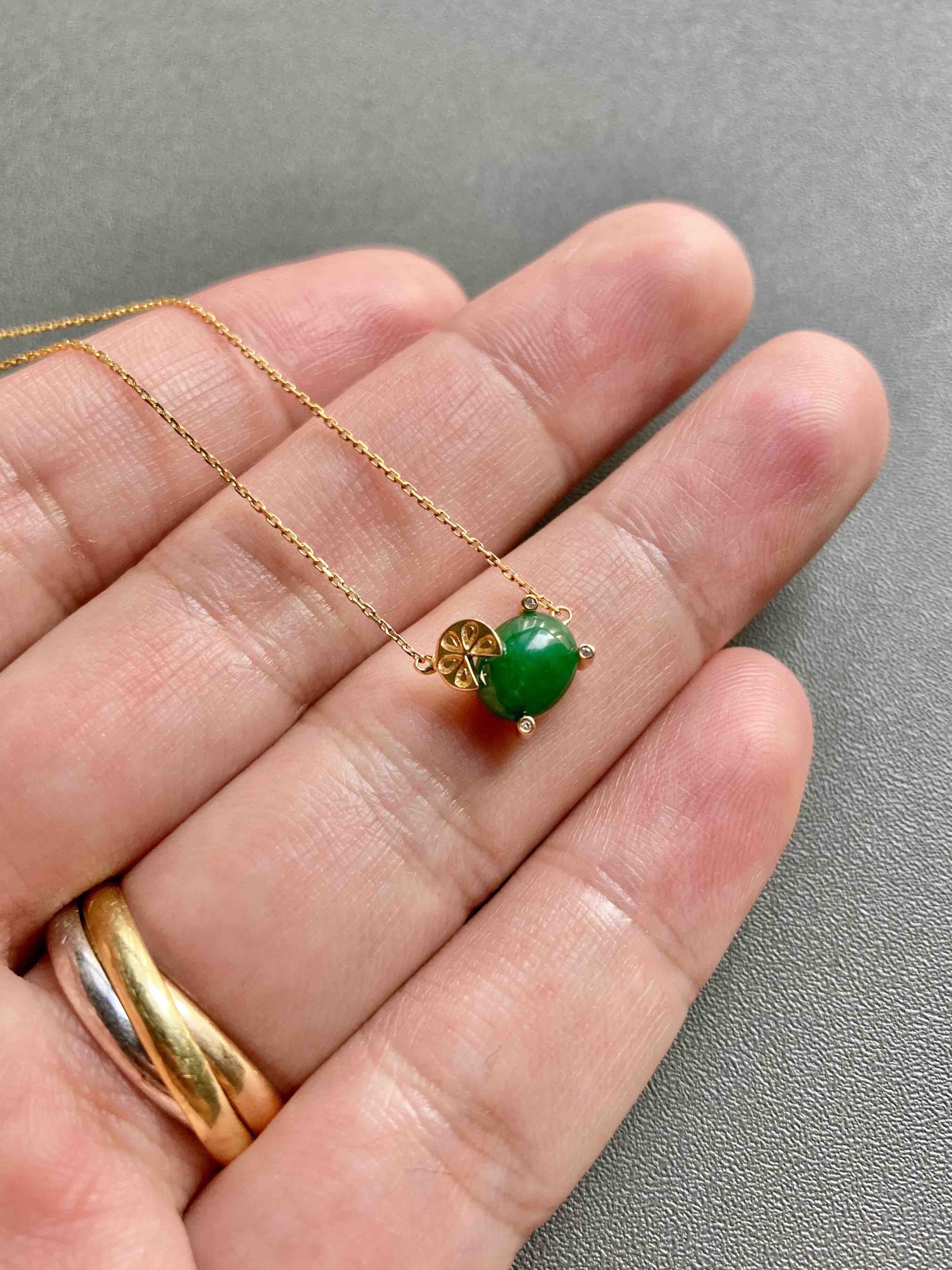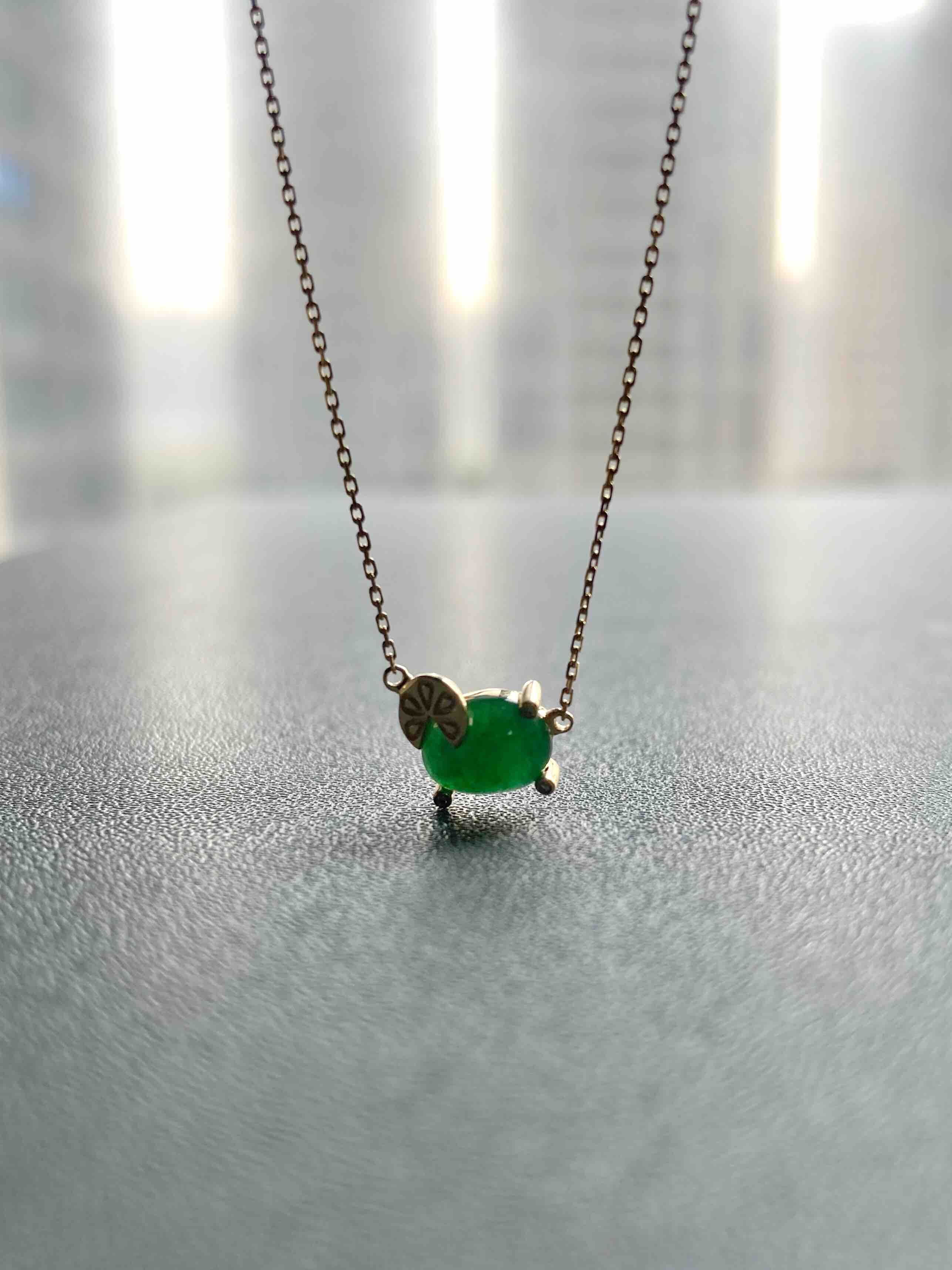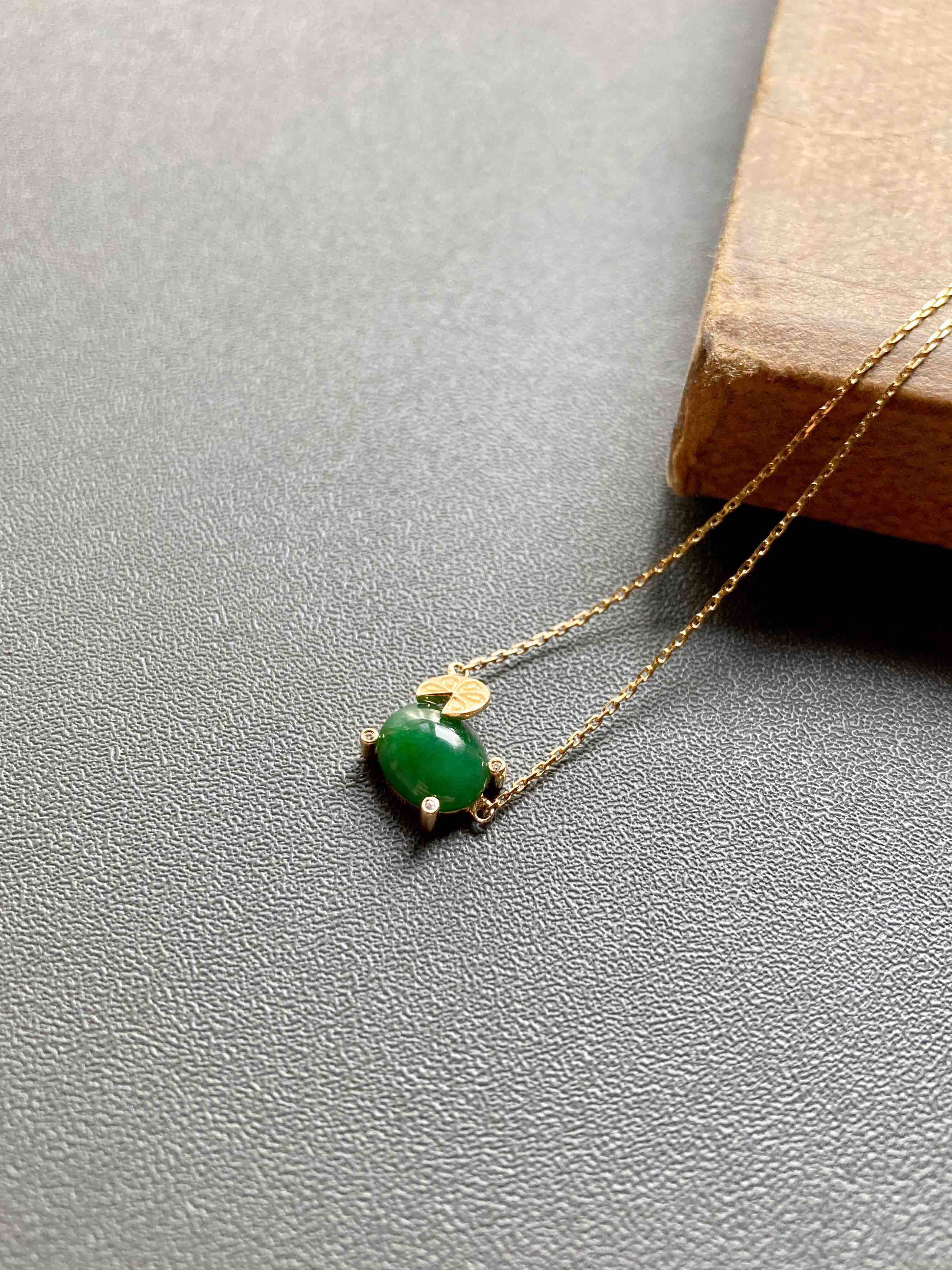 造型非常可爱的锁骨链,翡翠禄来原创设计系列,蛋面绿色特别浓郁,上面一个18k金的柠檬片萌萌哒,性价比无敌,蛋面8×6×3.5mm,链长40cm加5cm延长链