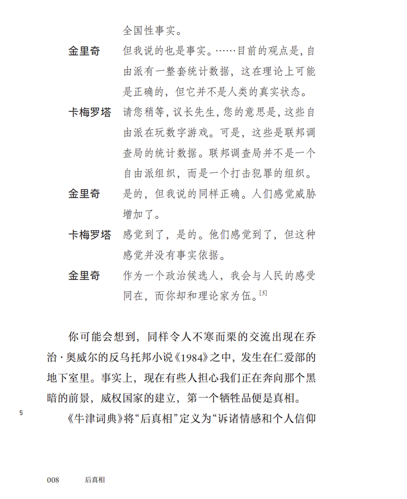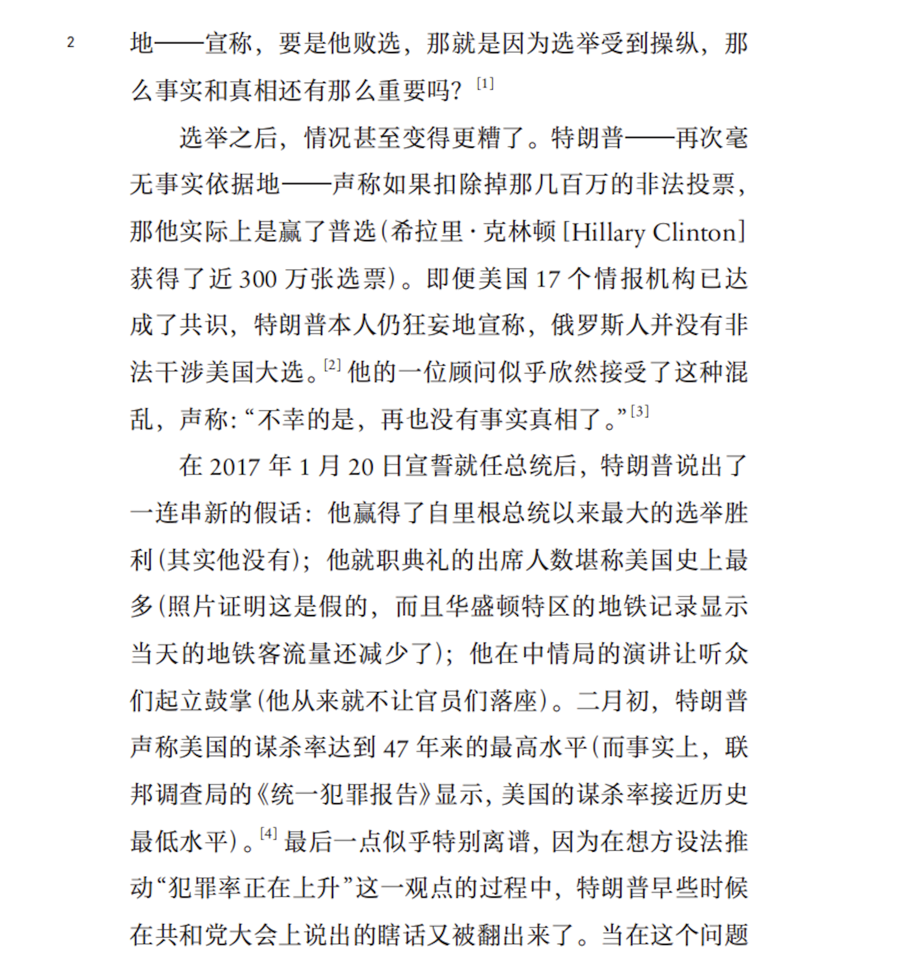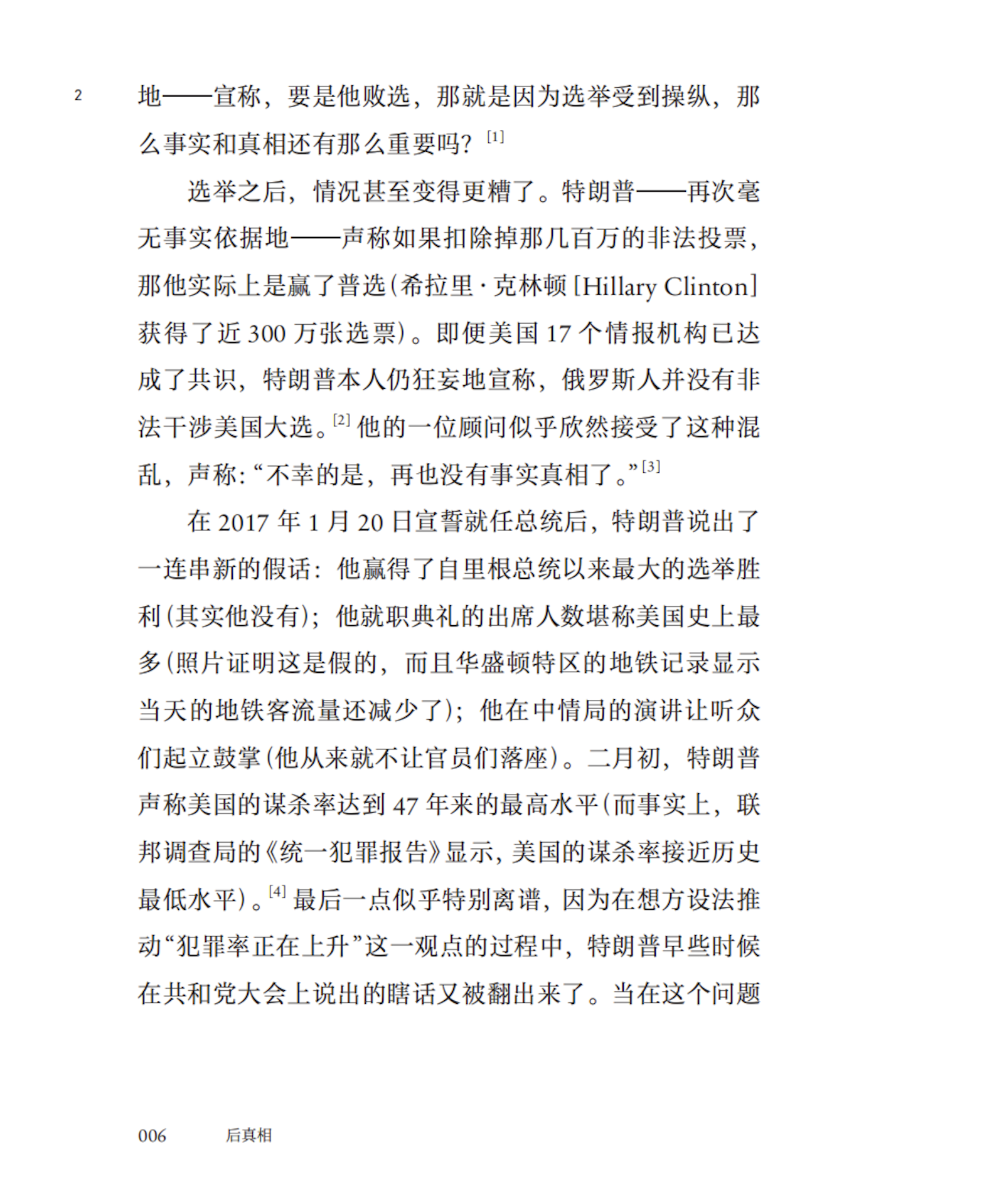 【免费在线读】;后真相现象在 2016 年 11 月火速引起公众关注,当年《牛津词典》把它选为 2016 年度词汇。看到这个词的使用频次与2015年相比激增2000%之后,这个选择似乎显而易见又顺理成章。同时入围的其他年度词汇包括;另类右翼与;脱欧派,凸显了该年度的政治背景。作为一个包罗万象的短语,;后真相似乎抓准了这个时代的主题。面对以事实的混乱、论证标准的缺失以及彻头彻尾的谎言为标志的 2016 年英国脱欧投票和美国总统大选,许多人都惊骇不已。如果唐纳德 特朗普(Donald Trump)可以无凭无据地宣称,要是他败选,那就是因为选举受到操纵,那么事实和真相还有那么重要吗?[1]选举之后,情况甚至变得更糟了。特朗普再次毫无事实依据地声称如果扣除掉那几百万的非法投票,那他实际上是赢了普选(希拉里克林顿 [Hillary Clinton]获得了近 300 万张选票)。即便美国 17 个情报机构已达成了共识,特朗普本人仍狂妄地宣称,俄罗斯人并没有非法干涉美国大选。[2] 他的一位顾问似乎欣然接受了这种混乱,声称:;不幸的是,再也没有事实真相了。[3]在 2017 年 1 月 20 日宣誓就任总统后,特朗普说出了一连串新的假话:他赢得了自里根总统以来最大的选举胜利(其实他没有);他就职典礼的出席人数堪称美国史上最多(照片证明这是假的,而且华盛顿特区的地铁记录显示当天的地铁客流量还减少了);他在中情局的演讲让听众们起立鼓掌(他从来就不让军官们落座)。二月初,特朗普声称美国的谋杀率达到 47 年来的最高水平(而事实上,联邦调查局的《统一犯罪报告》显示,美国的谋杀率接近历史最低水平)。[4] 最后一点似乎特别离谱,因为在想方设法推动;犯罪率正在上升这一观点的过程中,特朗普早些时候在共和党大会上说出的瞎话又被翻出来了。当在这个问题上受到质疑时,当时的特朗普代言人纽特金里奇(Newt Gingrich)与美国有线电视新闻网(CNN)记者艾莉森卡梅罗塔(Alisyn Camerota)在镜头前进行了以下令人难以置信的对话: