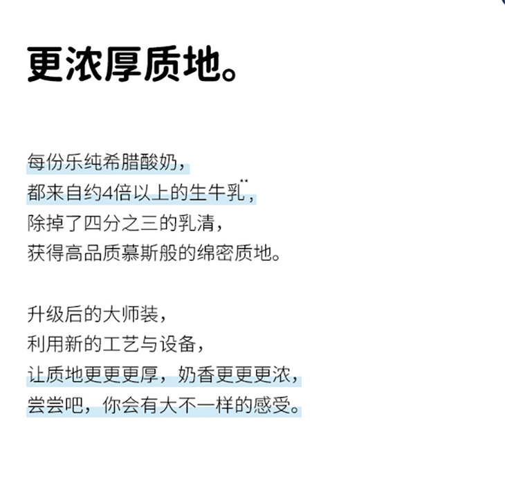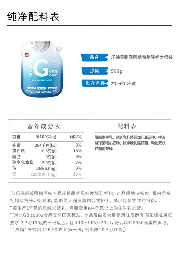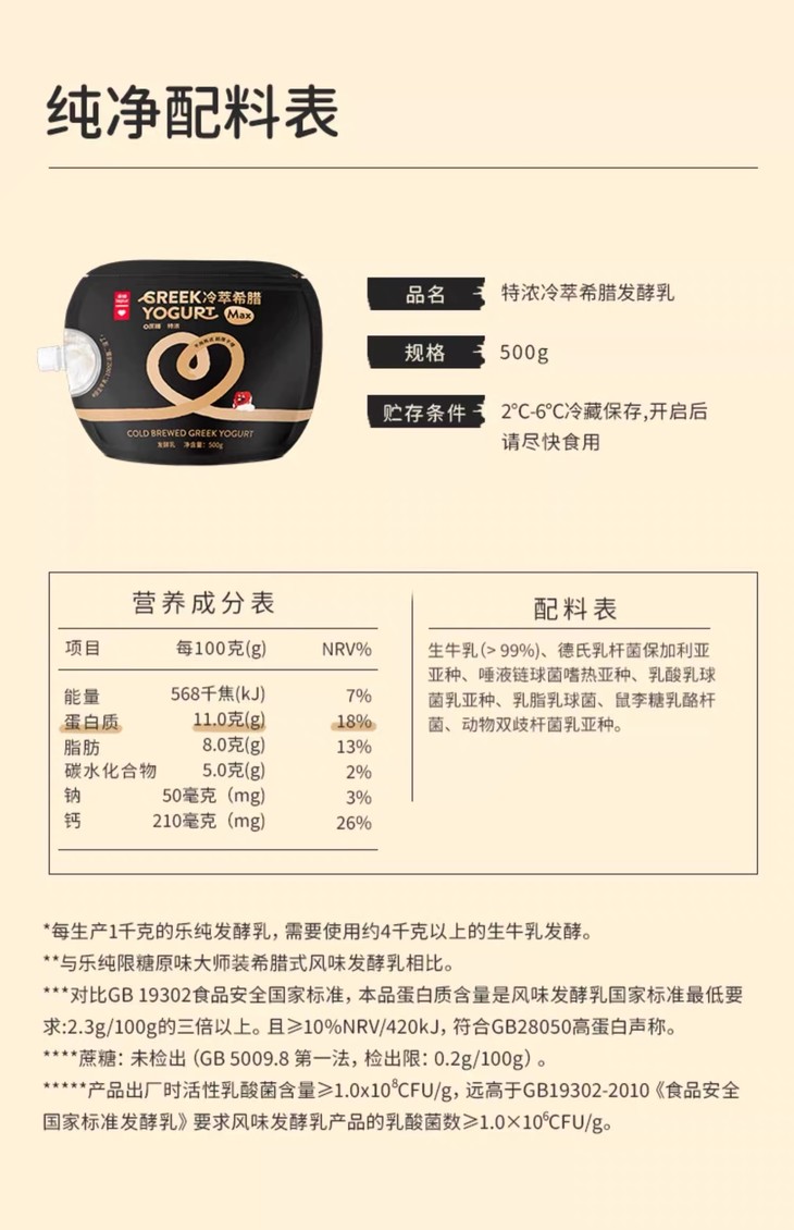 乐纯希腊酸奶Pro大师装之所以口感出众,源于其采用的先进工艺。每份酸奶都由约4倍以上的生牛乳制成,经过精心过滤,去除了四分之三的乳清,留下的是慕斯般绵密质地,带来十分独特的口感体验。在营养成分方面表现也十分出色,Pro系列相较于旧版,蛋白质含量提升了26%-32%,其中Max版本甚至提升了39%,原生蛋白含量远超国标3倍。配料表也是超干净,除了生牛乳和多种发酵菌种外,就只剩下根据口味调入的少量糖,真的是营养又健康哦!