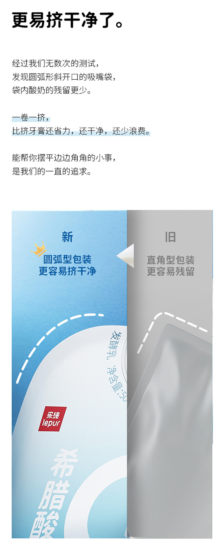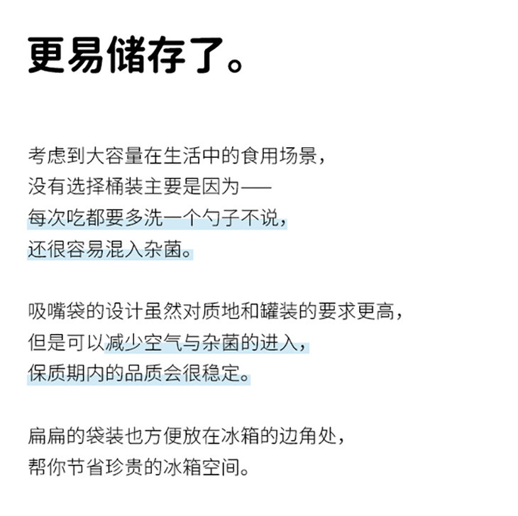 包装也很值得一说,吸嘴袋设计能减少空气与杂菌的进入,让酸奶在保质期内的品质更加稳定,即便开封后也能长时间储存,无论何时,都能享受到新鲜美味的厚厚酸奶。而且,扁扁的袋子冰箱的边角都能塞,能有效节省珍贵空间哦!
