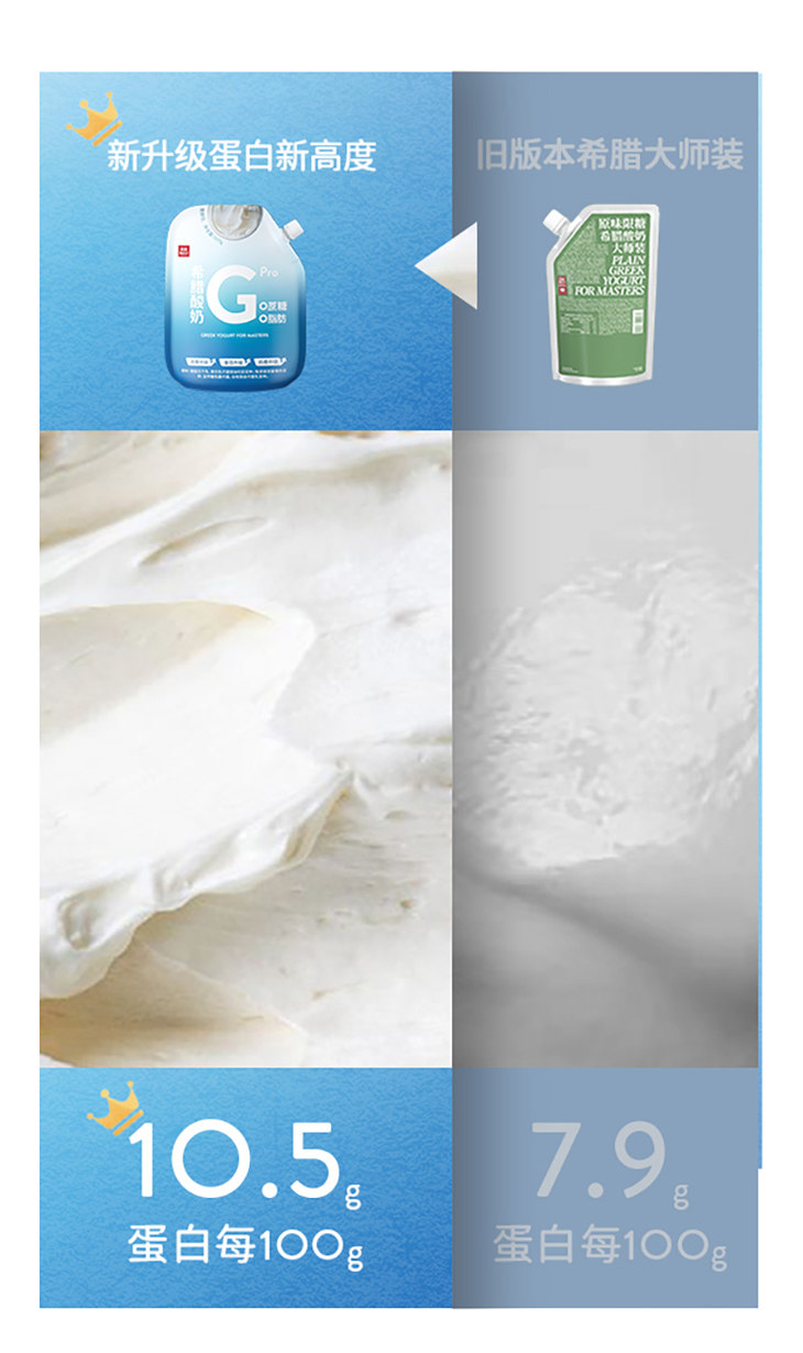 希腊酸奶Pro大师装共有三个口味,黑色零蔗糖特浓版、蓝色零糖零脂版以及绿色限糖原味版。如果你喜欢干噎口感,选黑版准没错,它的蛋白质含量也略高一些;要是强烈控糖控脂,蓝版是绝佳,零蔗糖零脂肪完全可以大口吃;如果还是喜欢略带甜味,绿版就很合适,糖量不高,酸酸甜甜的味道十分爽口,肯定是更美味啦!热量都十分友好,尤其是蓝版,每100g才60多大卡,不会给身体增添负担,还能带来满满的安心饱腹感,轻松健康饮食!
