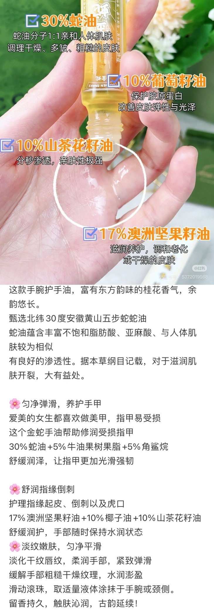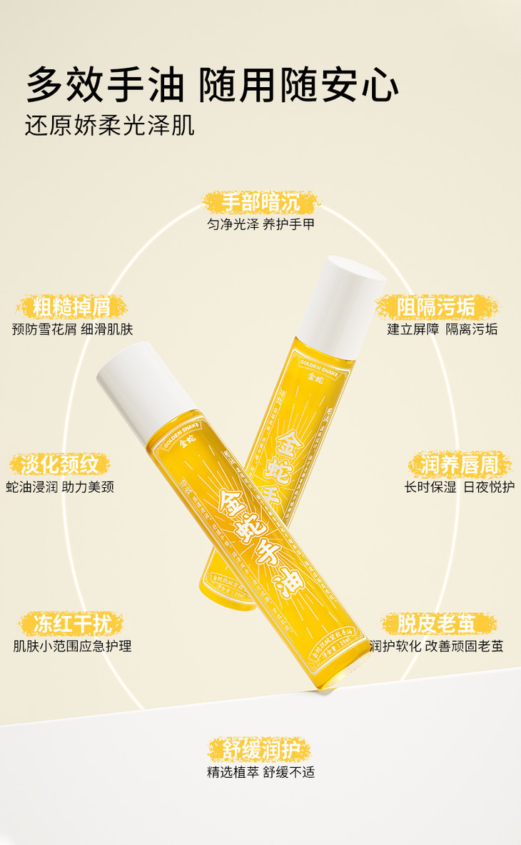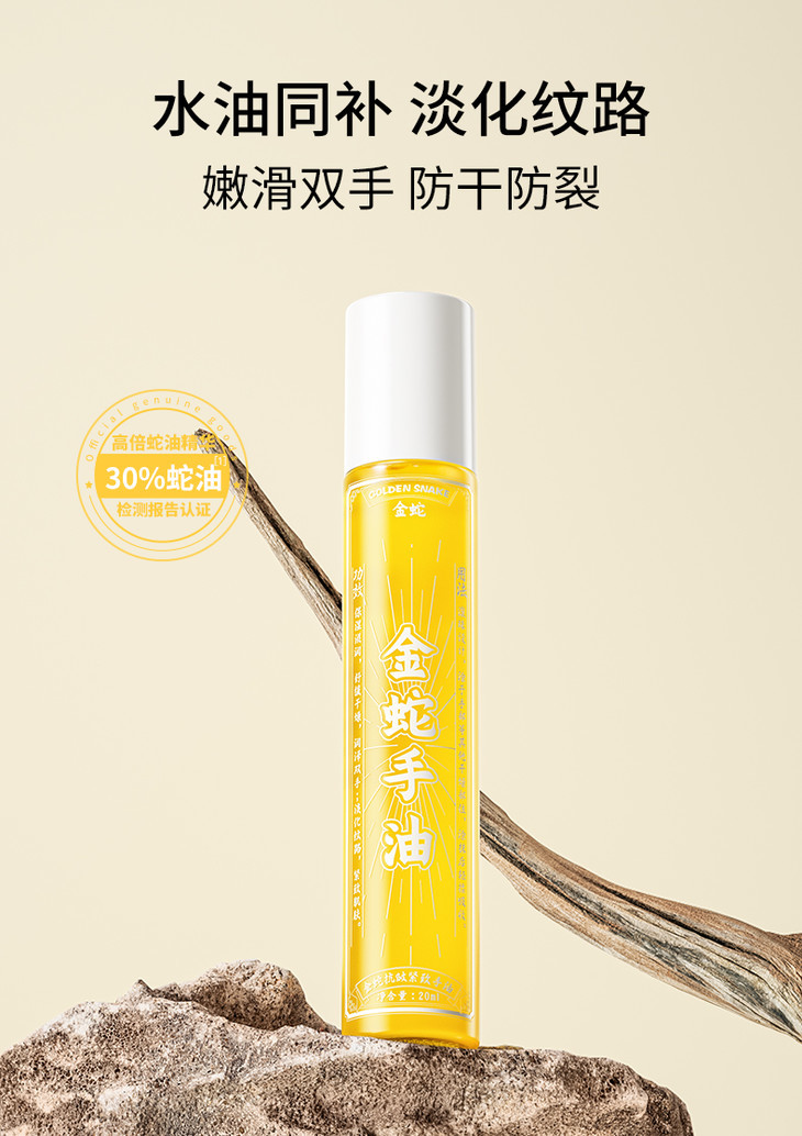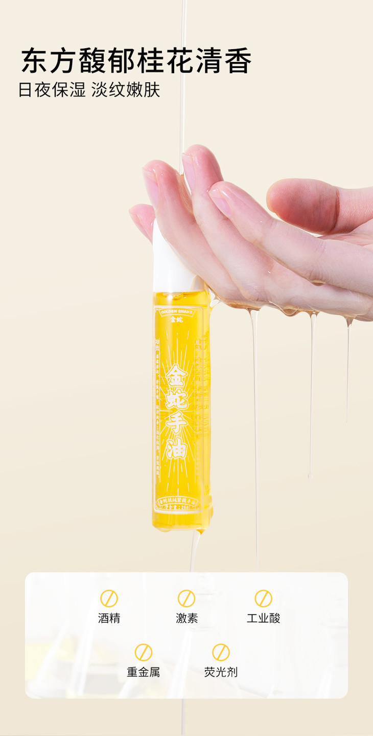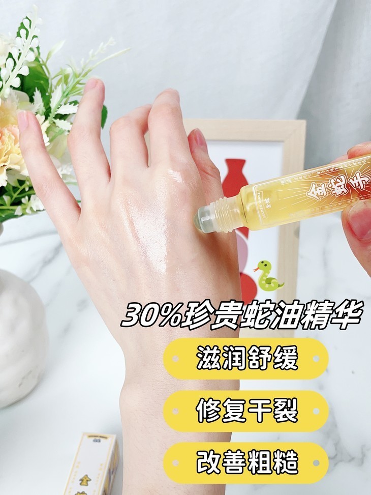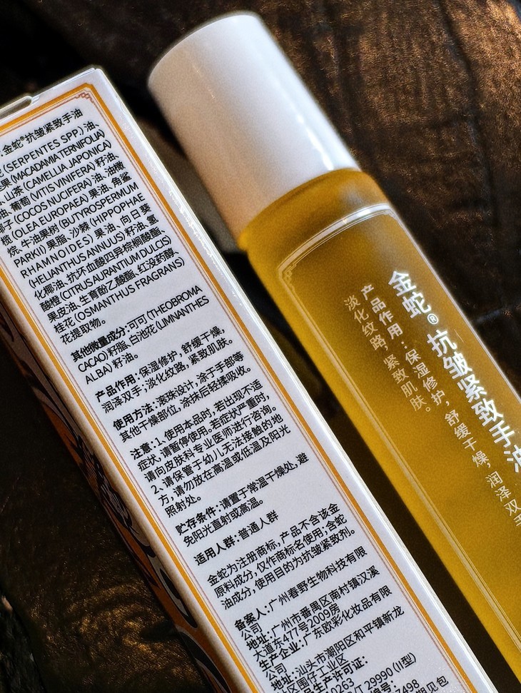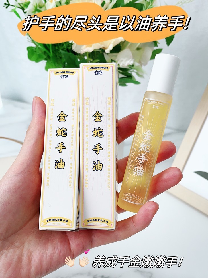 金蛇油膏上了后,真的,太受欢迎,还给我反向种草了金蛇手油,说也非常好用!我也赶紧让品牌寄了样品试试,别说,还真别说,润而不油,香香的,真不戳哦,尤其是对干裂倒刺,效果好,而且滚珠,很好涂!还有还有,涂嘴唇和眼周也OK的,可以当精华油!