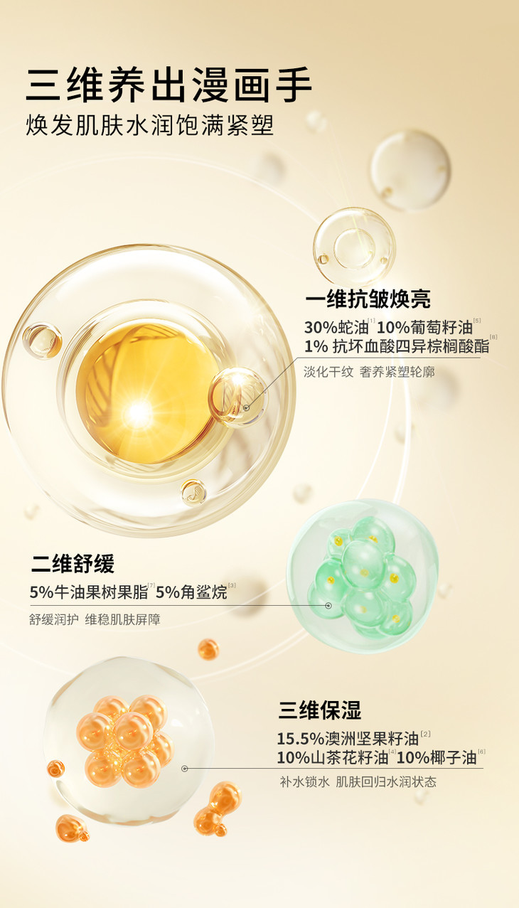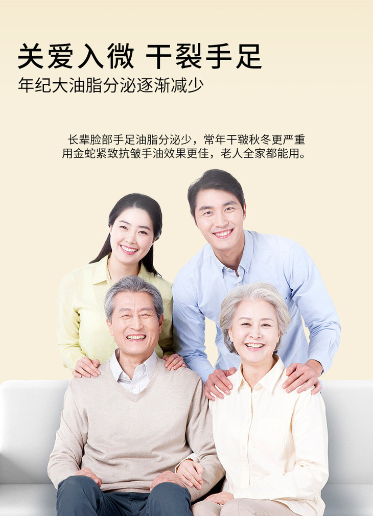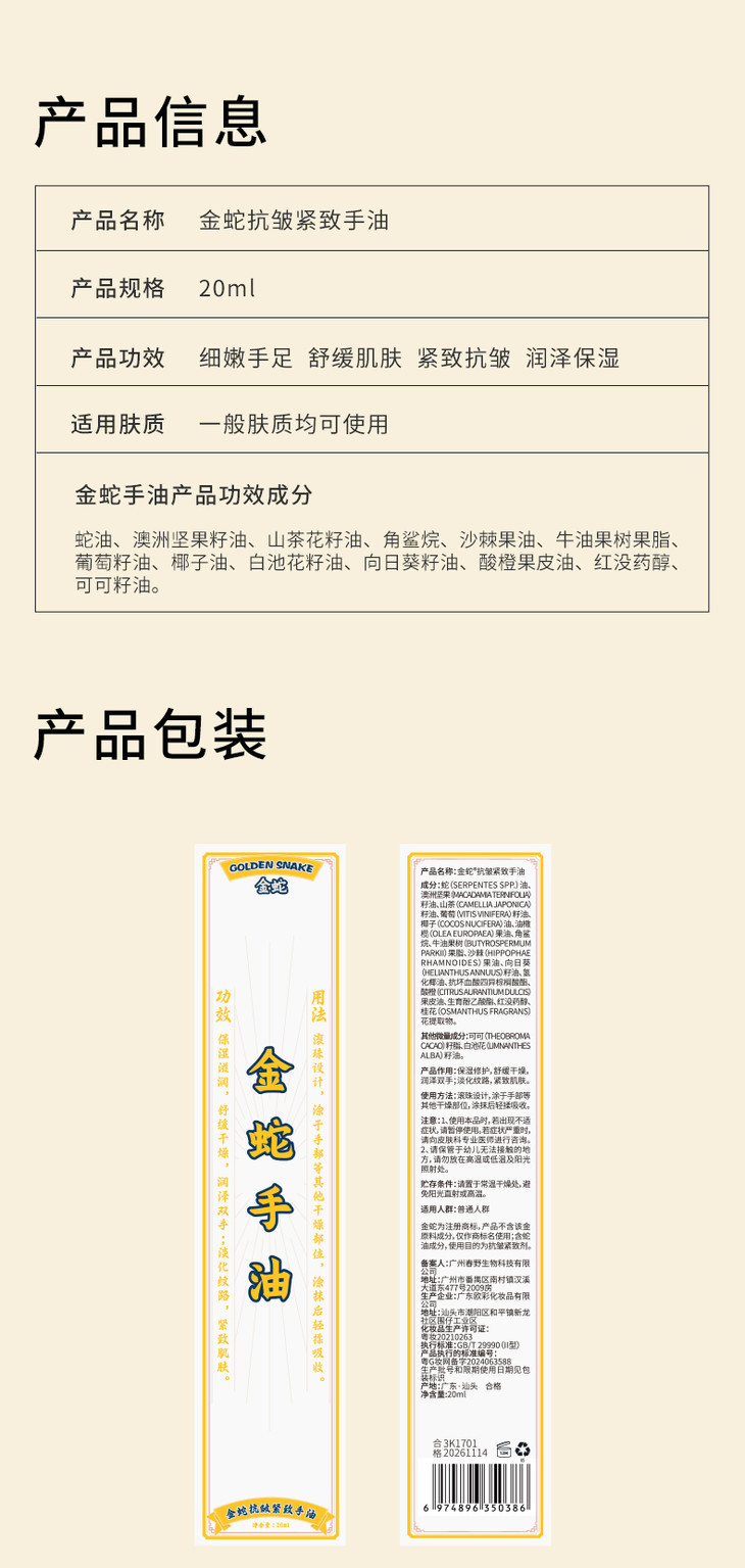 金蛇手油的成分也是一看就很好用!30%珍贵蛇油精华,帮助修复手部干裂、改善粗糙;葡萄籽油保护胶原蛋白,延缓皮肤老化;山茶花籽油增加渗透性,让其他成分更好地发挥作用;澳洲坚果籽油深层滋润。。。每一种成分都各司其职,给手部皮肤全方位的呵护!