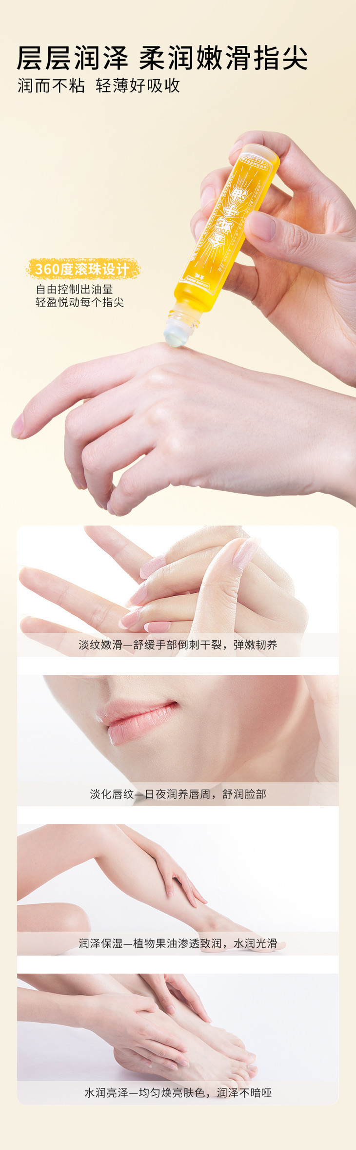 我自己用下来,感受最深的就是轻盈的质地,完全不油腻哦,涂完马上就清清爽爽,不会黏黏的,使用感很好!而且是20ml的便携装,出门真的很方便,随时随地都能拿出来涂一涂,让双手一直都能润润的!而且不是局限涂手哈,其实全身都可以,哪里干干涂哪里,这滚珠的设计,作为唇部和眼部精华油,超合适!