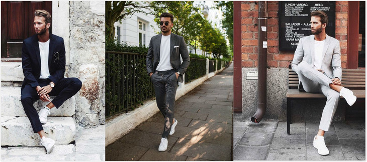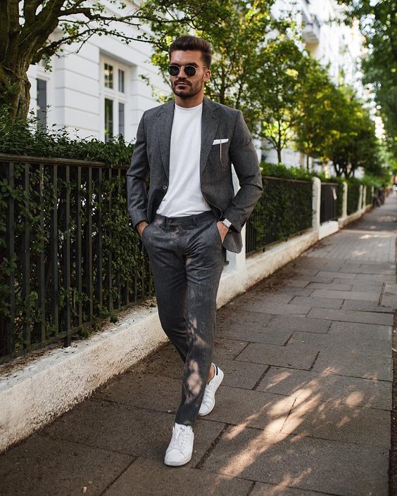 很多人喜欢西装,但又觉得西装衬衫全套太正式,内搭T恤吧,再换双小白鞋,这种穿法很多年轻人都很喜欢,休闲又街头。