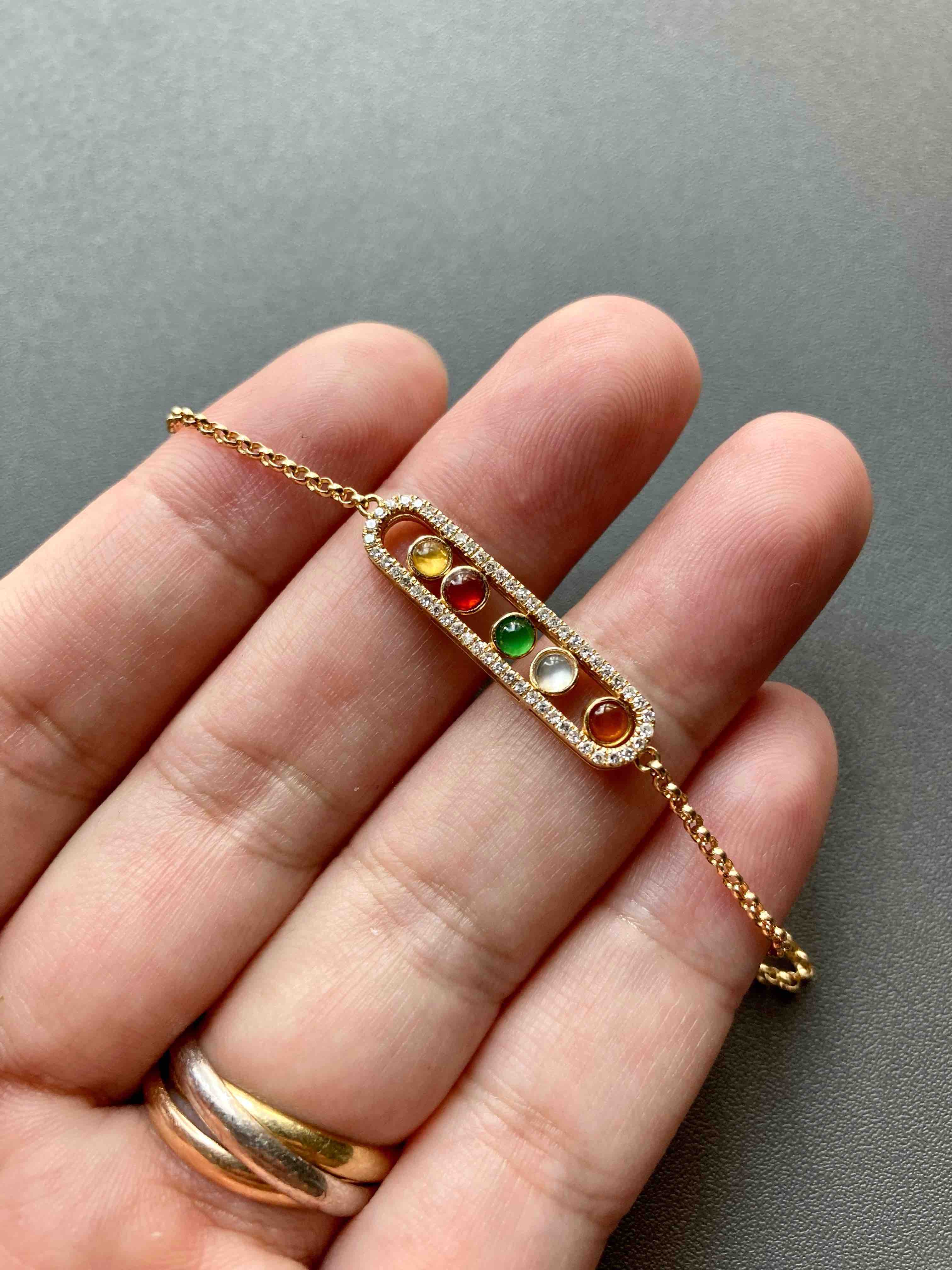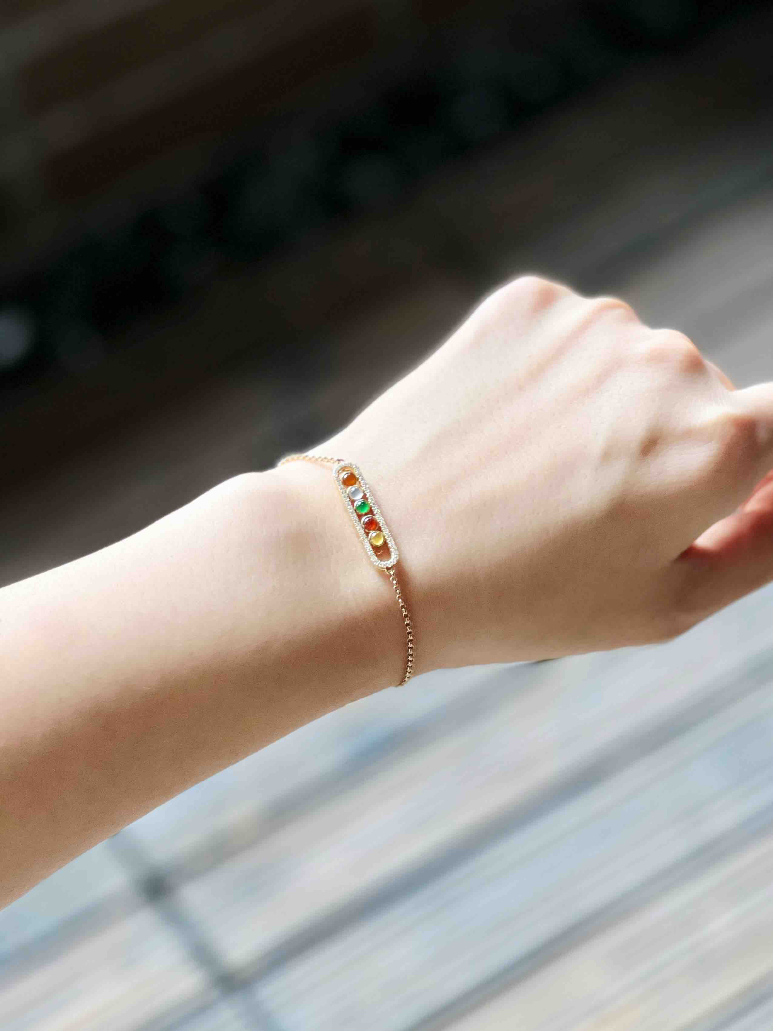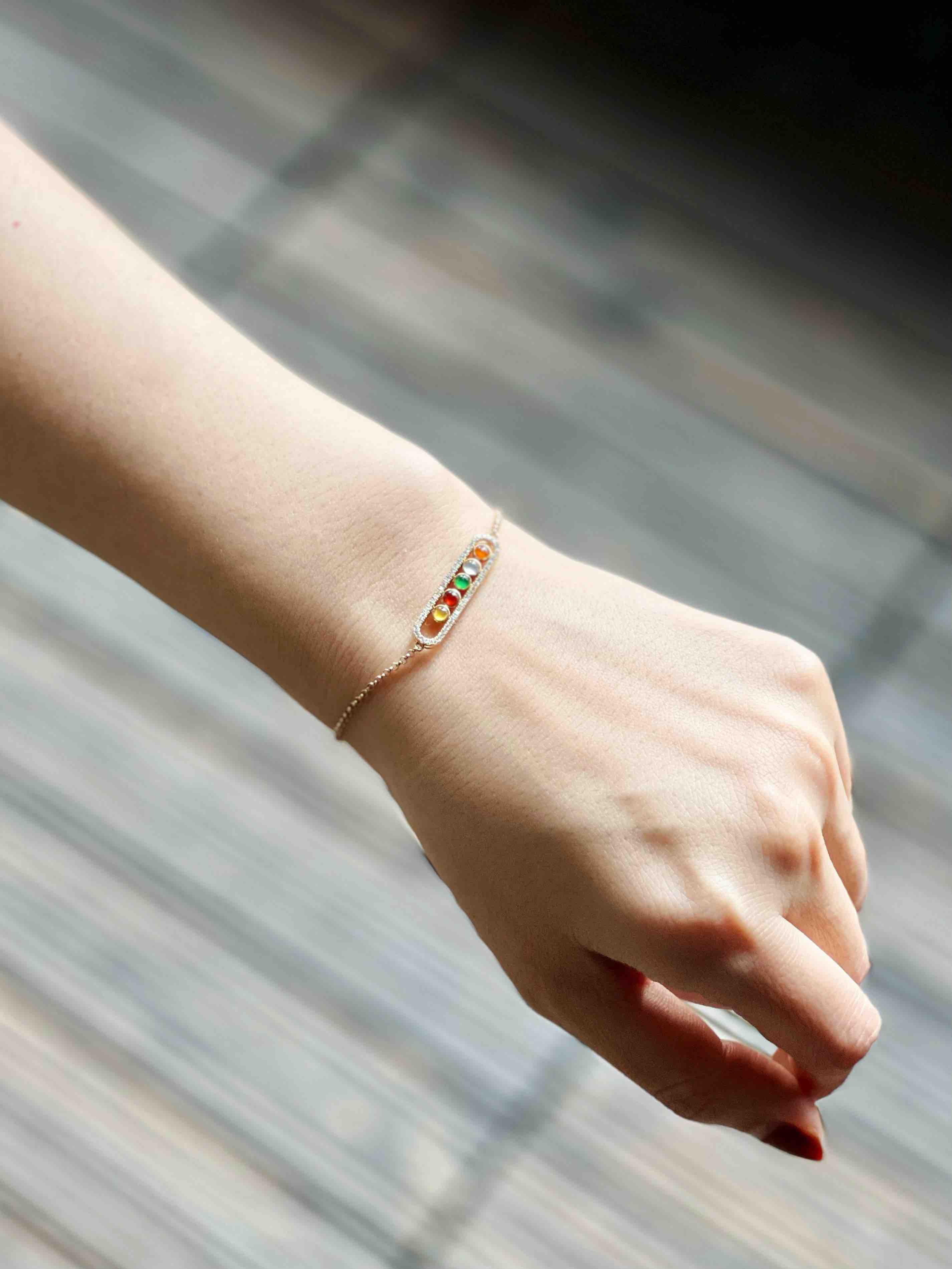 超特别,小可爱,五彩蛋面翡翠手链,红翡,黄翡,白冰,高冰种阳绿,每个蛋面都如此漂亮,18k黄金钻石镶嵌,小豆豆是可以活动的哦,太特别了,手链也是全18k黄金,就一条,赶紧