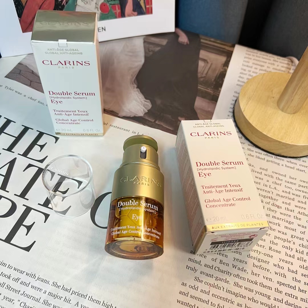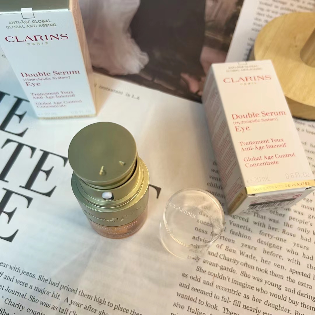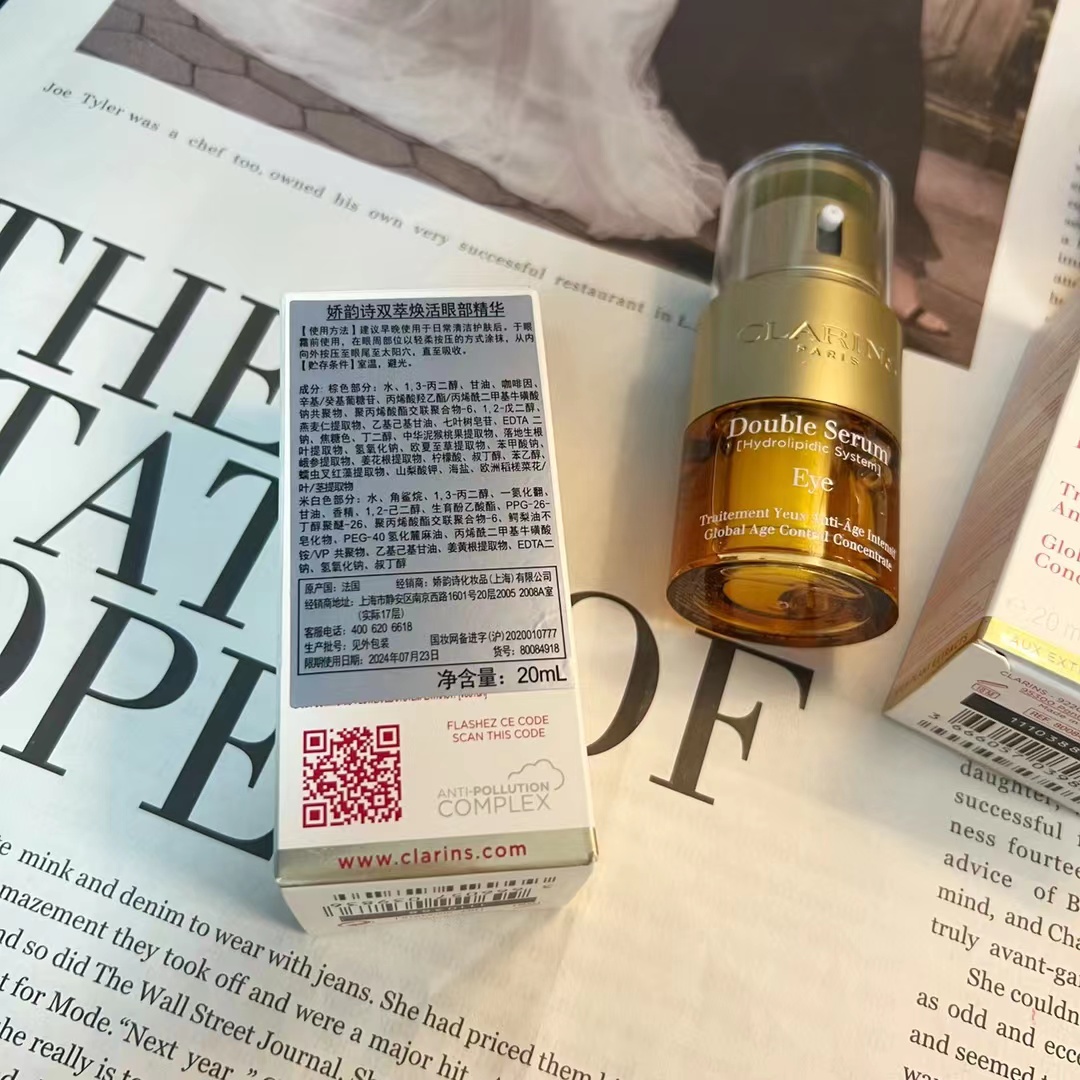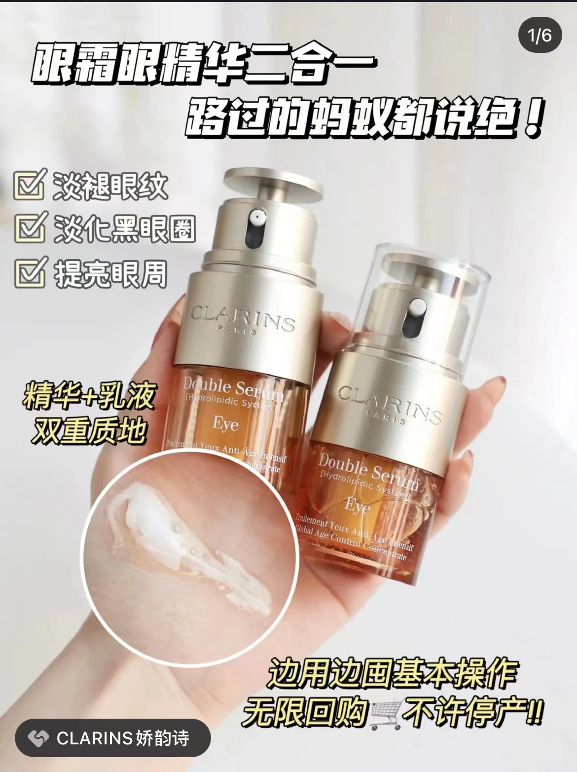 Clarins娇韵诗双萃眼霜20ml眼部精华➕眼霜双效合一,同样还是双管设计,有了它再也不用分开叠涂,打开还是熟悉的植萃香味,清新又好闻,乳液和精华二合一两种质地,温和不刺激,指尖混合均匀后轻按眼周,融合后上脸好吸收,深度滋润,抗衰去纹,提拉紧致双眼,去黑眼圈告白熊猫眼。