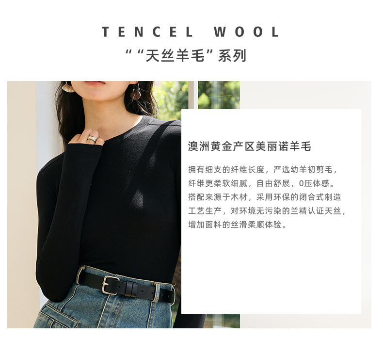 有时候精致往往就取决于一个小细节,比如面料,很多打底衫面料摸着偏硬。这款打底衫面料柔软,由47.5%的莱赛尔天丝+37.9%的腈纶+5.1%的醋纤+5.1%的氨纶+4.4%的绵羊毛制成。它的触感像什么呢?办公室的同事说,手感就像撸猫,柔软、轻盈、蓬松。这款打底衫用的羊毛部分,是澳洲产区的美丽诺羊毛。加上奥地利进口兰精天丝面料,也叫“莱赛尔纤维”,天然的植物纤维,对敏感肌也十分友好。不是所有莱塞尔纤维都叫“天丝”,只有天丝中的极品才能叫兰精天丝,这款打底衫使用的就是奥地利兰精公司出产的莱赛尔纤维原料,上身软软的。而且这款打底衫在制作过程中,还加入了三菱集团的美雅碧发热纤维黑科技锁温技术,让纤维呈现更好的保暖性。另外,这款打底衫,还加入了具有出色抗皱性的腈纶、以卓越弹性而闻名的氨纶等进行混纺。