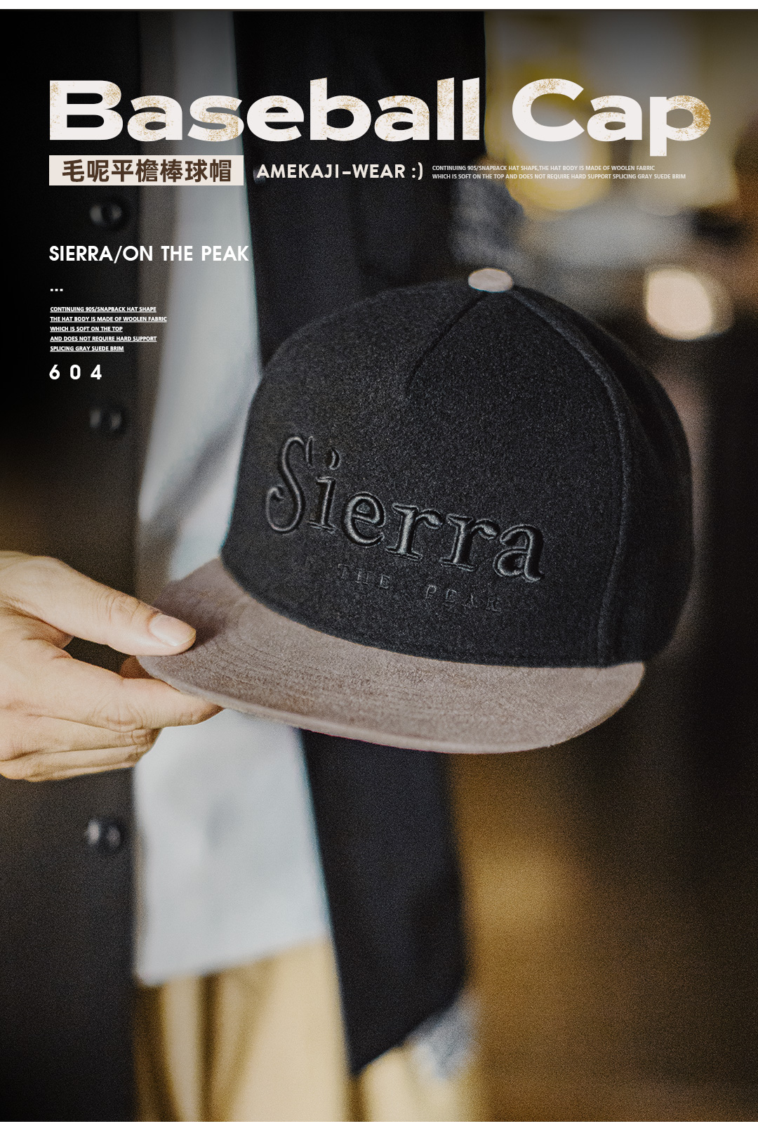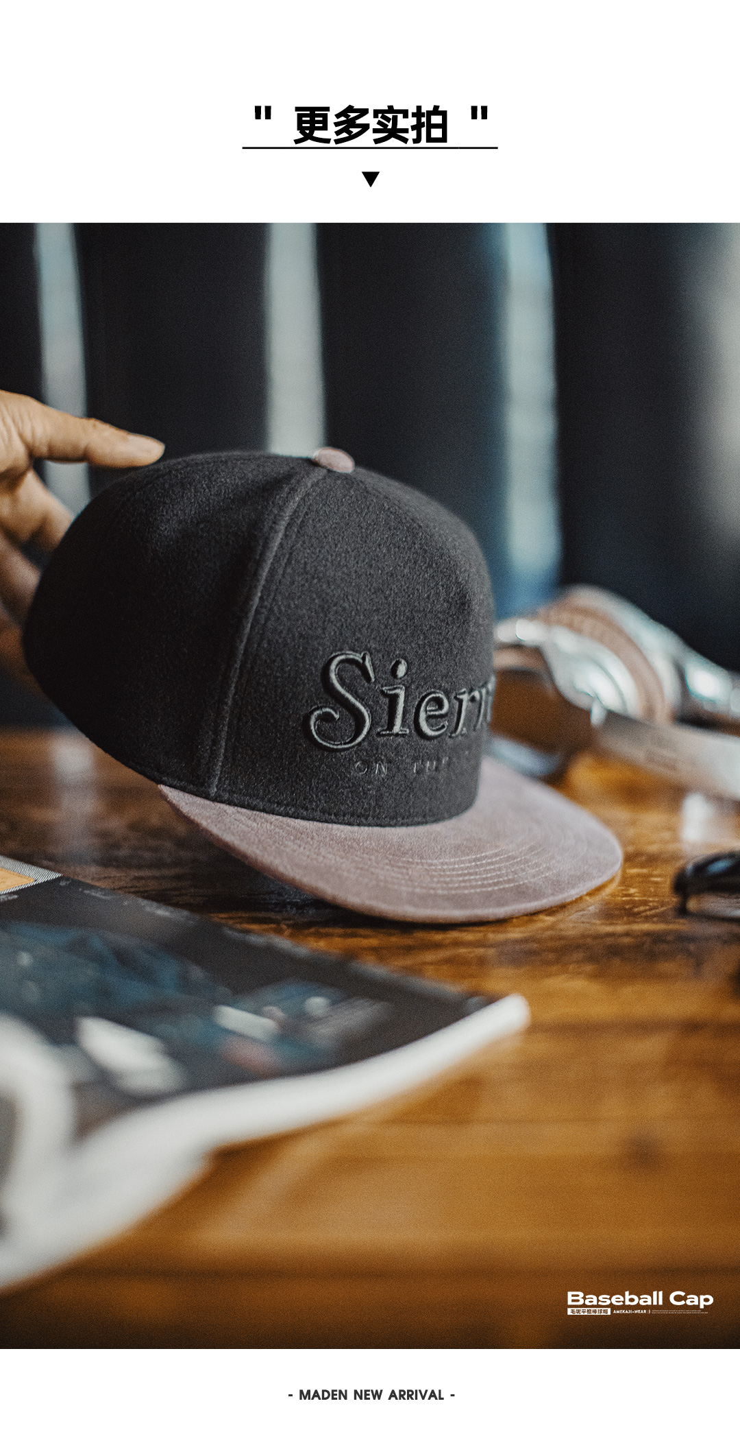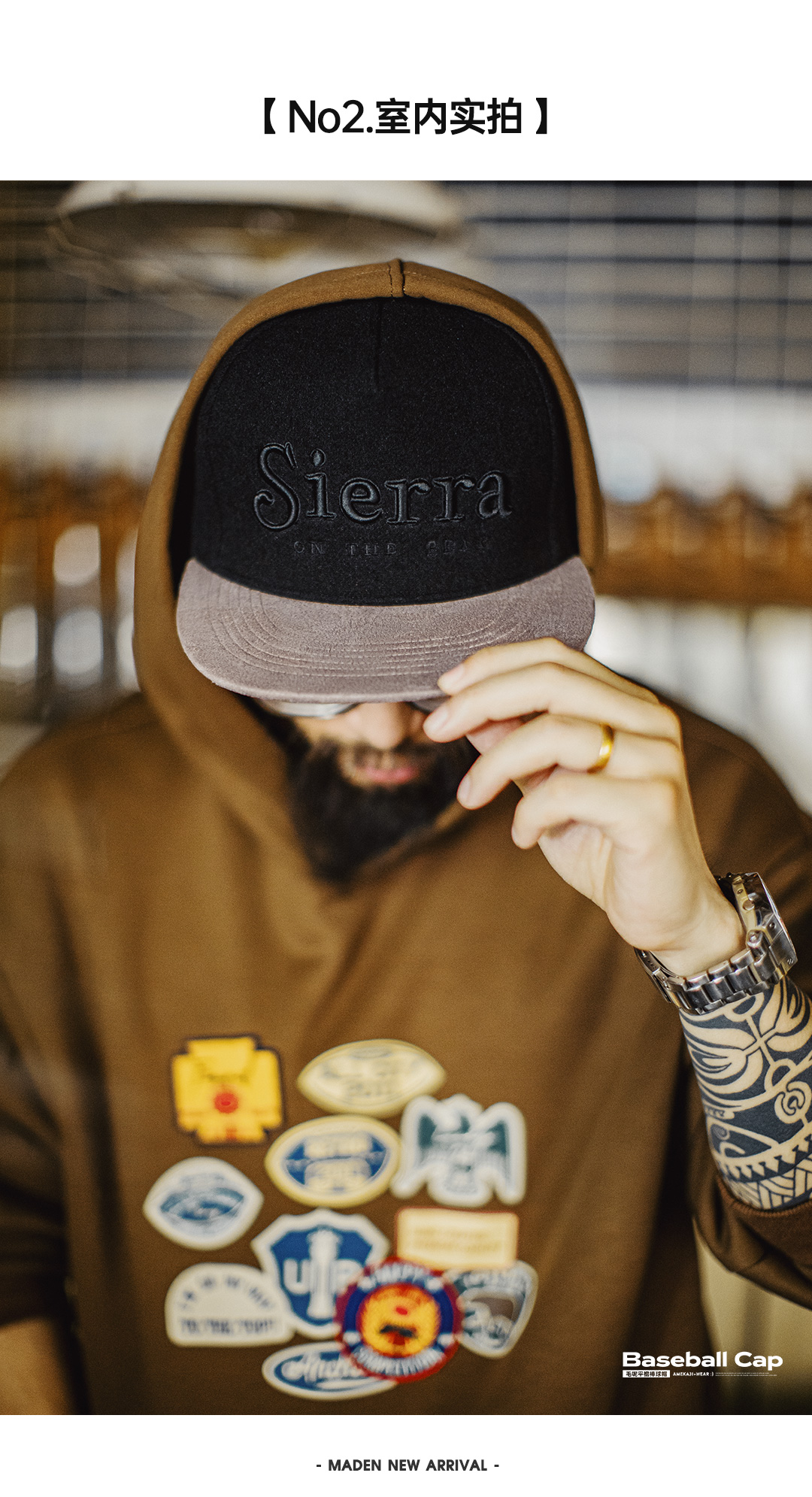 马登工装美式平檐棒球帽黑色毛呢刺绣鸭舌帽子五片嘻哈帽男款秋冬