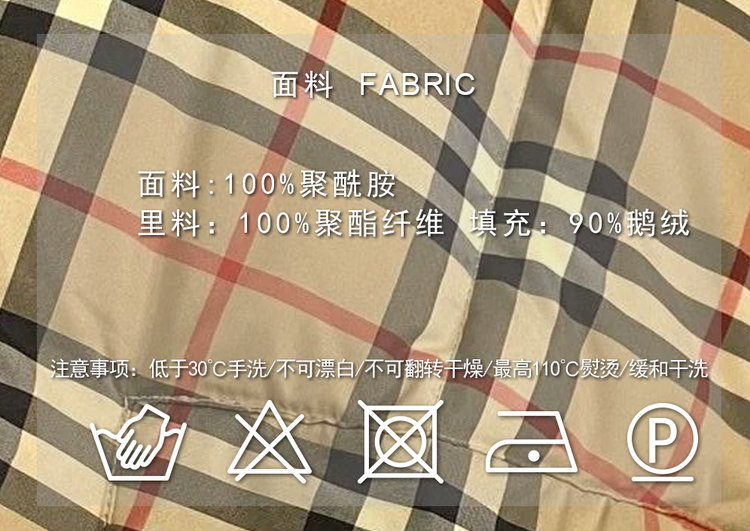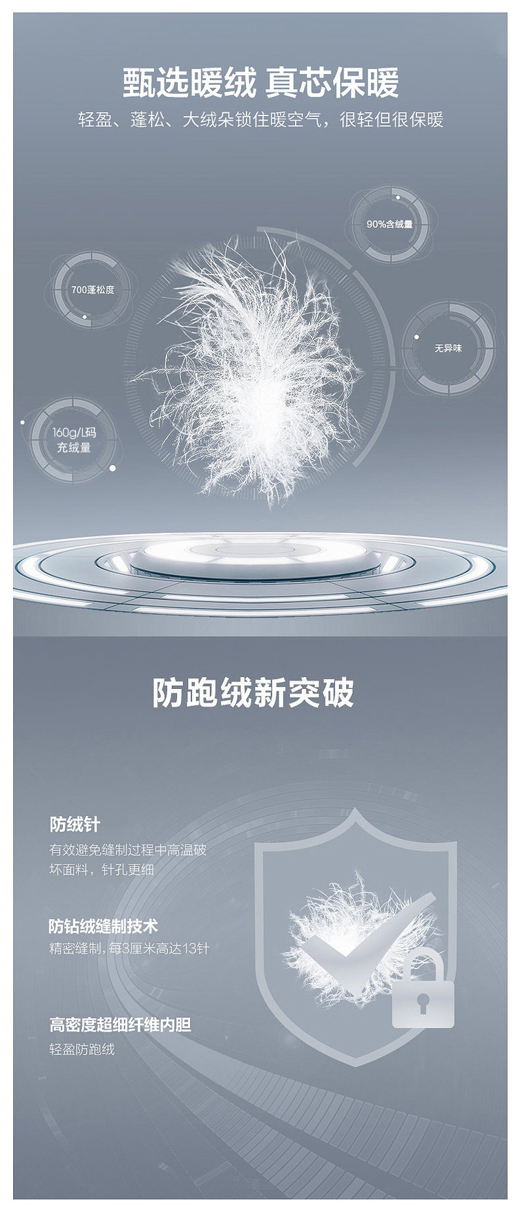 底布:则使用了35D超柔聚酯纤维,便于日常的贴身穿着,配合内胆的绗缝工艺将羽片牢牢固定,双重防绒设计,钻绒、移位的情况便不会发生,它看起来很厚,却不会显得臃肿膨胀,恰到好处的修饰身形。