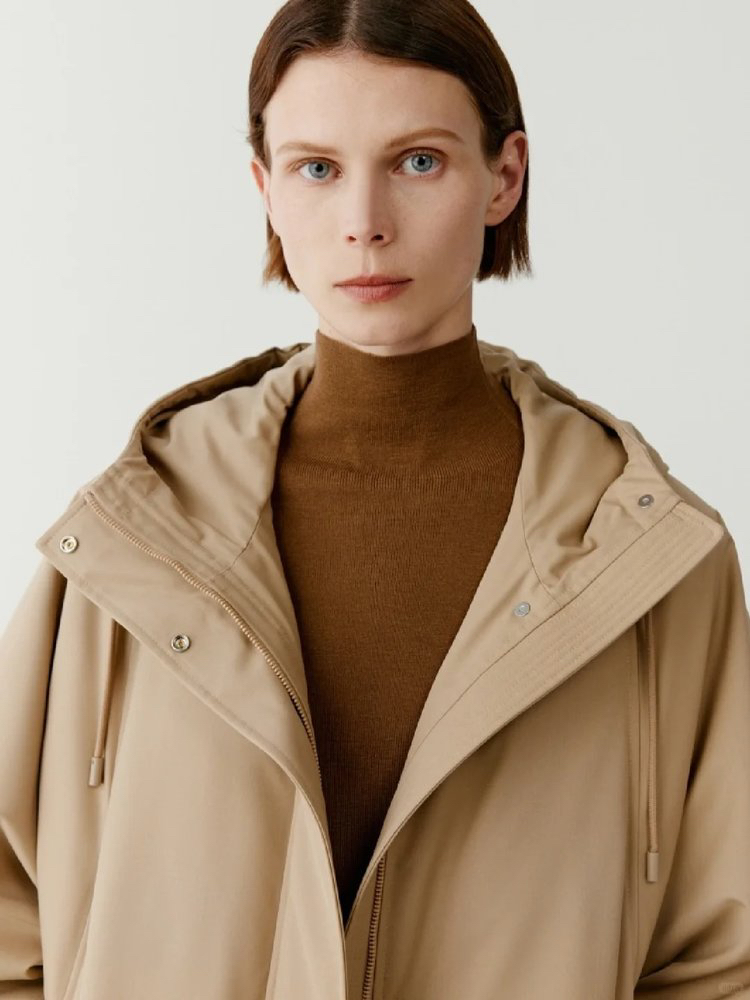 由美丽诺羊毛和真丝织就,羊毛纤维经预拉伸和暂定型,织物密度高,自然无惧风雨。