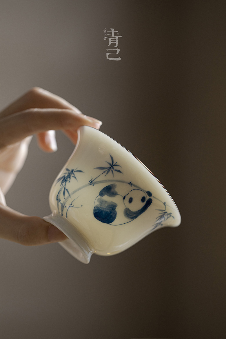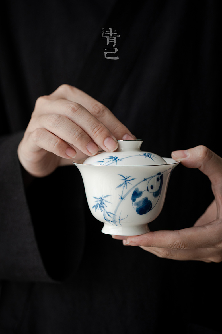 永利汇青己玉瓷盖碗青花手绘釉下彩白瓷茶具家用泡茶碗熊猫戏竹隐欲茶碗