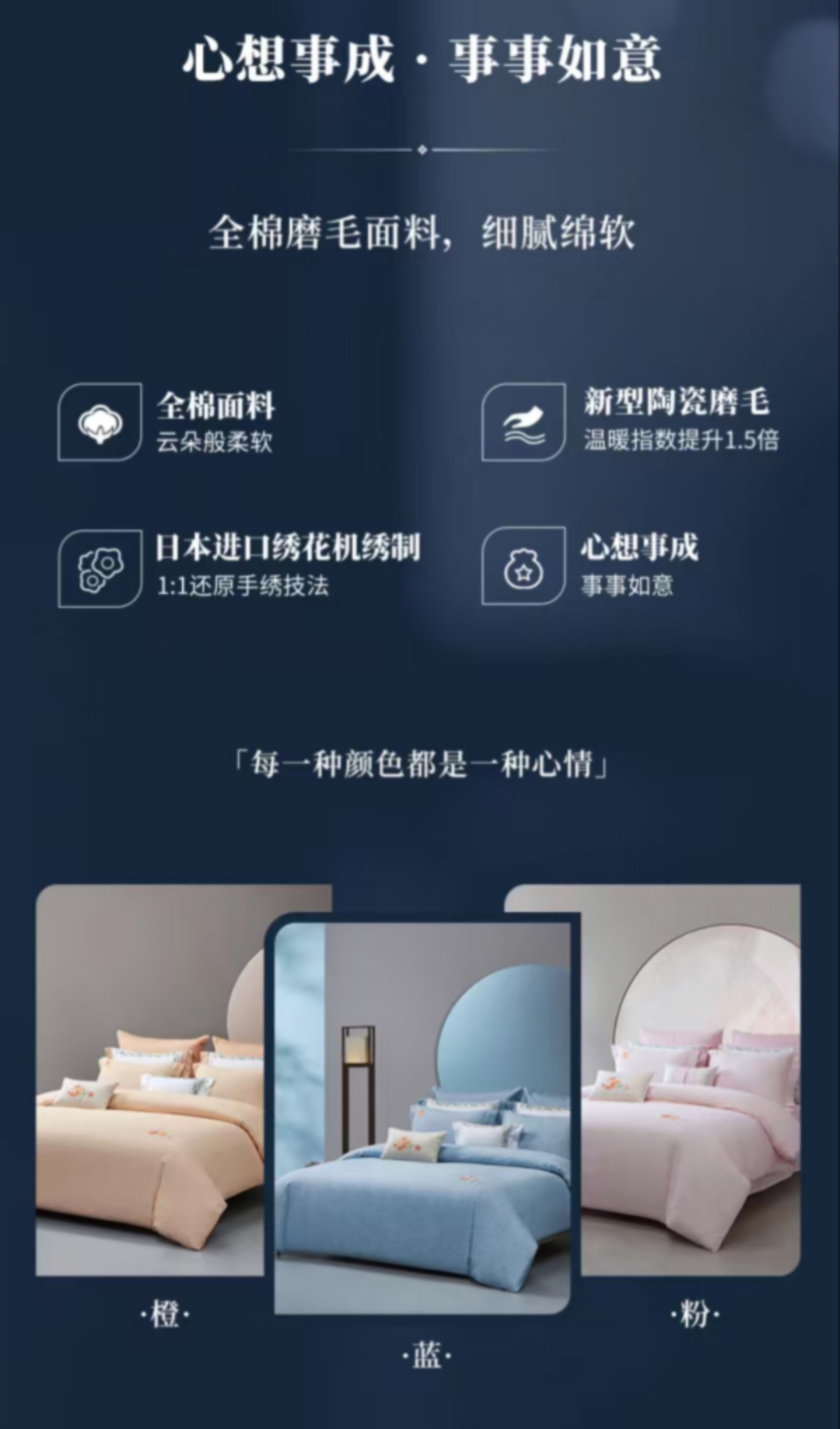 10楼 梦洁 全棉磨毛印花面料.心想事橙蓝.吊牌价1999现价1199