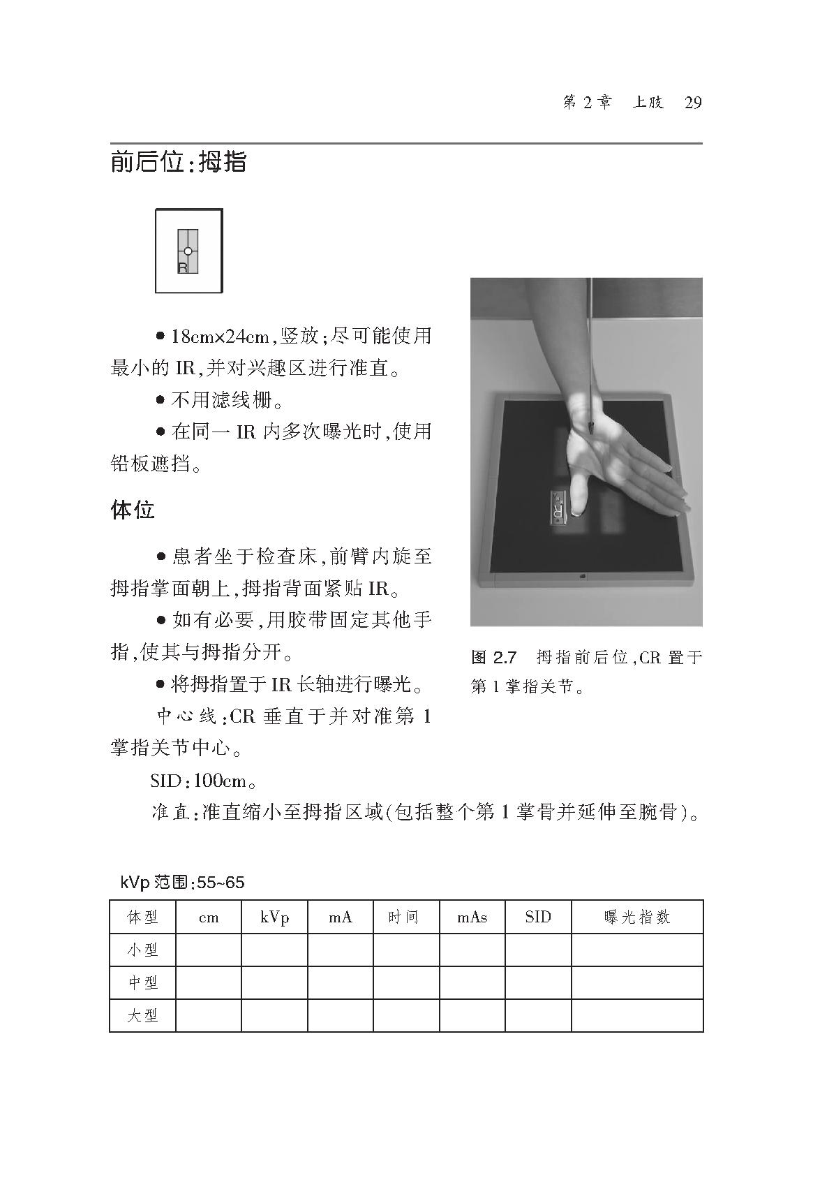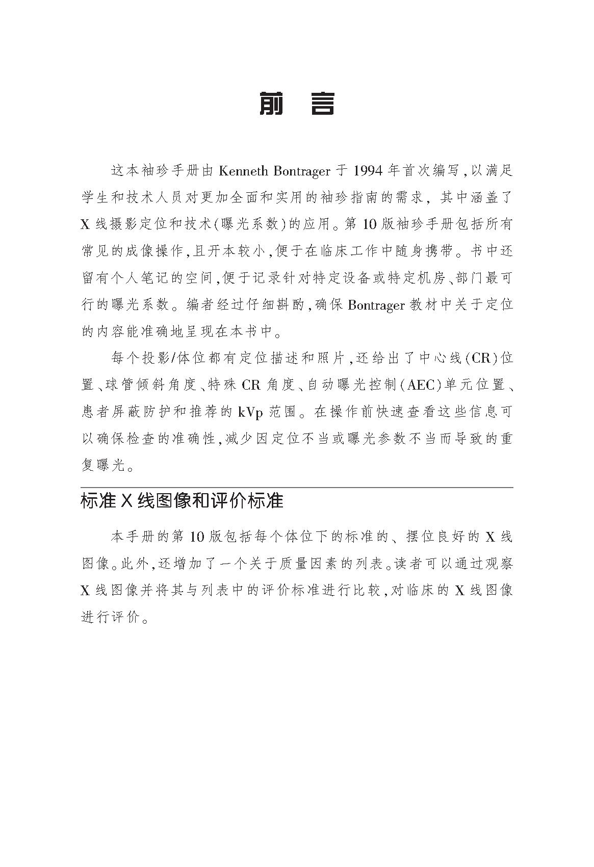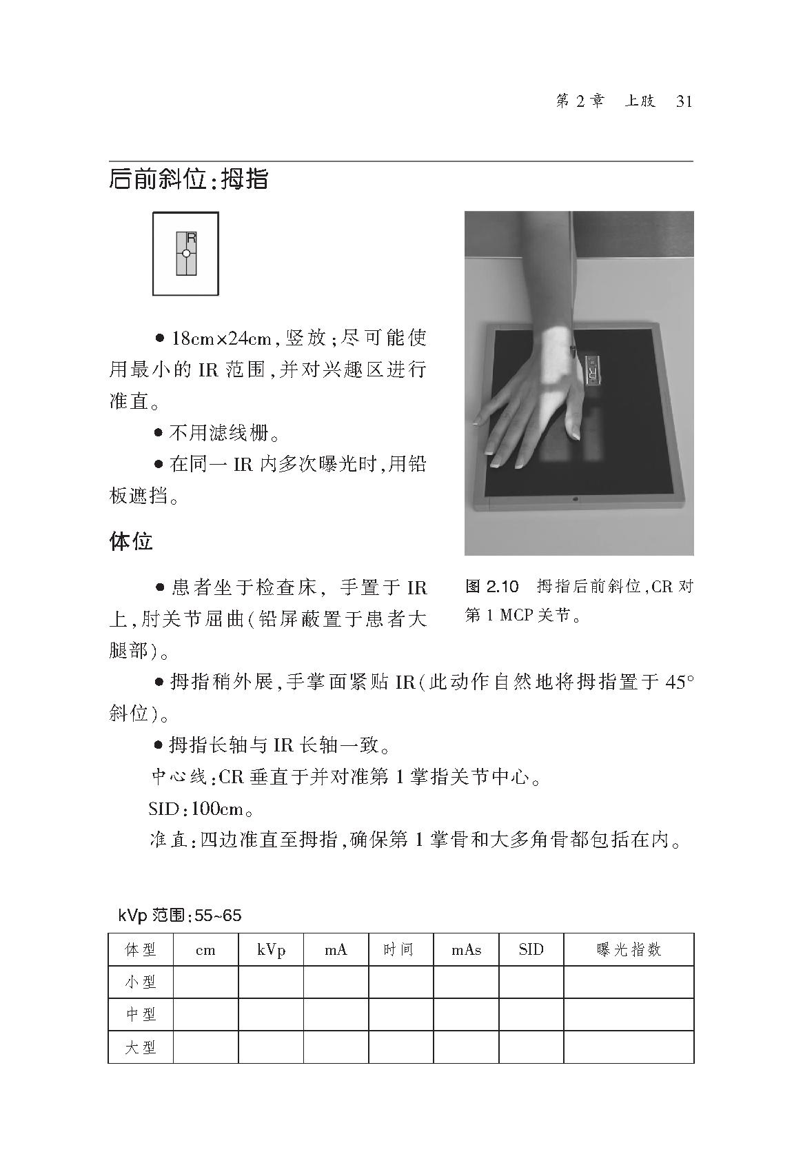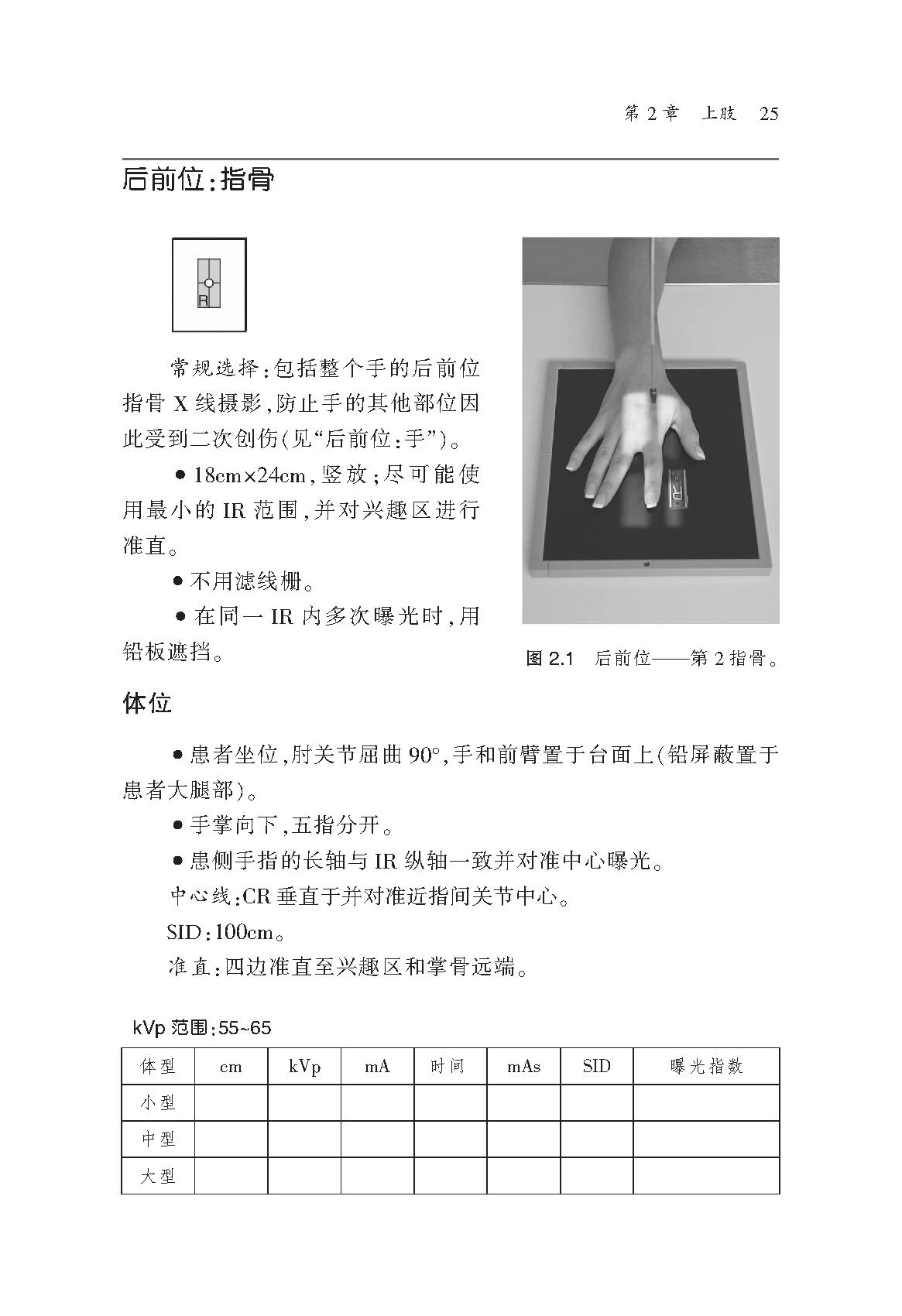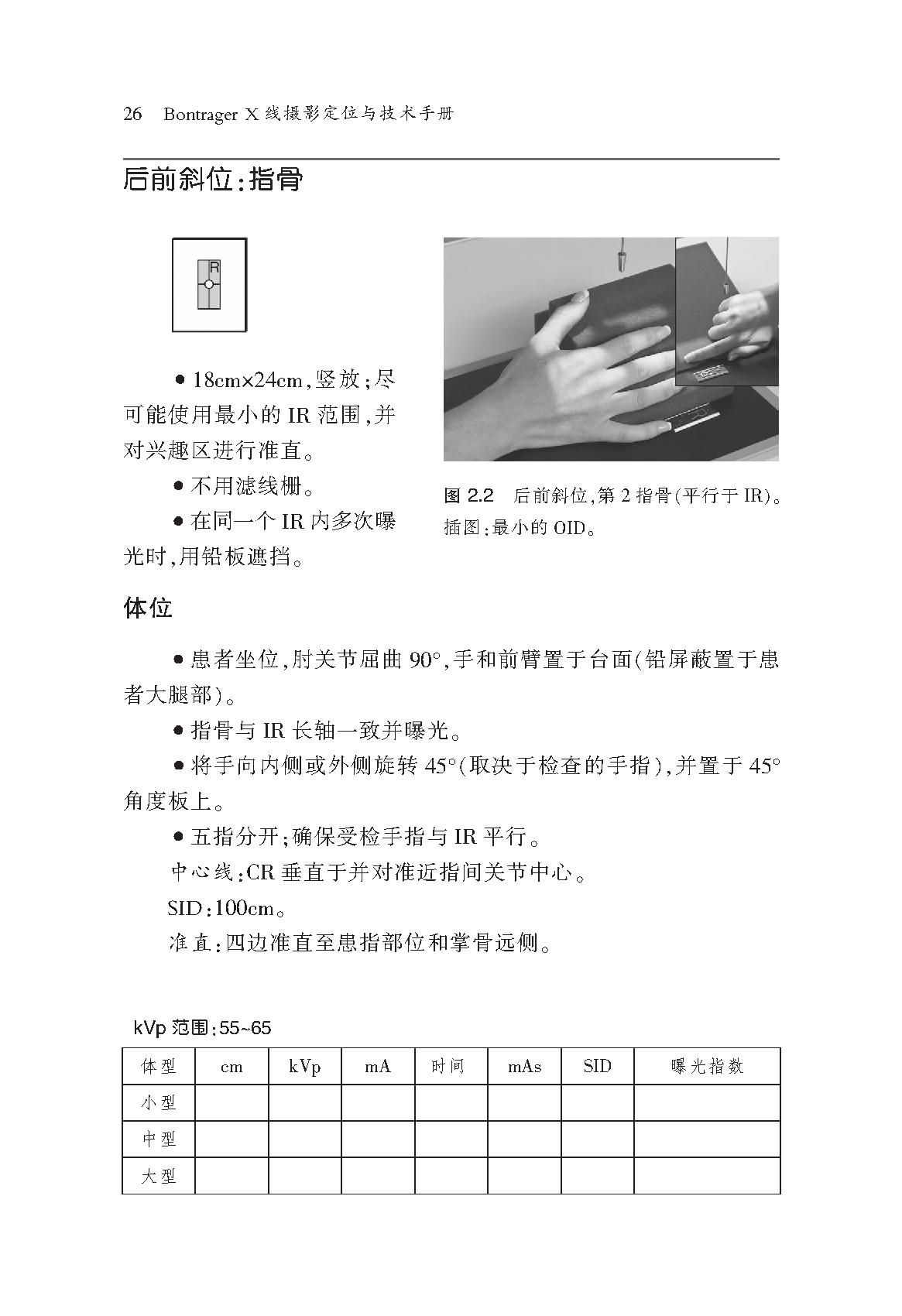 •每个体位后附带空白表格,以便读者记录自己所获的最佳X线摄影图像相关参数,用以日后对照、参考。