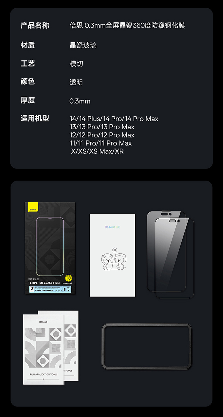 倍思 0.3mm全屏晶瓷360度防窥钢化膜(蜂窝防尘)For iP 12系列 透明(单片装 含:清洁包*1+贴膜神器*1)