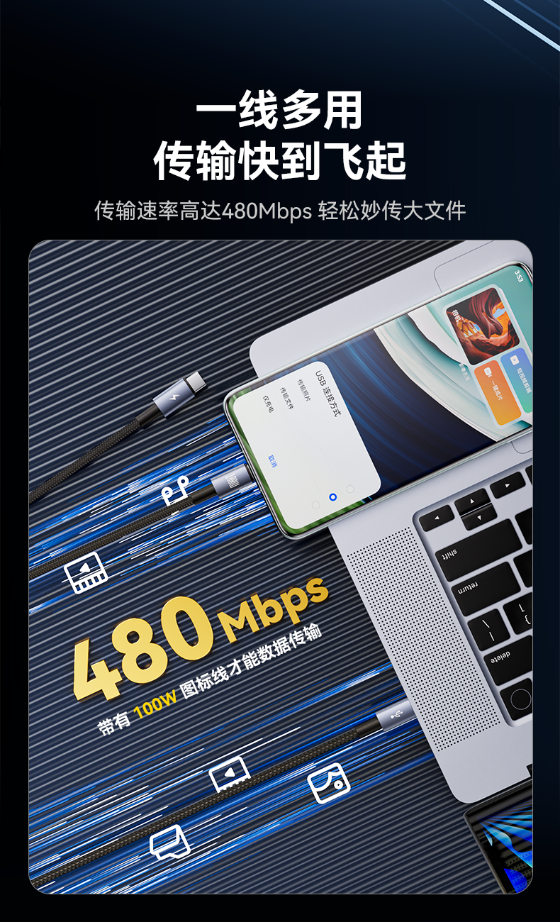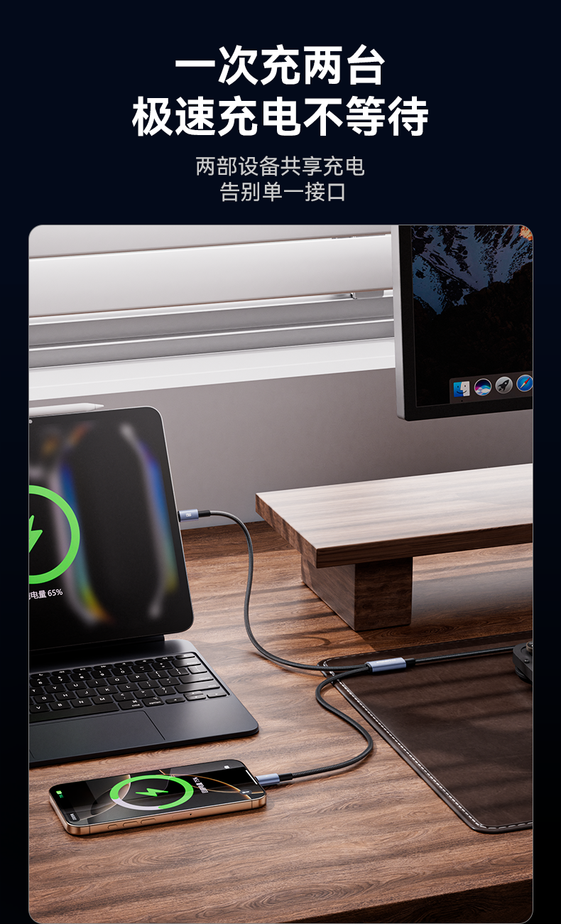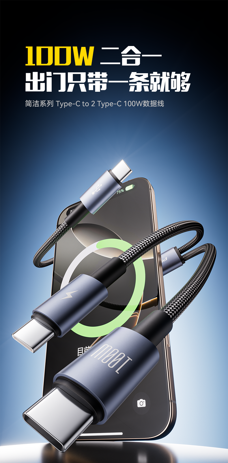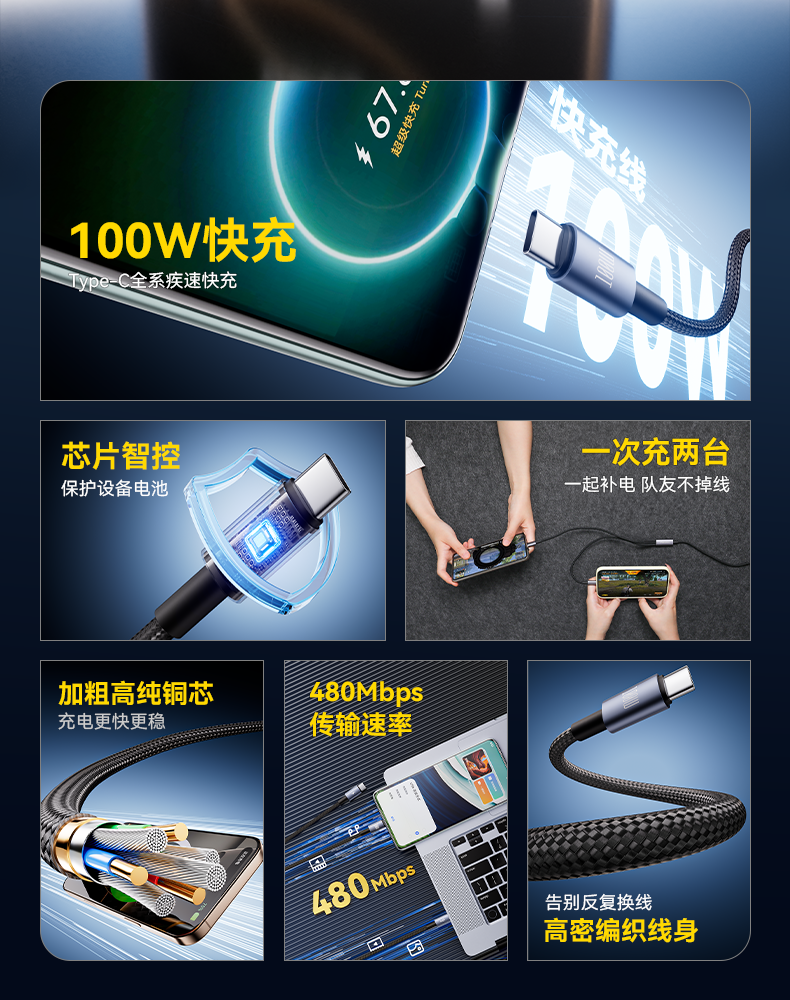 品胜 简洁C to 2C 100W快充编织线1.5米 支持苹果华为/小米/VIVO等设备快充