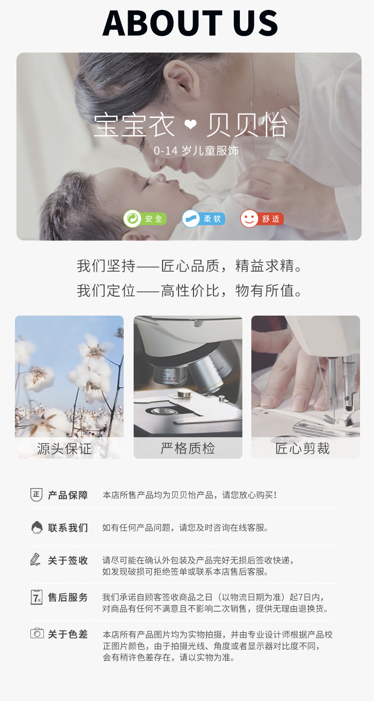 - 贝贝怡专注0-6岁婴幼儿服饰,坚持安全、柔软、舒适的产品理念,为千万中国家庭提供超高品质、安全可靠的婴幼儿服饰产品,妈妈放心,宝宝开心!