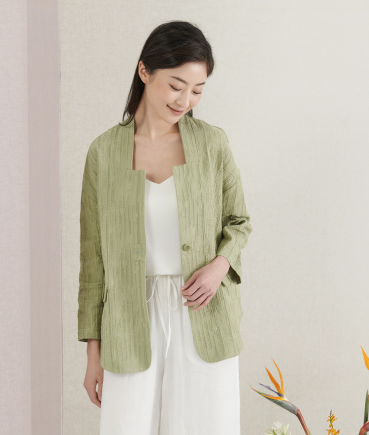 改良式西装小立领设计,修饰颈部线条,干净利落,清爽气质。