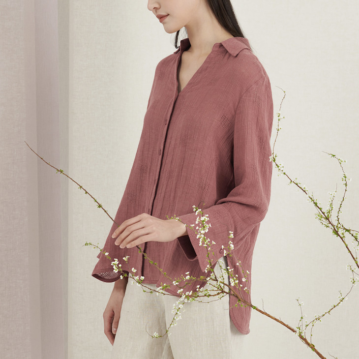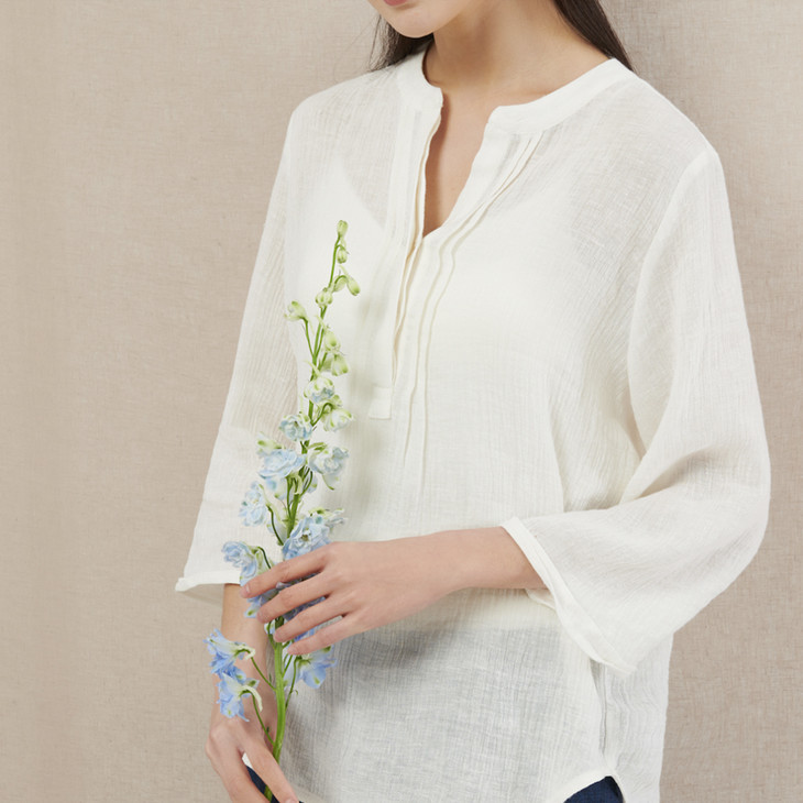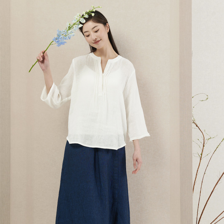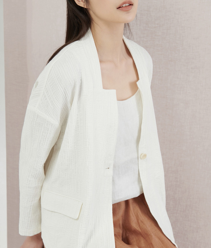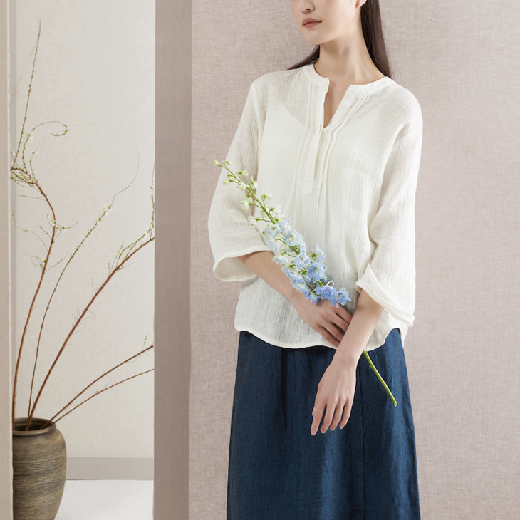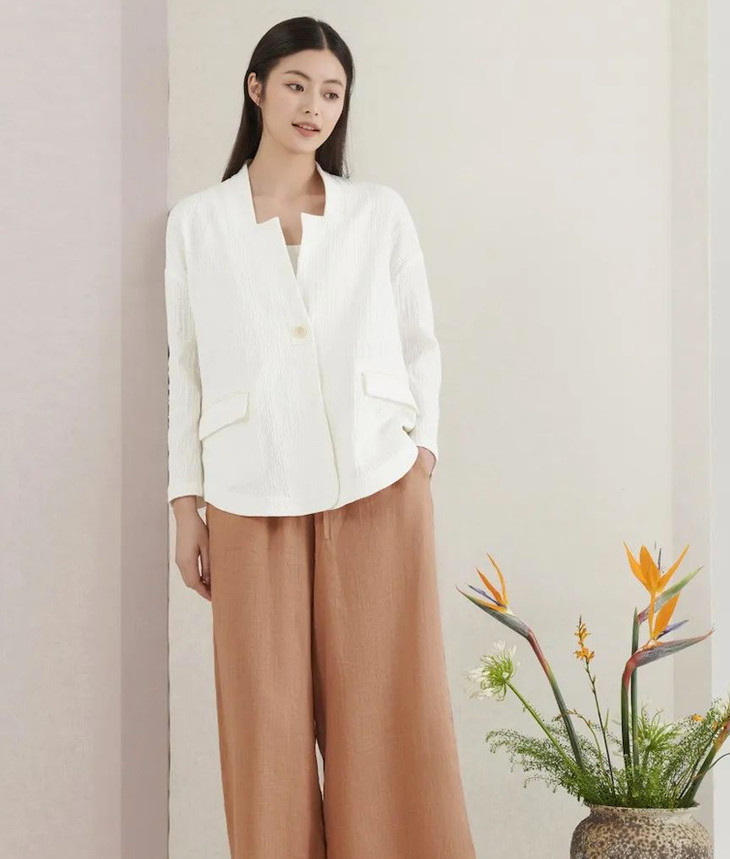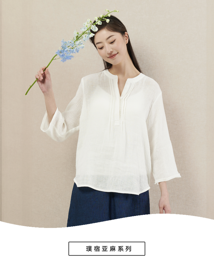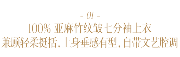 100%亚麻面料,特制竹纹皱肌理,兼顾轻柔挺括,上身垂感有型,自带文艺腔调。