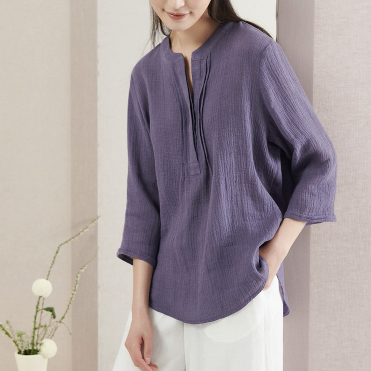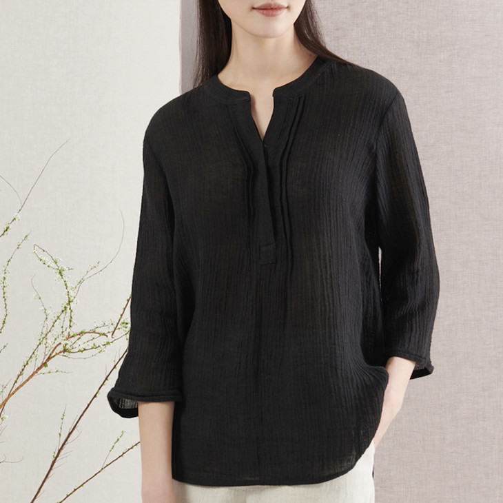 半门襟设计,搭配压皱抽条,赋予衣身几分率性灵动。