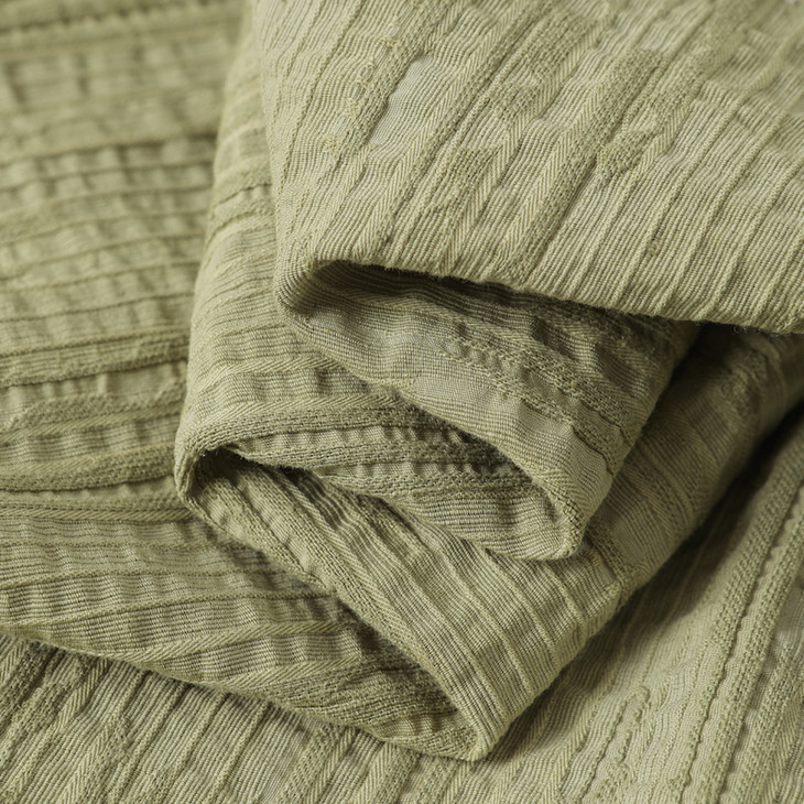 经过特殊水洗后整工艺,表面会呈现凹凸不平的微皱竹纹肌理,舒适自然。