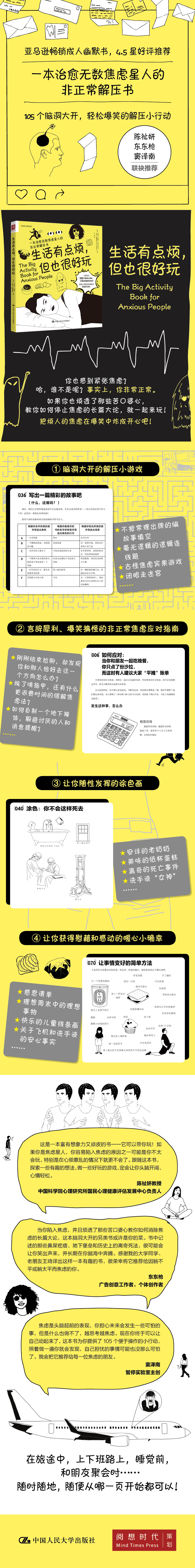无论你的焦虑是严重到需要专业帮助(在这种情况下,你还愿意求助,值得庆贺),还是轻微到你仍能安然度过*天,没有崩溃(这种情况,也值得庆贺),这本书简直就是为你准备的。书里有一页页的各种活动,能让你感觉不那么孤单,还能带给你灵感以笑对恐惧,甚到它还帮你想好了,当凌晨三点你清醒无比,还在担心邮件是否抄送给正确的“鲍勃”时,你还能做什么(其实你的收件人应该是对的)。