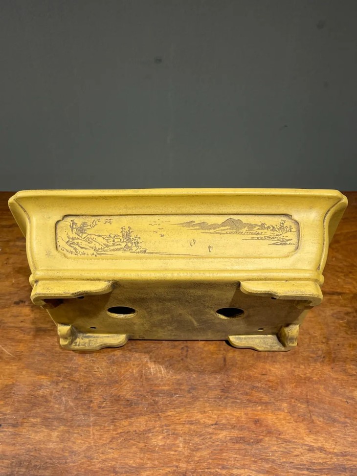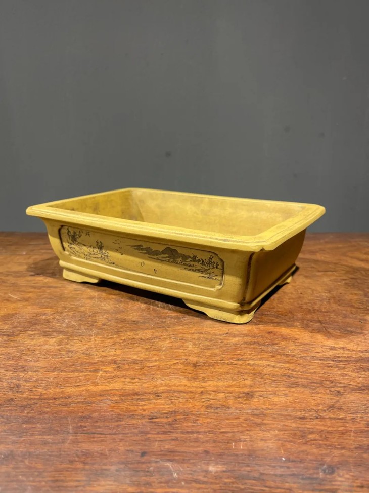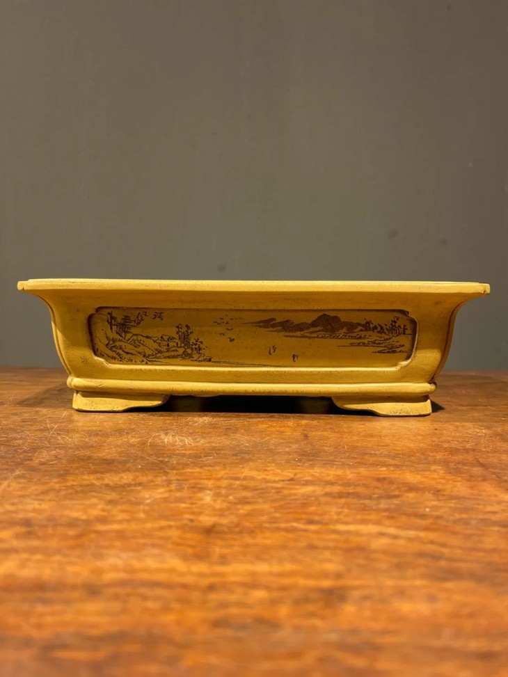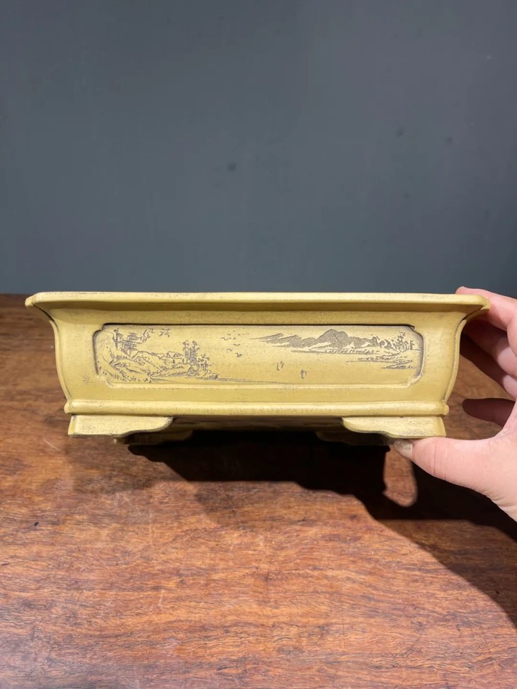这是一只以宜兴黄胎紫砂制作而成的刻山水纹长方型花盆,折沿深腹长方型盆,前后外壁阴刻山水纹与书法:“靜則藏神”,,底部作坊印章款,造型典雅贵气,黄胎宜兴紫砂材质朴实、纹饰及造型文雅,特显文人气质,是解放后60/70年代的宜兴紫砂花盆。