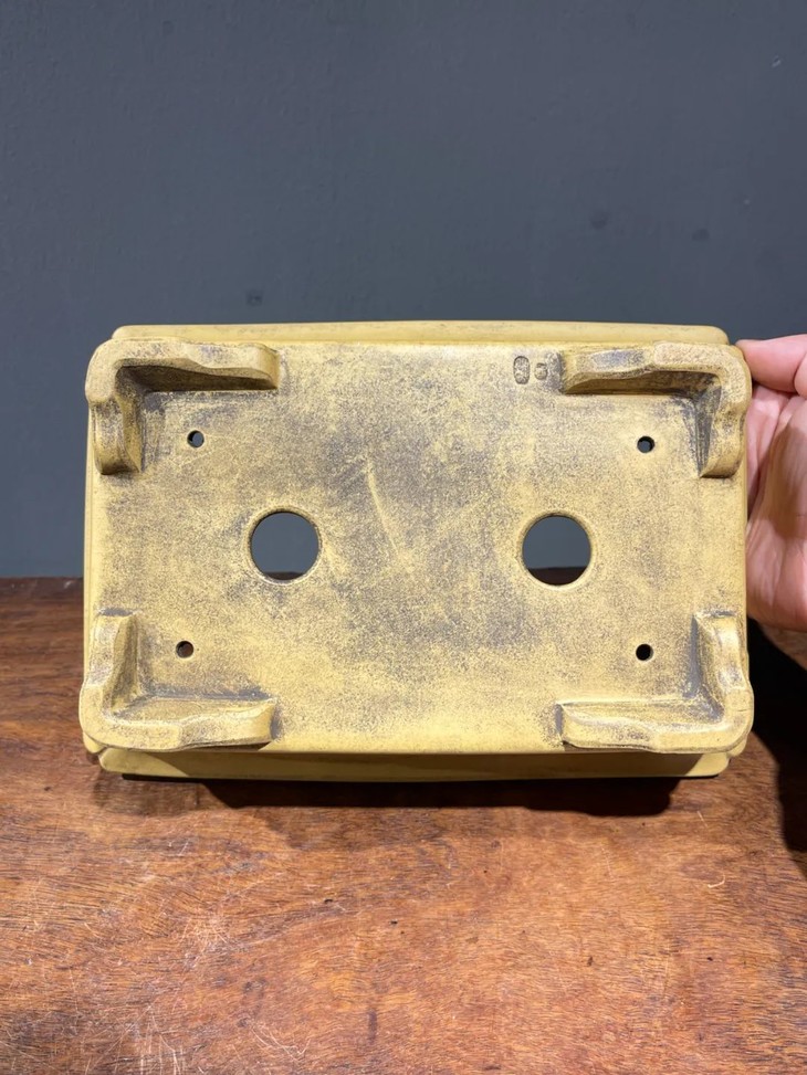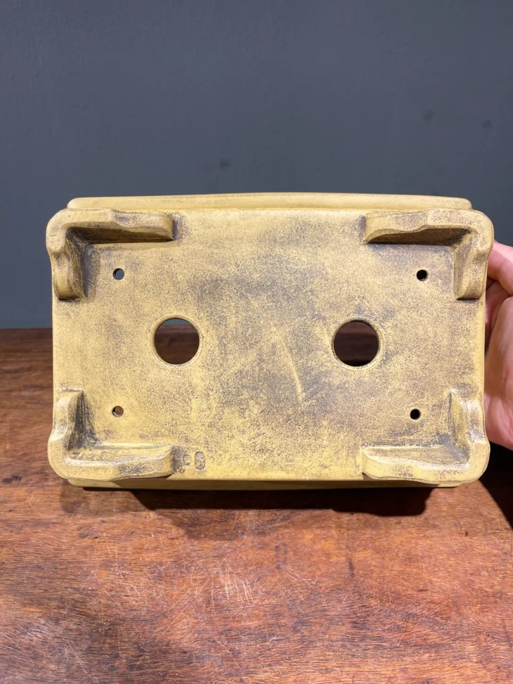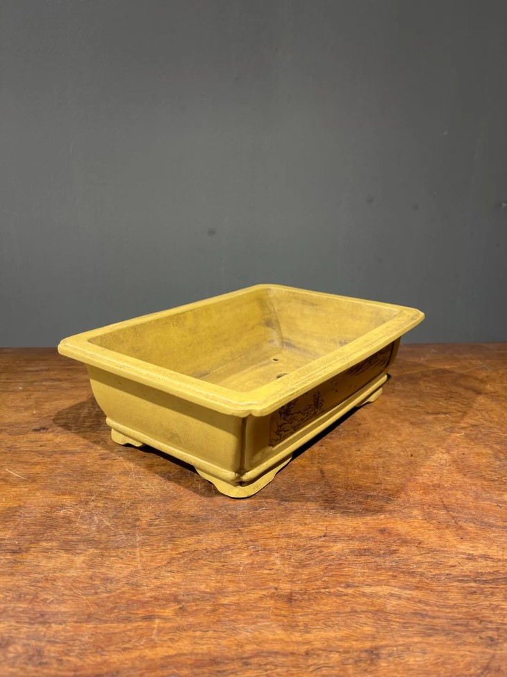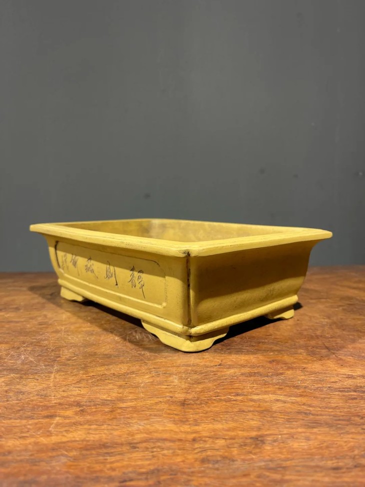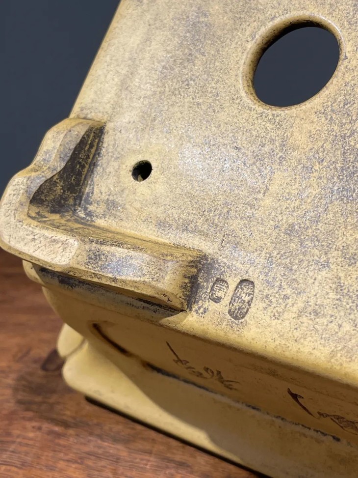 这是一只以宜兴黄胎紫砂制作而成的刻山水纹长方型花盆,折沿深腹长方型盆,前后外壁阴刻山水纹与书法:“靜則藏神”,,底部作坊印章款,造型典雅贵气,黄胎宜兴紫砂材质朴实、纹饰及造型文雅,特显文人气质,是解放后60/70年代的宜兴紫砂花盆。