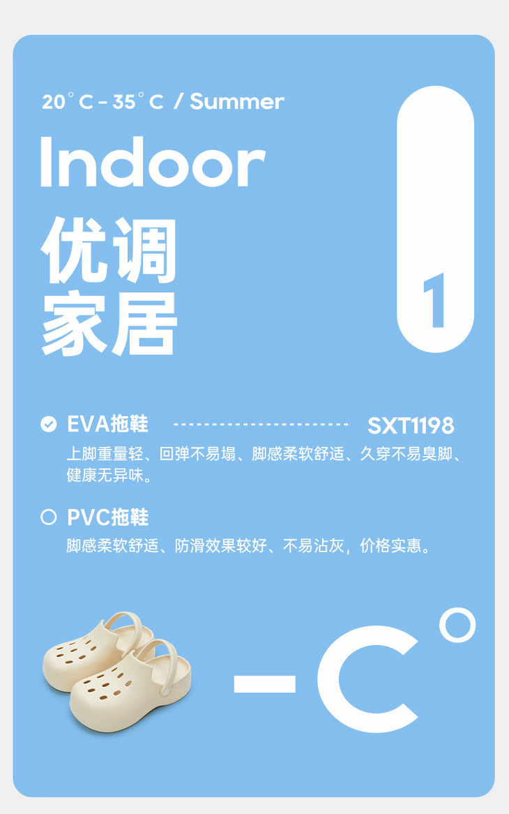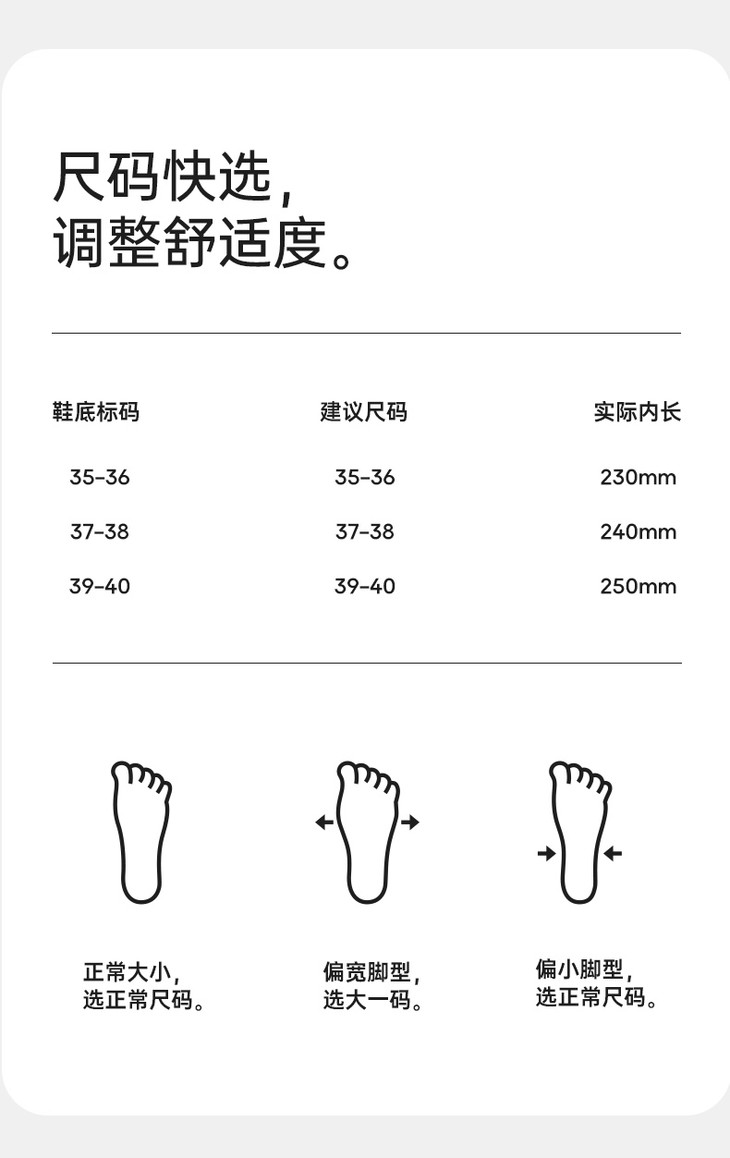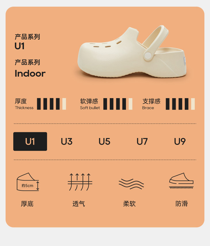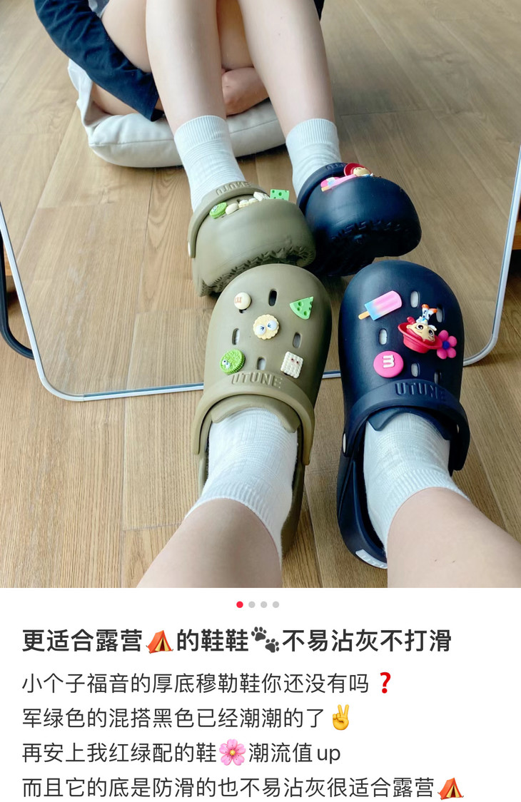 鞋子采用的是EVA材质,特别轻且弹,像是赤脚踩沙滩一样放松,走路完全不累。同时EVA材质的柔韧性也很好,用力弯折秒速回弹,久穿不变形不断底,一双能穿好几年。鞋底还采用了厚底设计,加高5cm,增高又显瘦;鞋床内里下沉,如小凹槽般包裹住双脚不易打滑;加深的轮胎面鞋底,为防滑更添一份力,外出穿它也很不错,就算去海边或小溪踩水都不会被小石子硌脚,也避免了滑倒的尴尬;清洗起来也很方便,用水一冲就干净,速干不留水,久穿不臭脚!